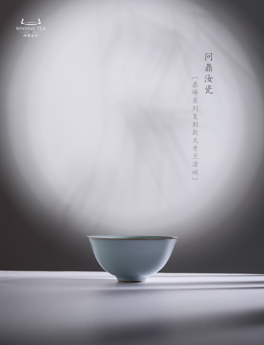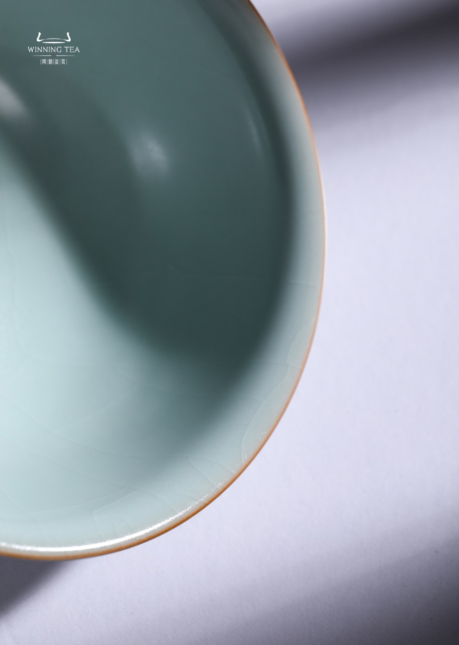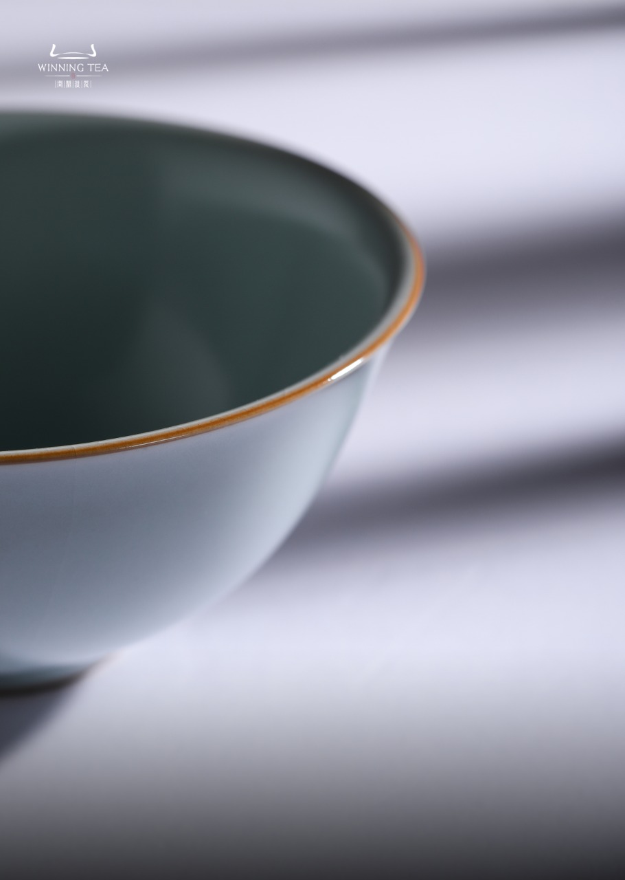 问鼎汝瓷鼎峰柴窑月白观月杯(梵红描金狮子绣球)