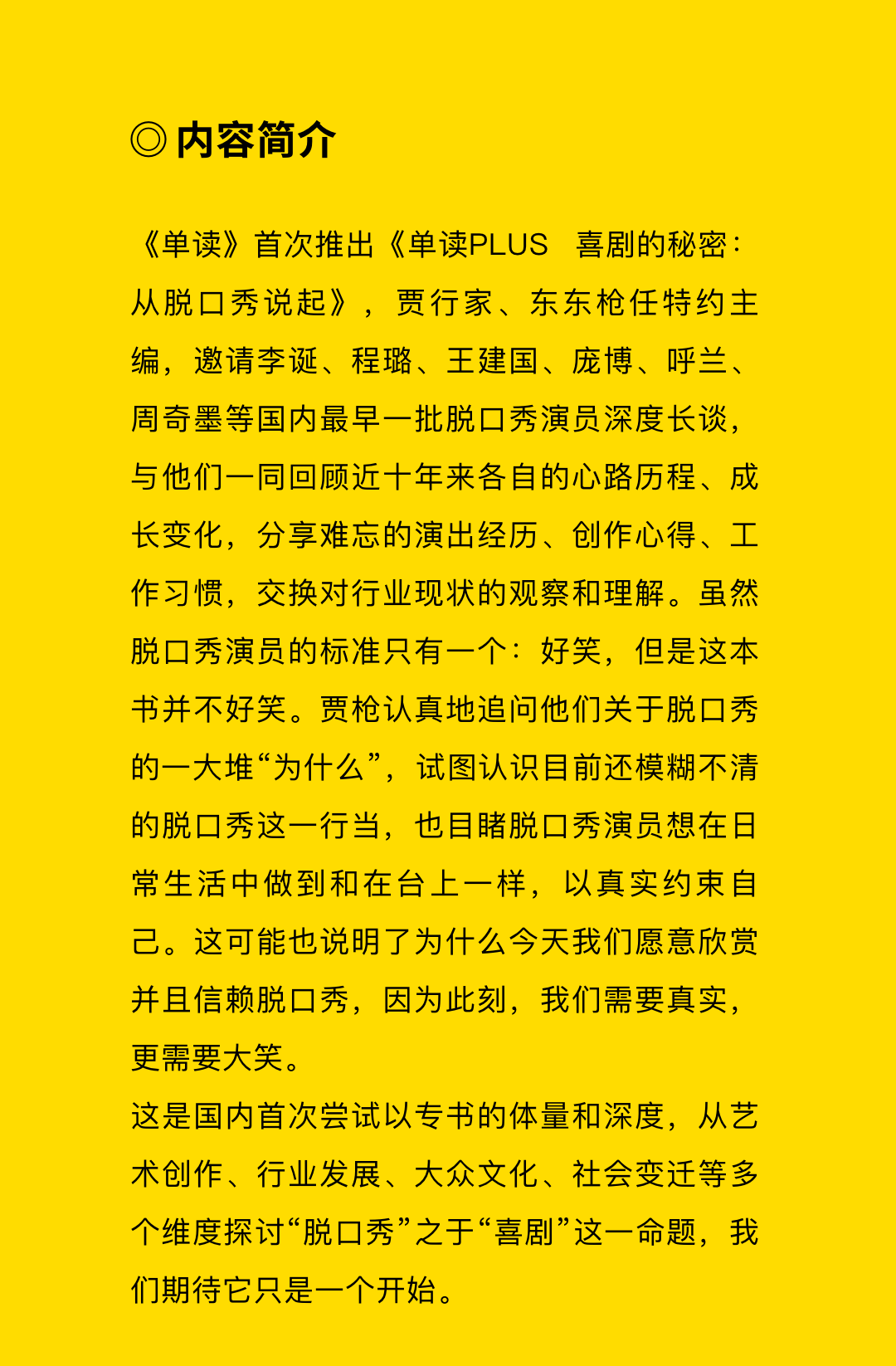 《单读》首次推出《单读PLUS 喜剧的秘密:从脱口秀说起》,贾行家、东东枪任特约主编,邀请李诞、程璐、王建国、庞博、呼兰、周奇墨等国内最早一批脱口秀演员深度长谈,与他们一同回顾近十年来各自的心路历程、成长变化,分享难忘的演出经历、创作心得、工作习惯,交换对行业现状的观察和理解。虽然脱口秀演员的标准只有一个:好笑,但是这本书并不好笑。贾枪认真地追问他们关于脱口秀的一大堆“为什么”,试图认识目前还模糊不清的脱口秀这一行当,也目睹脱口秀演员想在日常生活中做到和在台上一样,以真实约束自己。这可能也说明了为什么今天我们愿意欣赏并且信赖脱口秀,因为此刻,我们需要真实,更需要大笑。