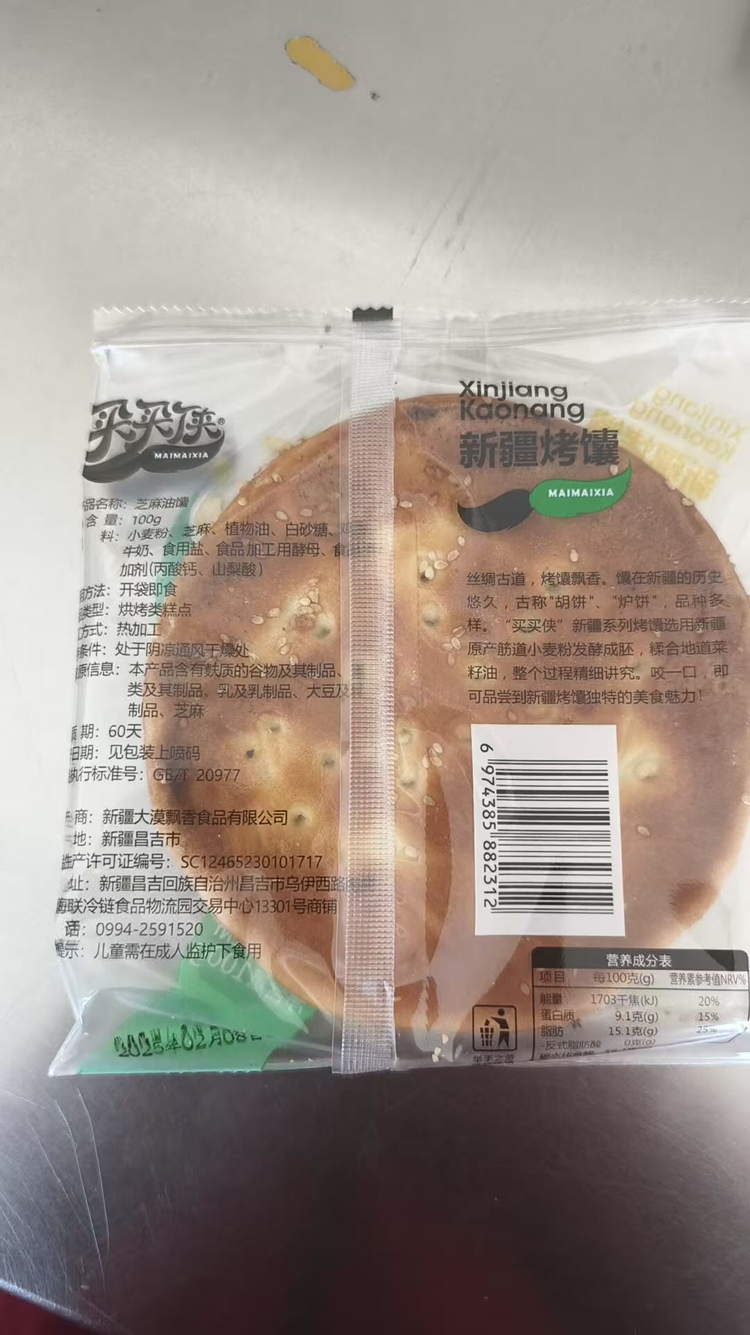 2、芝麻油馕:小麦粉、芝麻、植物油、白砂糖、鸡蛋、牛奶、食用盐、食品加工用酵母、食品添加剂(丙酸钙、山梨酸)