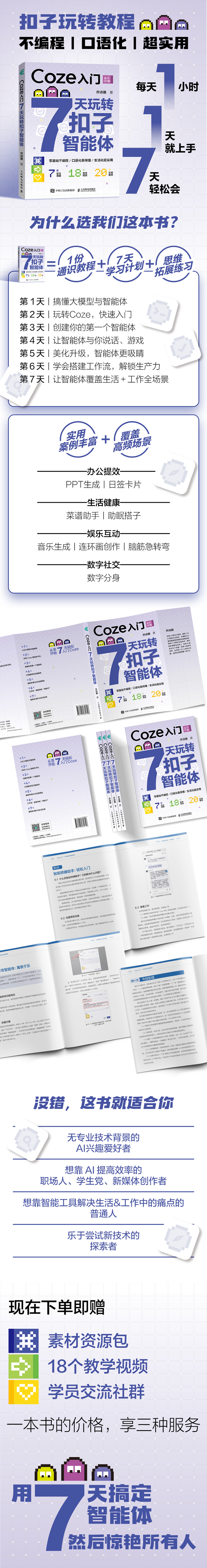 7 天速成体系:结构化学习计划,从 AI 入门到智能体创建全流程覆盖 无代码实操:截图 十 强调 十 视频三步引导,零基础也能轻松上手 全场景覆盖:20 个生活 / 工作实用案例,含智能体 十 工作流双重应用 多维度辅助:100 十 分钟视频教程 十 课后练习,降低学习门槛与试错成本 轻量化创作:支持多个平台分享推广,激发二次创作与创新思维