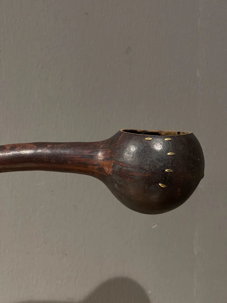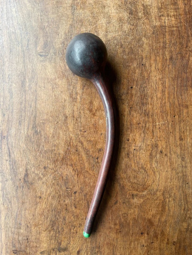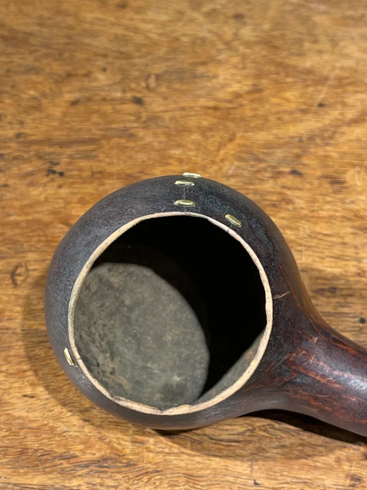 这是一件取材瓠瓜掏膛髹漆制作而成的茶道仪式中使用的茶勺,是日本煎茶式茶道仪式中的重要茶道具,茶人精心选取自然材质,随形稍加修饰后成型为氣质高雅的器具,形式简约却氣象万千,长年使用痕迹增添难以言喻的侘寂之美,此经典老茶勺是转转会女主人珍藏多年的日本江户时代珍品,因为有裂痕,经国内手工艺人以锔钉修补,并于把手末端加绿琉璃珠点缀,也是女主人数十年来用来勺水与摆设的精美旧物。此天然瓠瓜随形茶勺,结合自然材质与茶道文化的经典器物,如此优雅造型的瓠瓜茶道具非常少见,加上国内手艺人锔钉修补,颇有中日结合的趣味,如图所示,有一些老裂痕锔钉修护,以及细微表面磨损痕迹及落漆外,保存完好。尺寸:长:35厘米,勺口沿直径:5.5厘米,勺直径:7.1厘米,珠直径:1.3厘米,柄直径:1.4厘米~2.5厘米。重量:40克左右