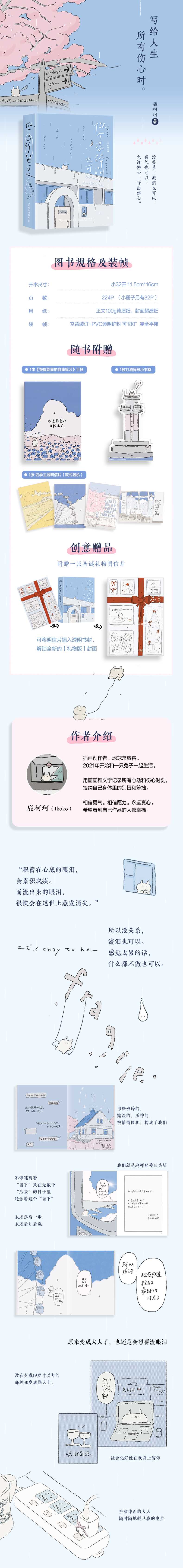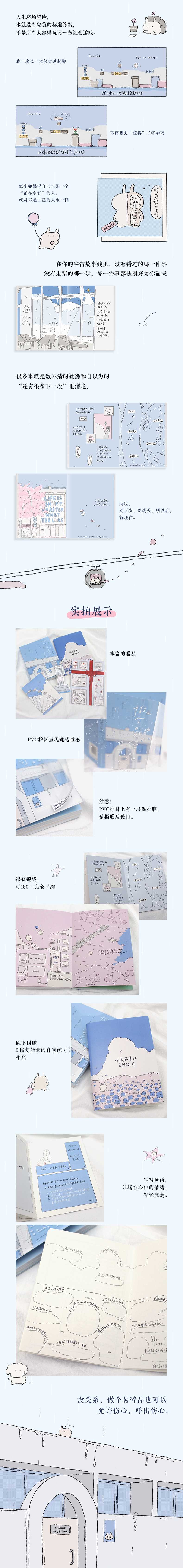 世界让你坚强,但你可以在这本书里,下一场雨。 【一本会下雨的书,透明封套times;蓝色主色调】 这本书的封套是透明的!书名和细细的雨丝就印在这层PVC护封上,像雨水划过玻璃,暗合;做个易碎品也可以的书名。 【16篇漫画日记,陪你进行一场;缓慢的自我修复。】 作者鹿柯珂像你身边最懂你的朋友,不说大道理,只用温柔的画和字,陪你走过四季。独树一帜的画风和手写字,读来如清风拂面,清新治愈。 【随书附赠一本可以;恢复能量的自我练习手册。??】 随书附赠的小册子叫《恢复能量的自我练习》,它不是用来收藏的,是用来写的!跟着提示写写画画,把堵在心口的;伤心真正地;呼出去。 【重磅加赠十限定福利】仪式感拉满的治愈;大礼包! 除了练习册,你还将随机收获1张四季主题明信片(4款盲抽,看你遇到哪个季节的自己)十 1个;灯塔书签。 特别附赠一张【礼物包装封面卡】,你可以把它插进透明护封里,瞬间DIY出一款特别的礼物包装版封面送出这本书,就想递出一份静心包装的礼物。既可以自己珍藏,又适合送给那个情绪敏感的朋友。