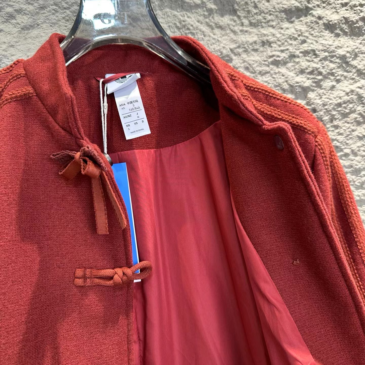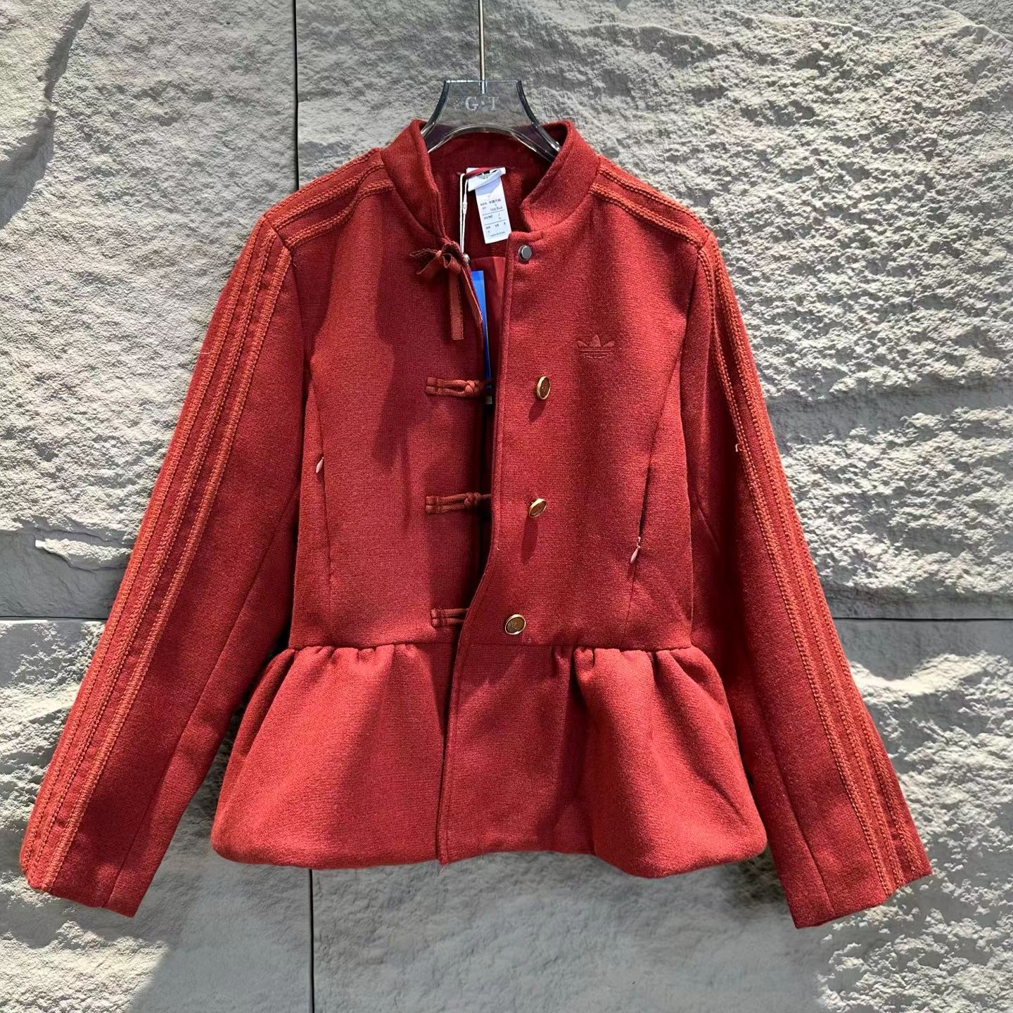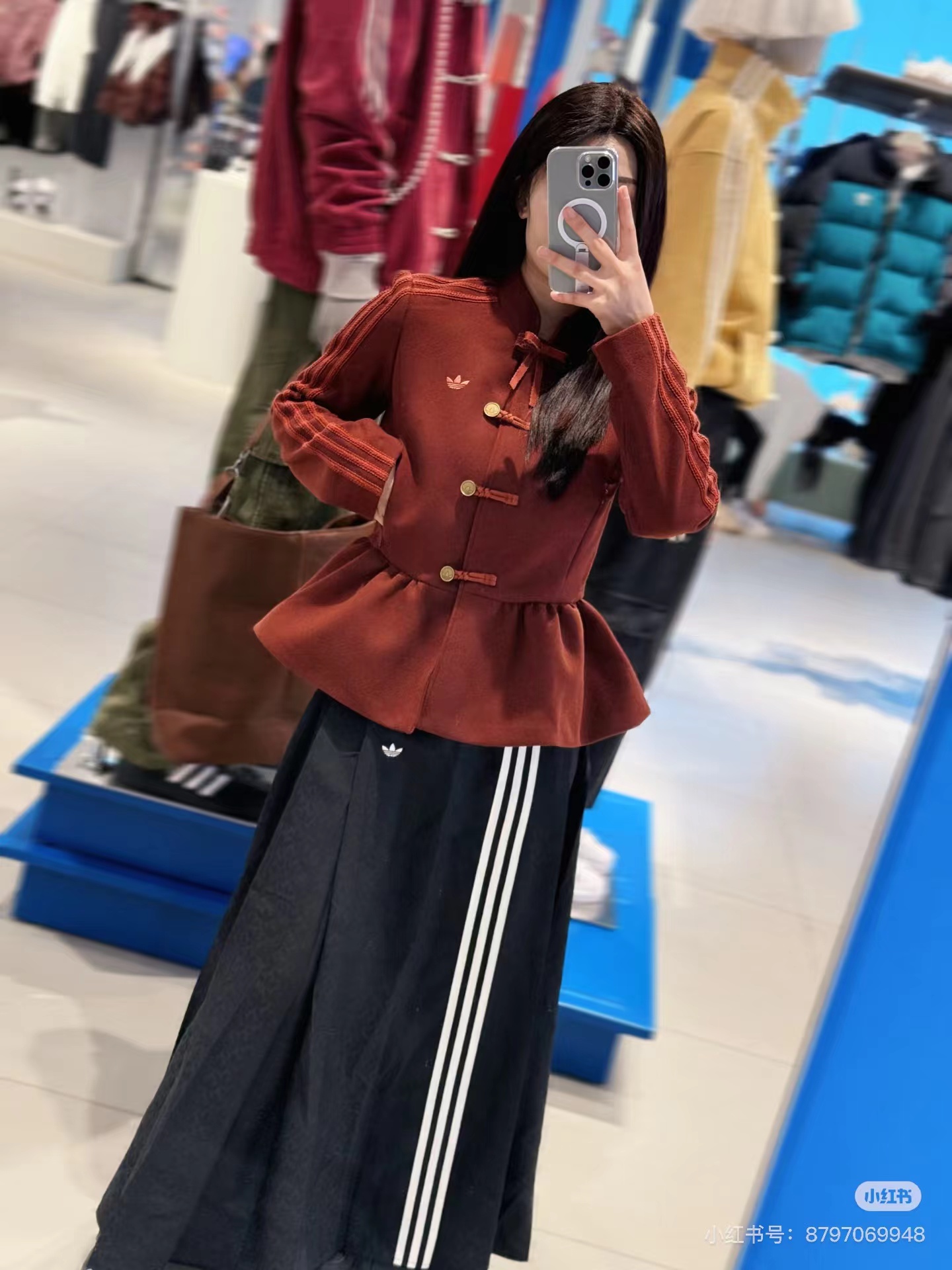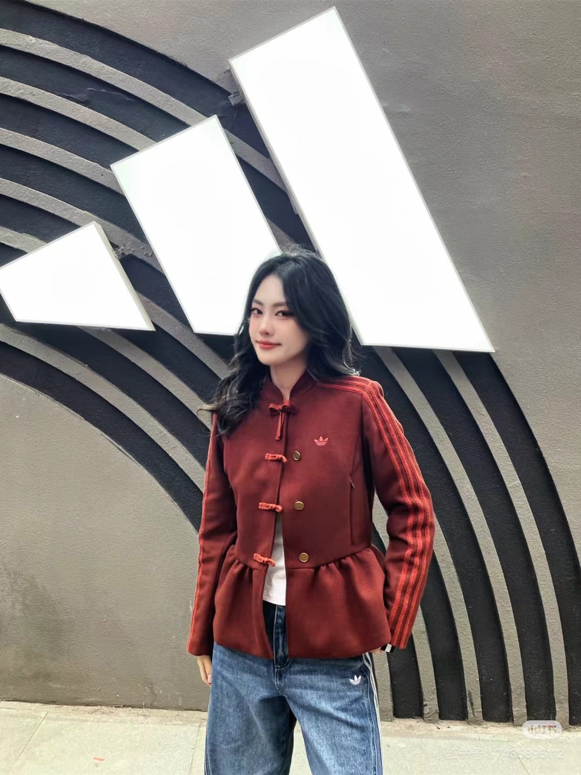 立领搭配盘扣元素,运动风的三条纹与柔美花苞裙摆碰撞。红运当头显气场,黑调冷艳,无论是新年聚会还是日常出街,轻松拿捏新中式氛围感,穿上它,马年一马当先,美得毫不费力。jing典中国红,藏黑沉稳大气,低调中透着gao级感。收腰花苞设计显瘦一绝,修饰身形,东方韵致,立领邂逅灵动盘扣,运动基因融入国风美学。利落剪裁勾勒曼妙曲线,柔软面料兼顾舒适与挺括。一件外套,两种风情,红黑双色解锁多元穿搭可能。新中式穿搭的天花板,非它莫属