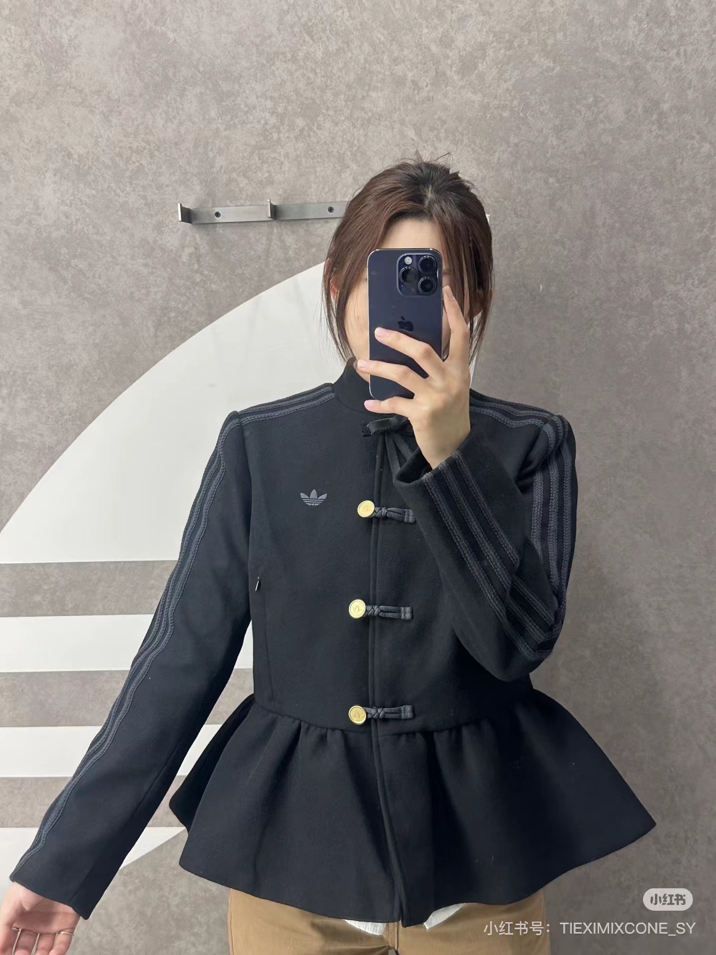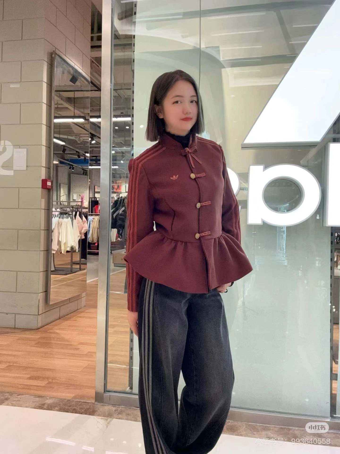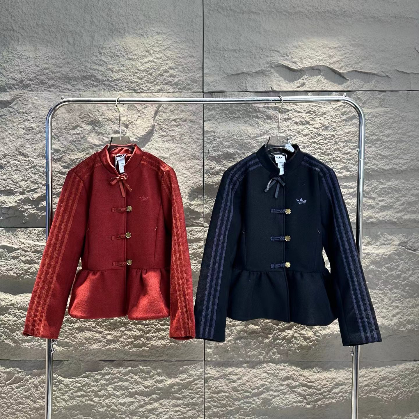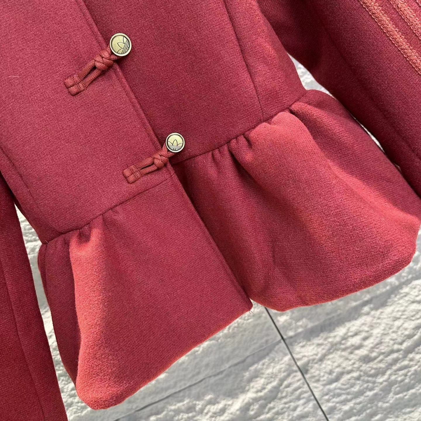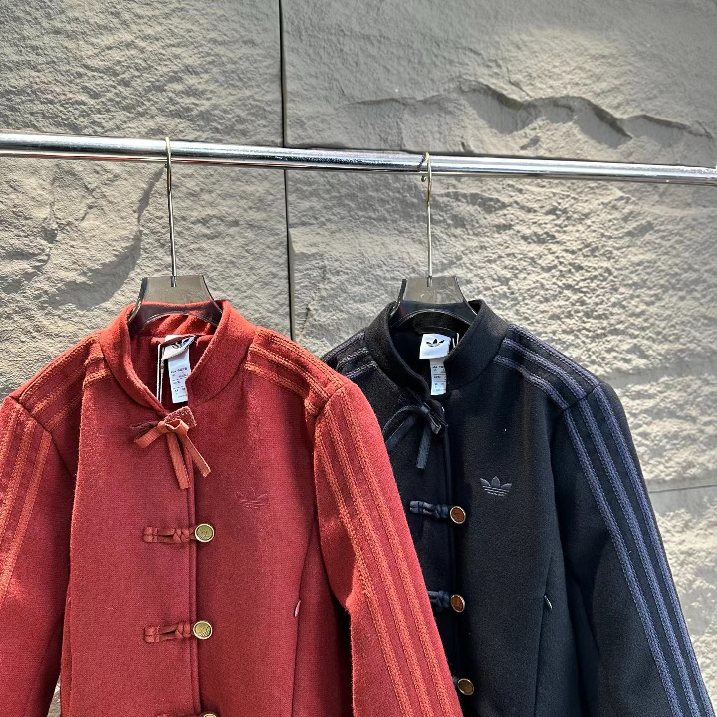 立领搭配盘扣元素,运动风的三条纹与柔美花苞裙摆碰撞。红运当头显气场,黑调冷艳,无论是新年聚会还是日常出街,轻松拿捏新中式氛围感,穿上它,马年一马当先,美得毫不费力。jing典中国红,藏黑沉稳大气,低调中透着gao级感。收腰花苞设计显瘦一绝,修饰身形,东方韵致,立领邂逅灵动盘扣,运动基因融入国风美学。利落剪裁勾勒曼妙曲线,柔软面料兼顾舒适与挺括。一件外套,两种风情,红黑双色解锁多元穿搭可能。新中式穿搭的天花板,非它莫属