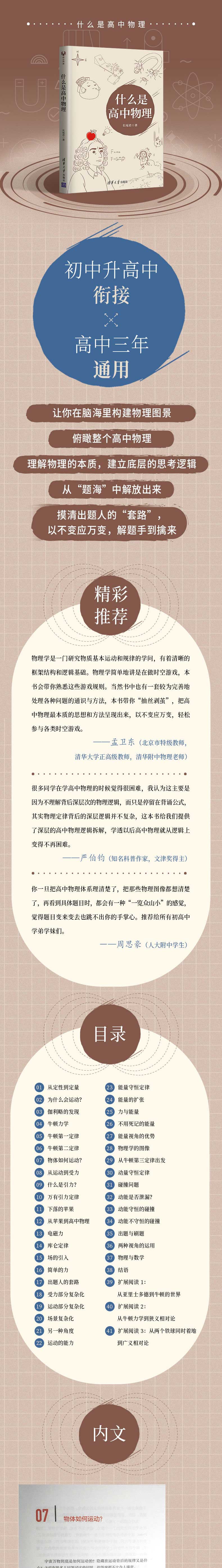 几乎囊括了高中物理的有知识点,流畅而有趣地讲述这些内容的来龙去脉,并以一个清晰的脉络串起来,帮你在脑海里构建物理图景,让你登高望远、俯瞰整个高中物理,产生居高临下之感。