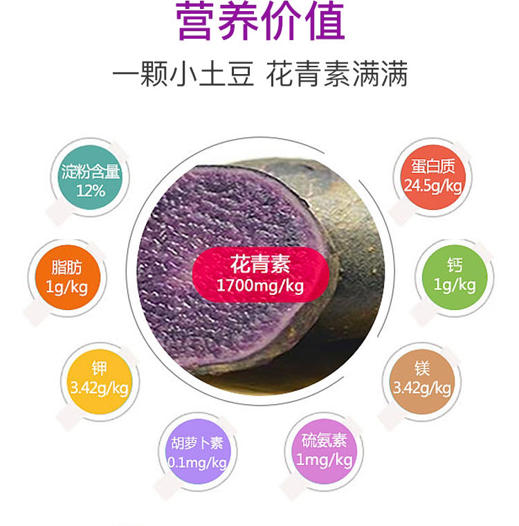 它是马铃薯中的贵族。 它是不经改良2000米以上高海拔老品种,是花青素之王,口感粉糯,土豆味浓