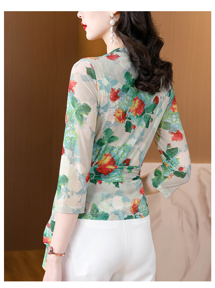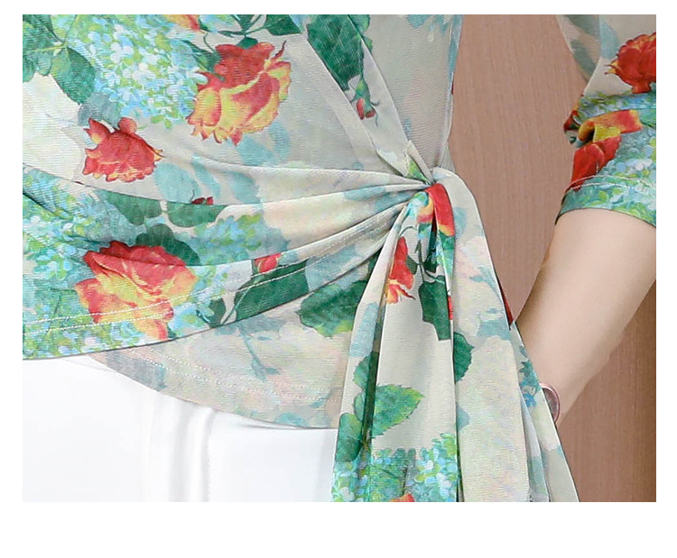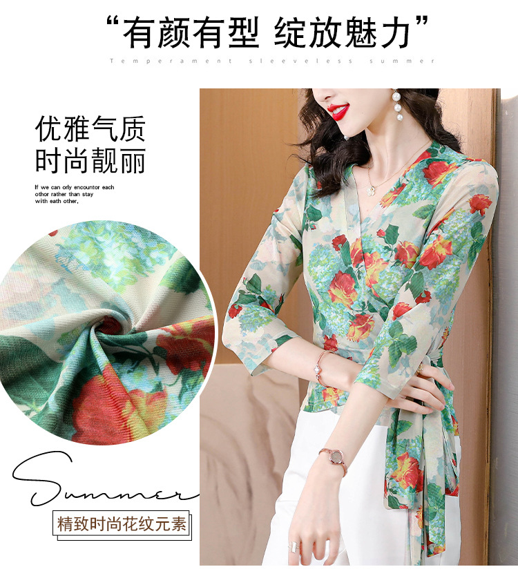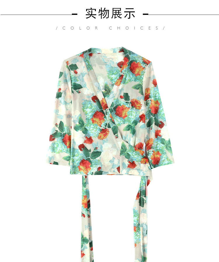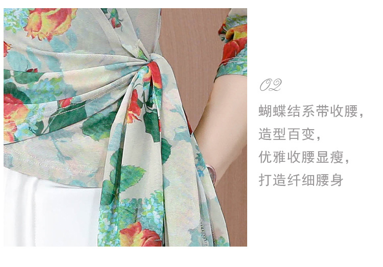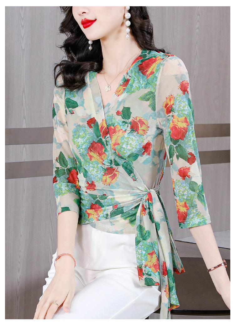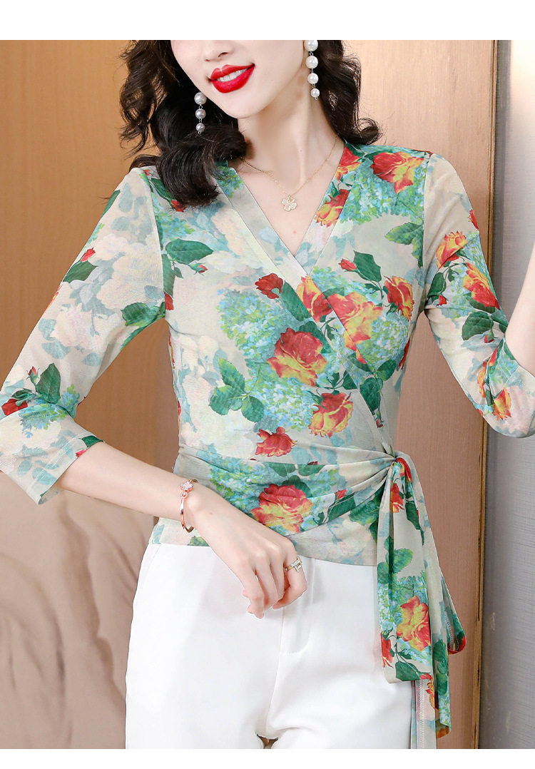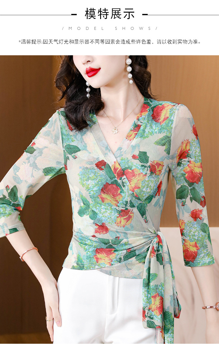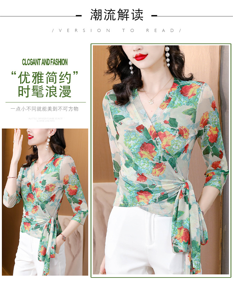 秋季V领修身显瘦印花蕾丝衫通勤甜美宽松型系带上衣K-D46M313