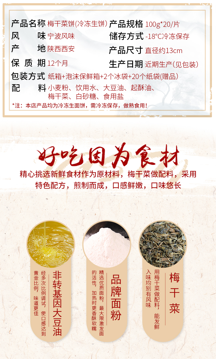 【产品规格】葱油饼、梅干菜饼、双拼 100g*20片。如购买多件分多个包裹发出,可能会前后陆续到货。