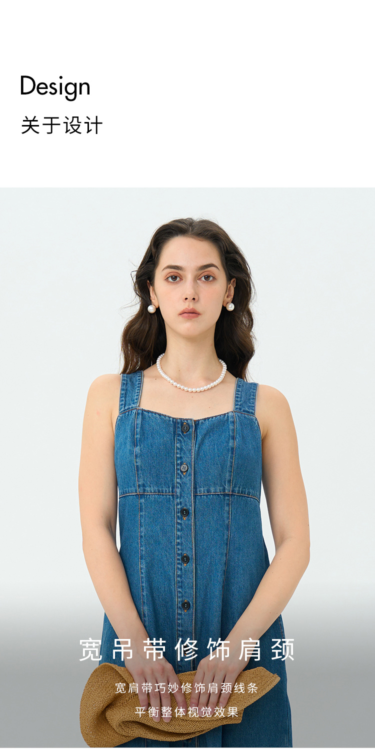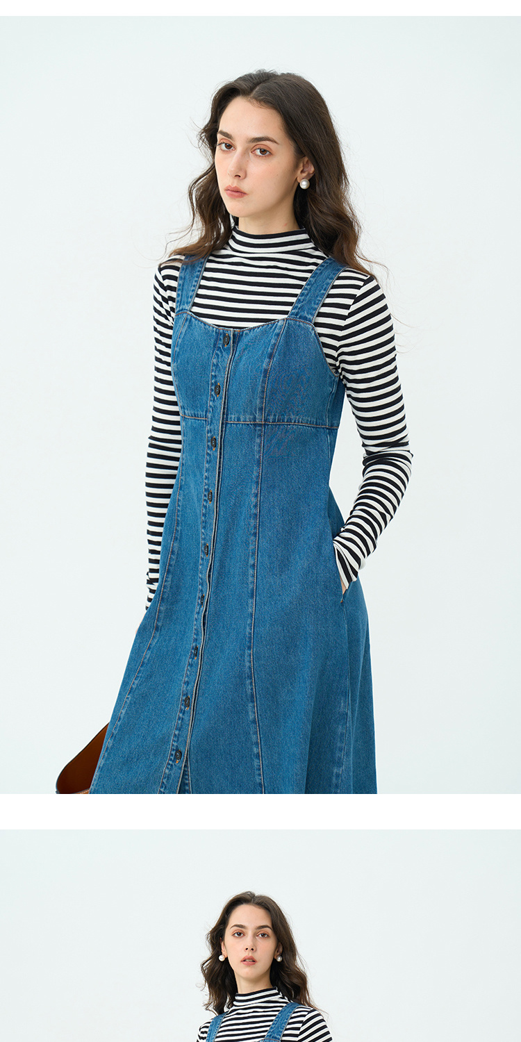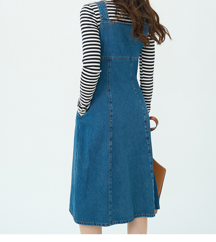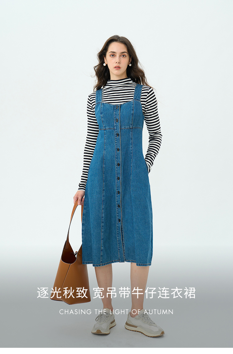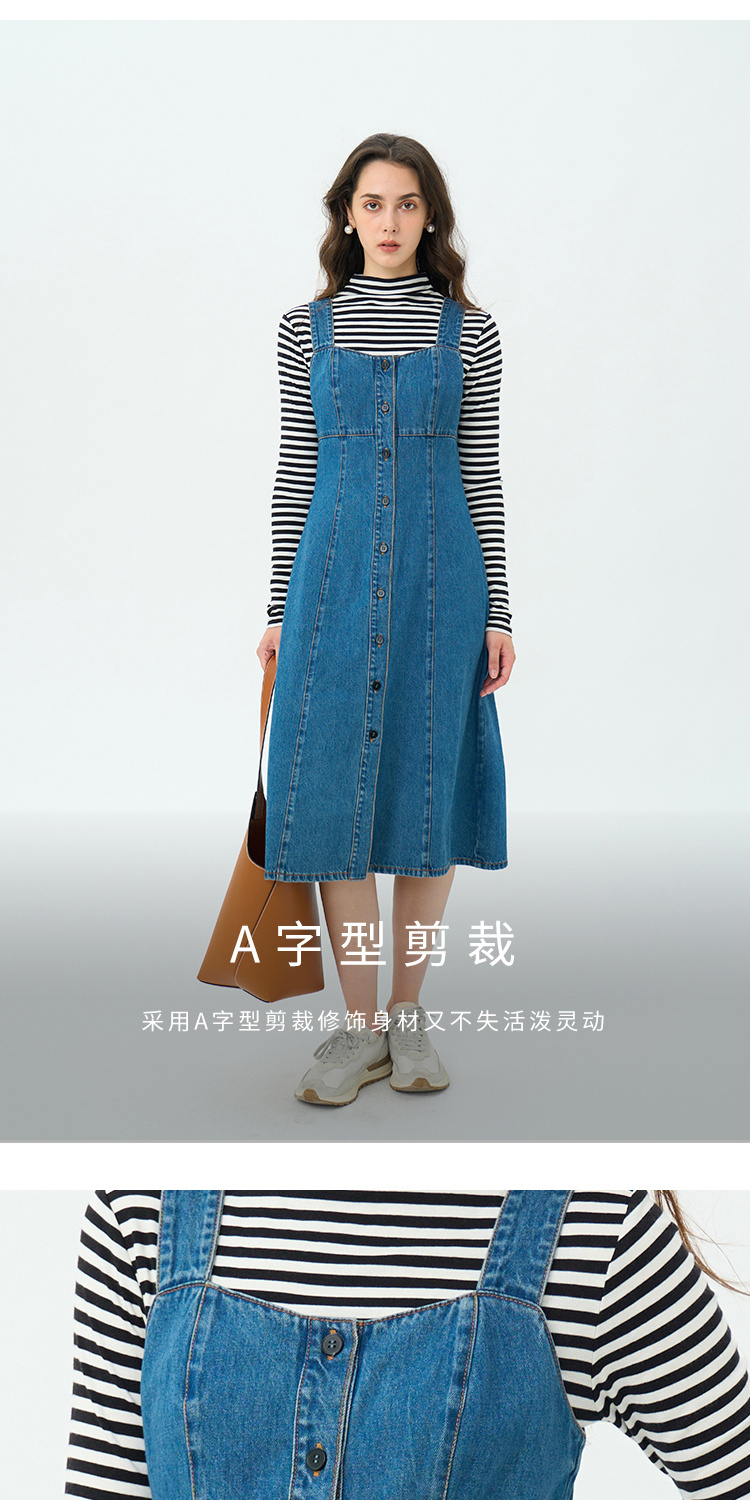 Heydress复古牛仔背带裙女春秋宽肩带A摆合体收腰时尚百搭连衣裙