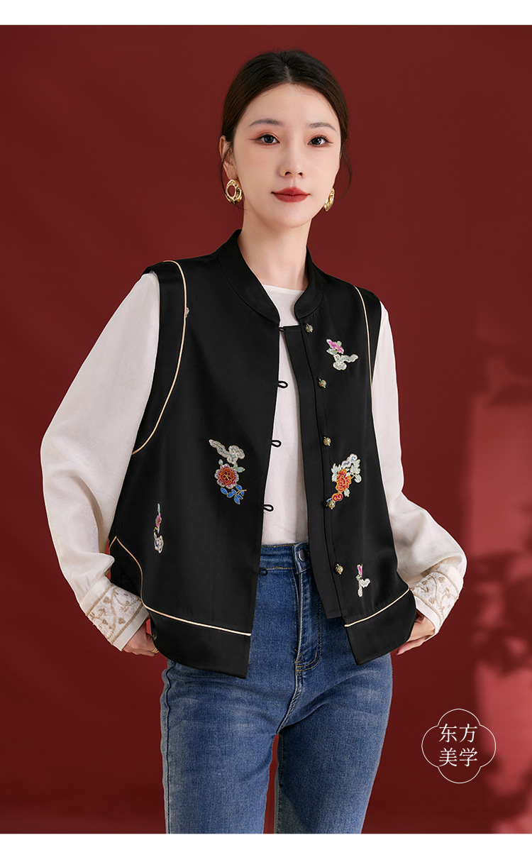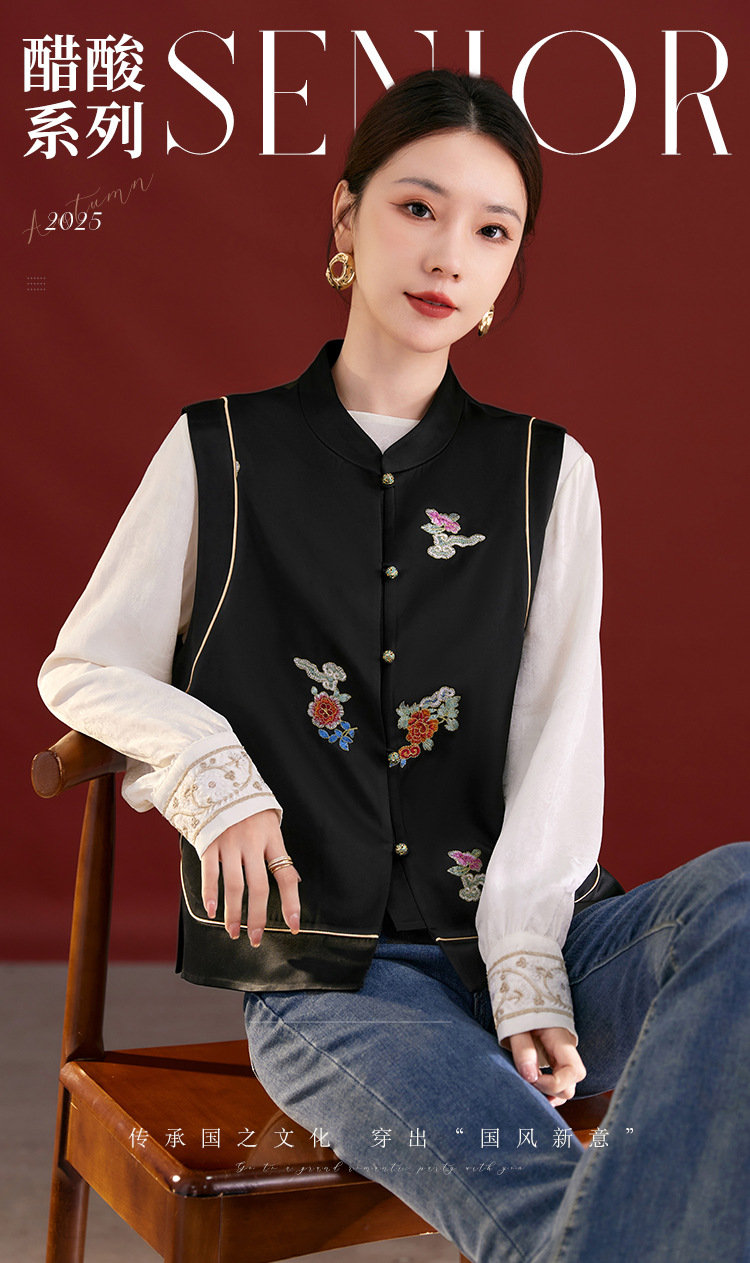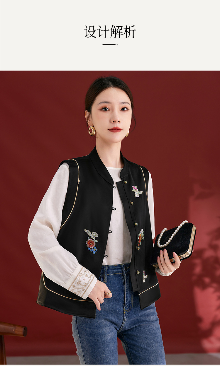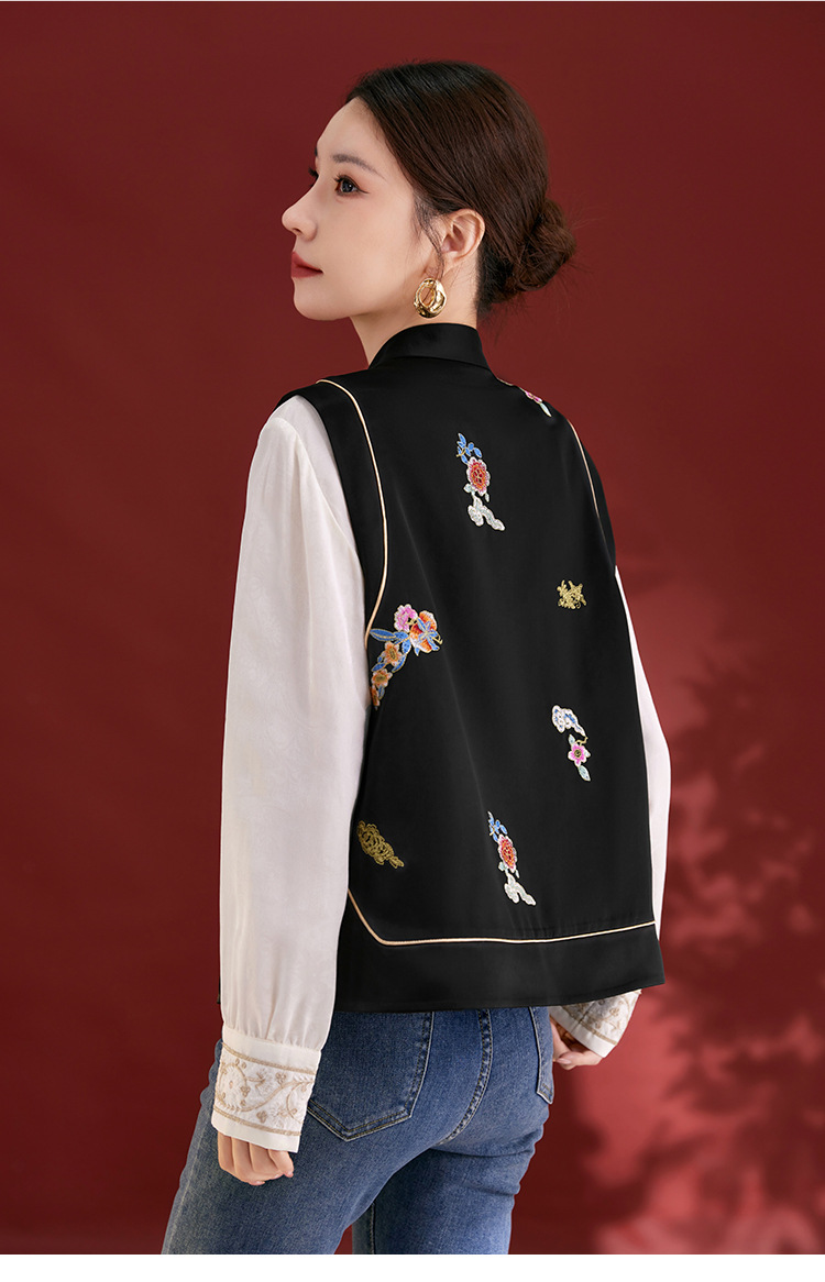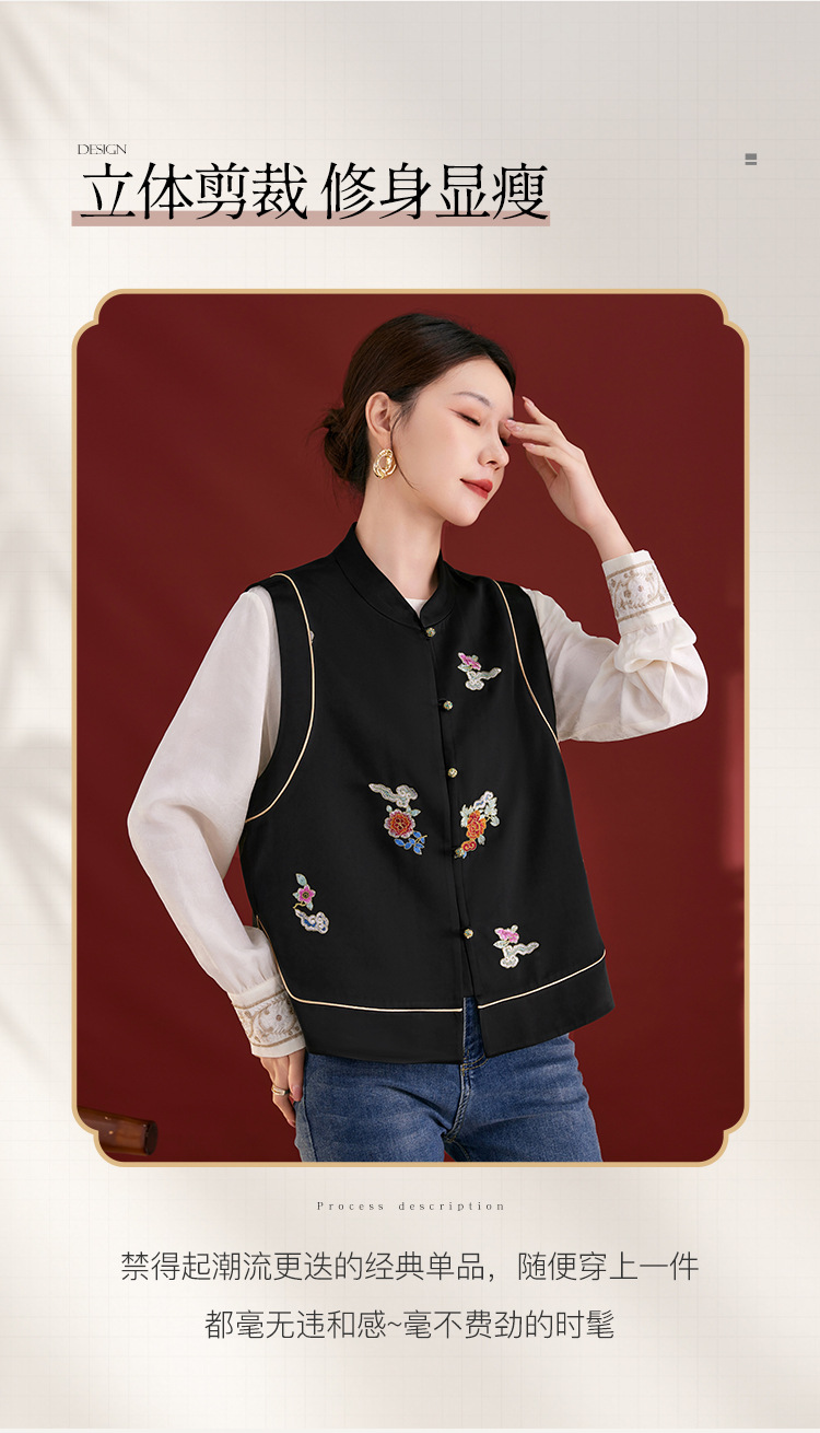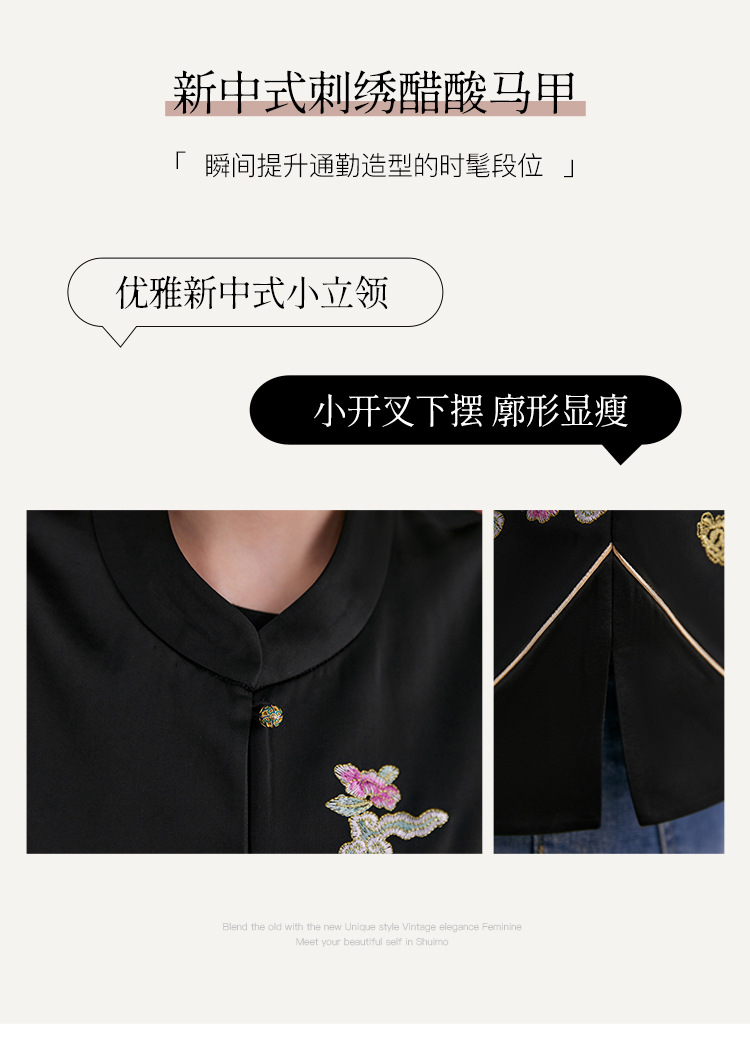QS源头工厂秋季新款醋酸提花压皱面料重工刺绣马甲女新中式国风2367