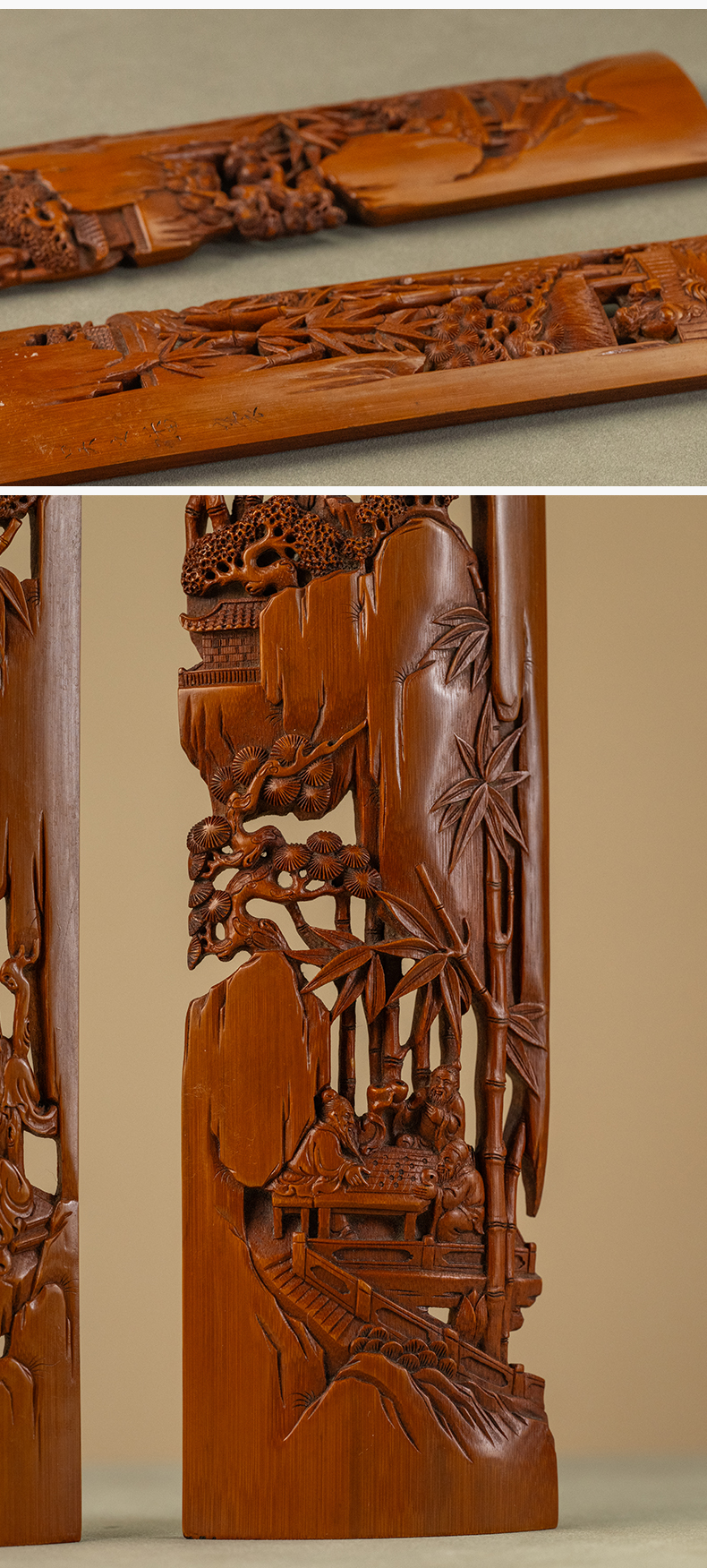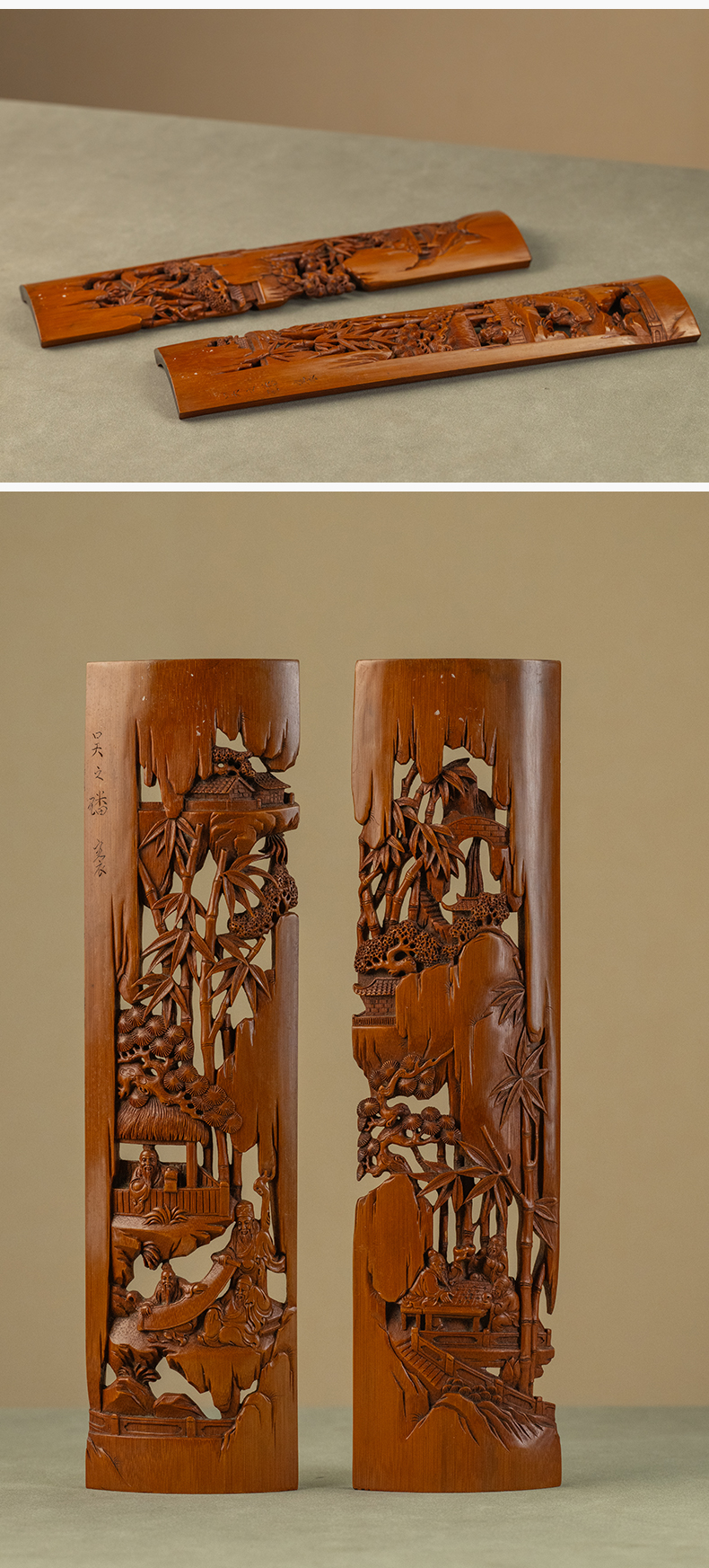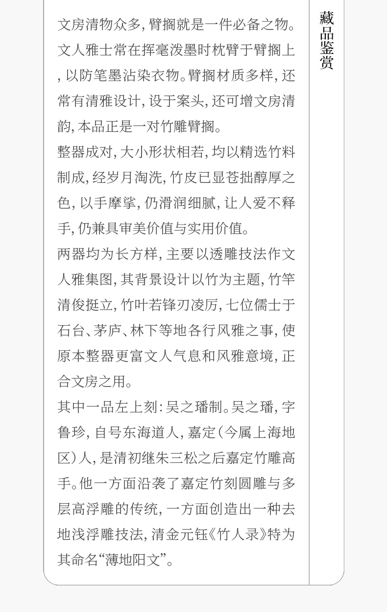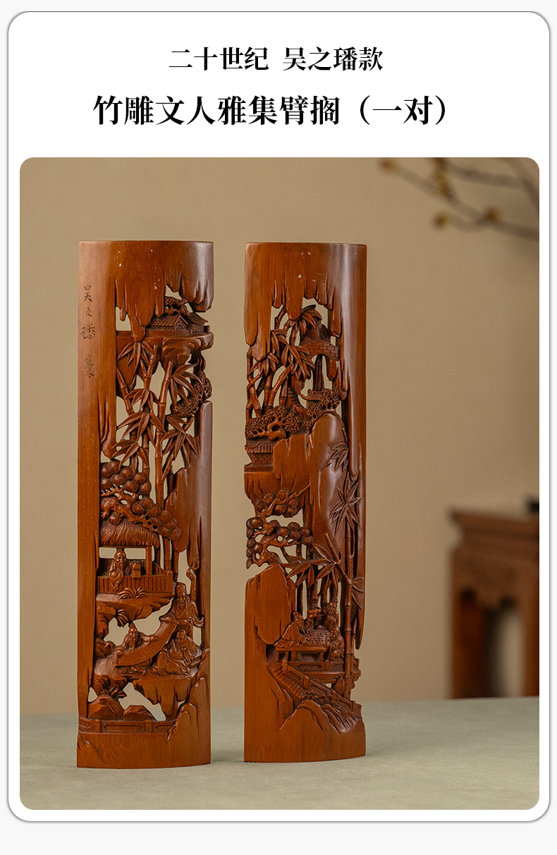 二十世纪 吴之璠款竹雕文人雅集臂搁(一对)