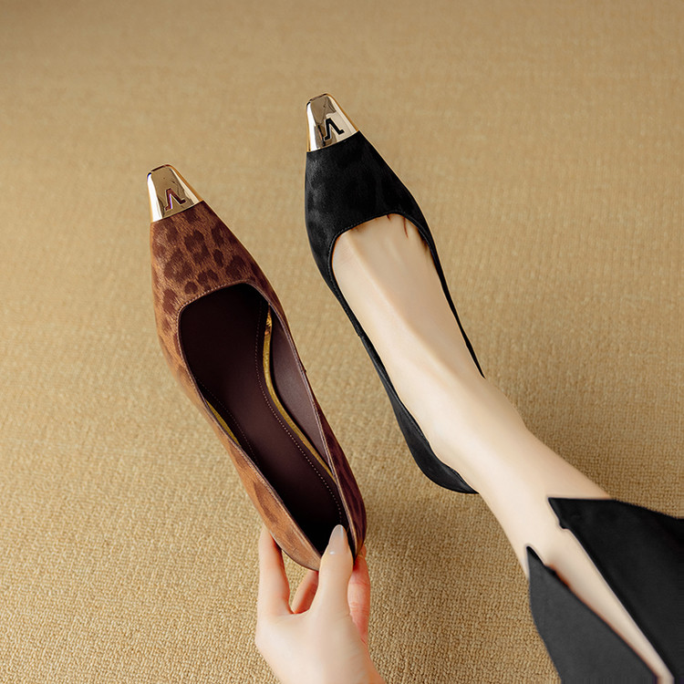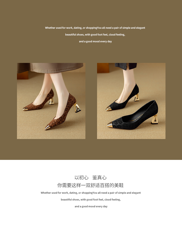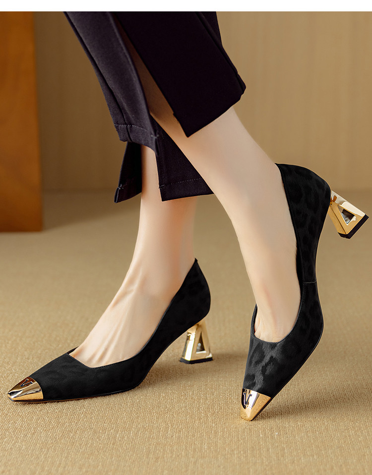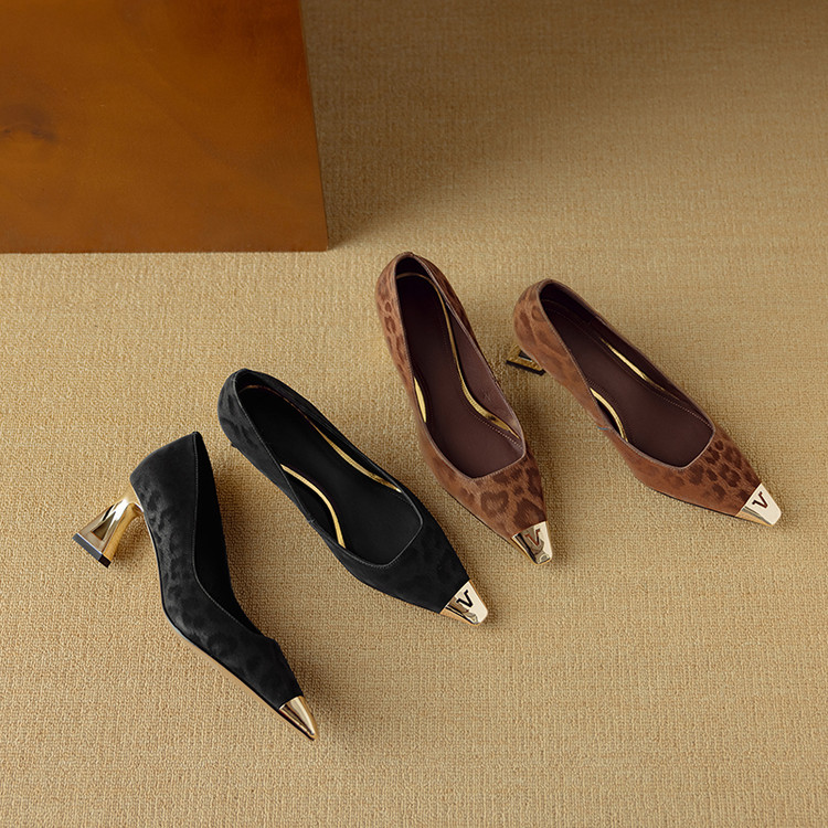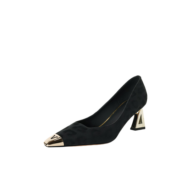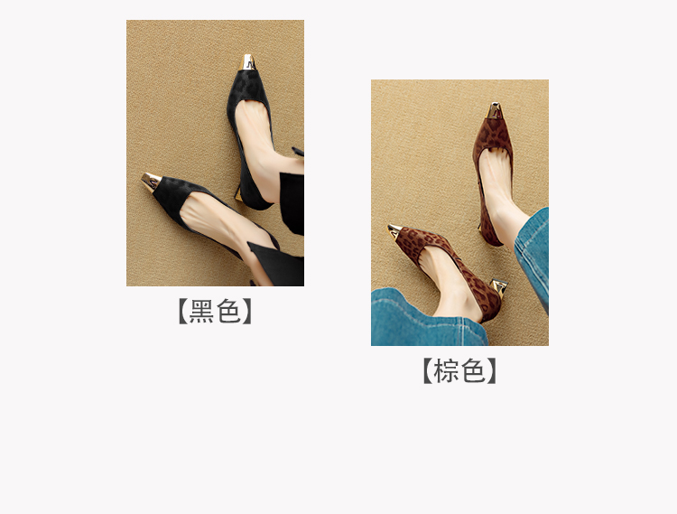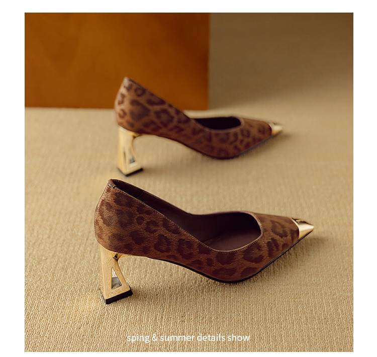 【预售5天】春新款豹纹羊皮金属方头显瘦高跟鞋一脚蹬气质辣妈单鞋女DB&M6158