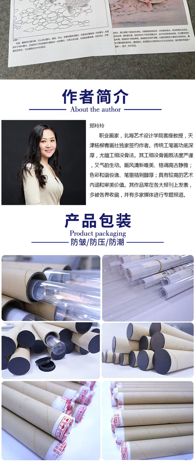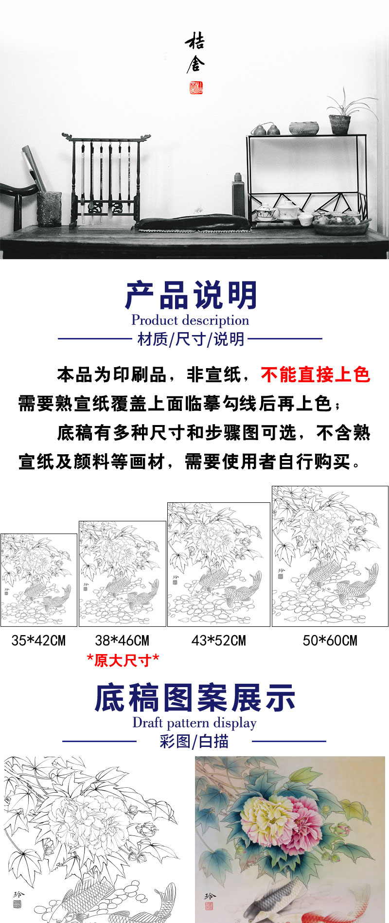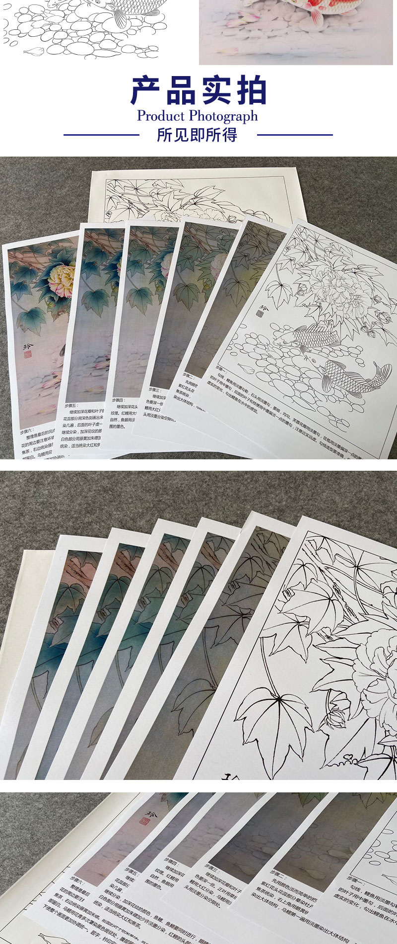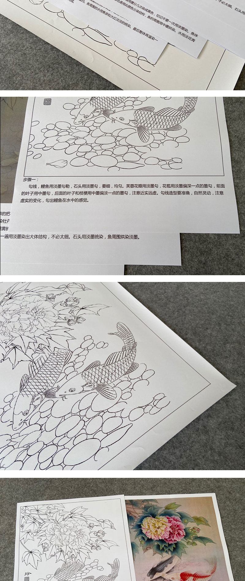 【有步骤、大彩图】郑玲玲工笔画白描底稿《荣华富贵》鲤鱼芙蓉图初学者临摹花鸟线稿ZL43