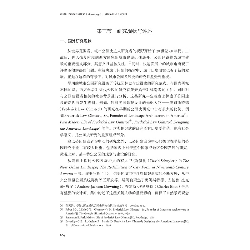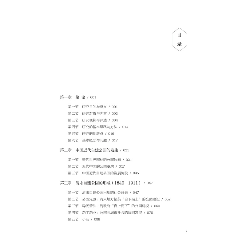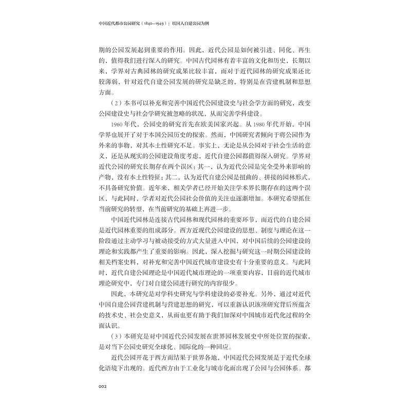 中国城市的近代化过程时间短、速度快、涉及面广、影响因素错综复杂。都市公园发展与城市发展紧密相关,因此,研究中国近代都市公园既要考虑公园本身,包括近代中国地域范围内的各种类型的都市公园及其特征,也要考虑中国近代城市社会发展的影响。也就是说,中国近代都市公园研究不仅仅是指作为城市近代化发展结果的公园,更在于其营建活动的全过程。本书通过对1840年到1949年间,中国都市公园发生与演变过程的研究,探讨这一时期内,不同阶段都市公园发展的政治、经济、社会、文化影响因素,明确不同阶段都市公园的发生机制,造园观念与实践的发展规律与特征。