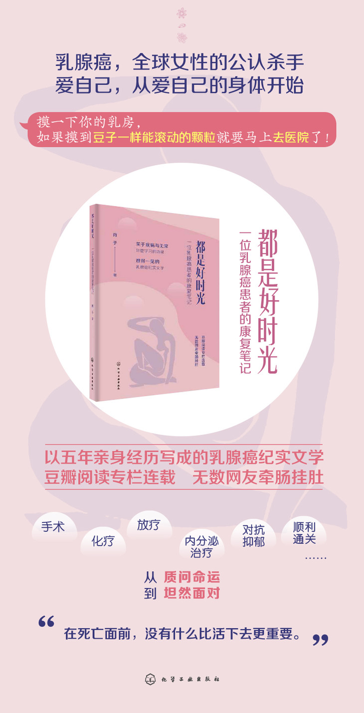 这本书,记录了我从得知生病,到手术、化疗、放疗、内分泌治疗、对抗抑郁、回归生活的全过程。