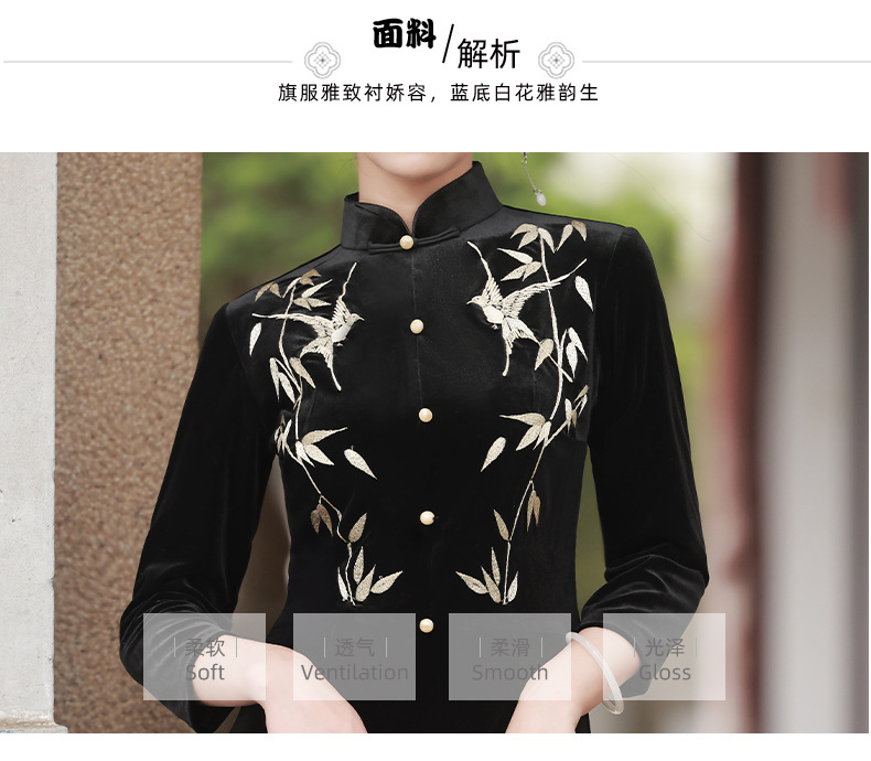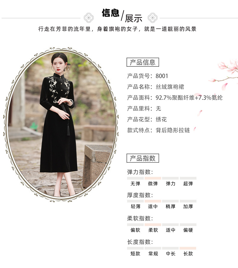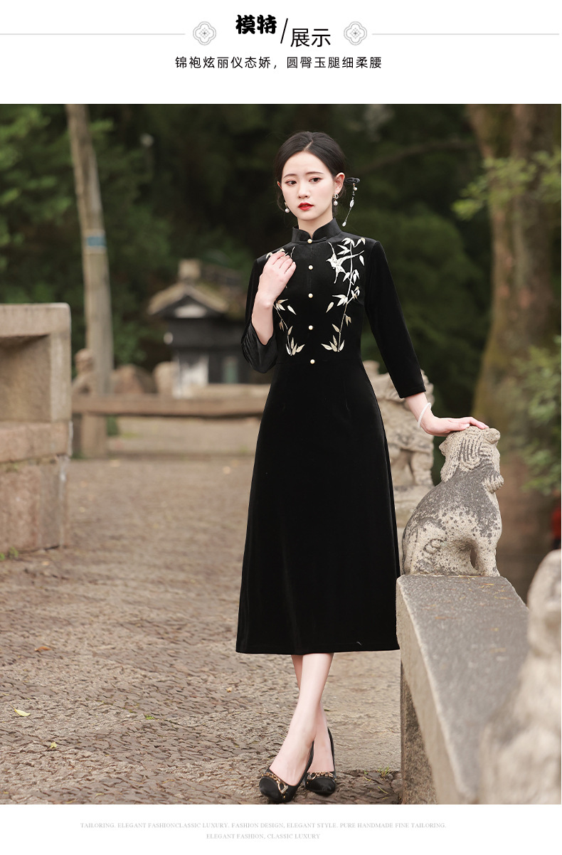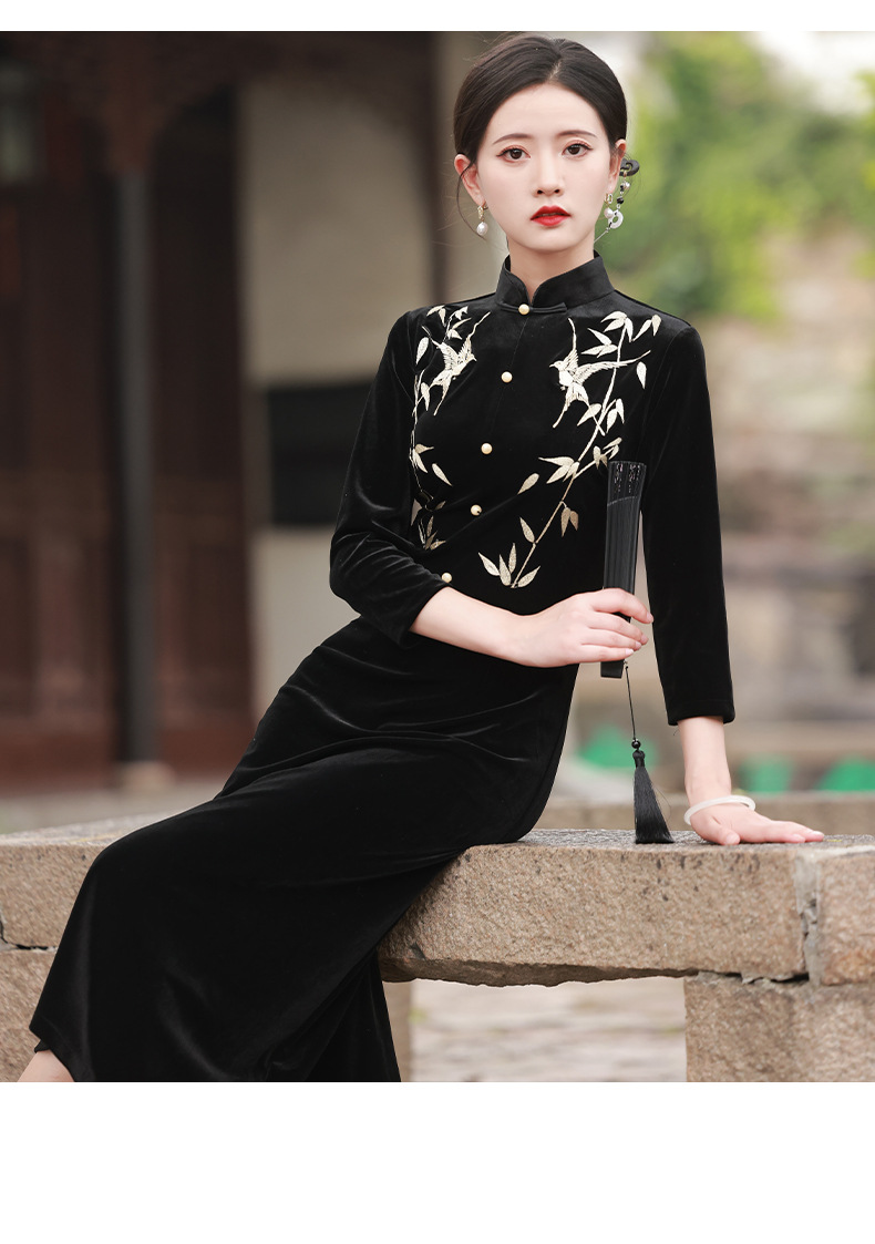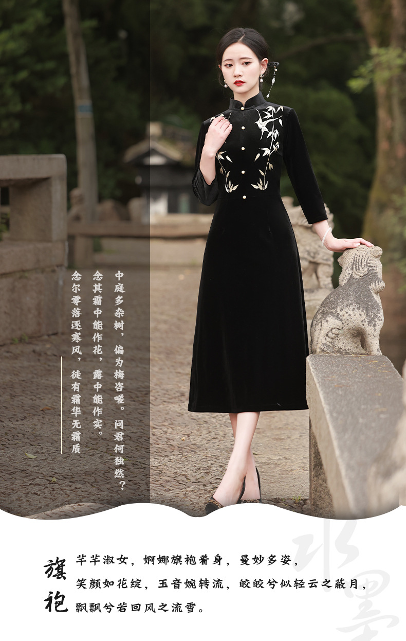 BJS-8001改良复古丝绒旗袍长款 秋季新款气质民国风绣花丝绒旗袍裙8001