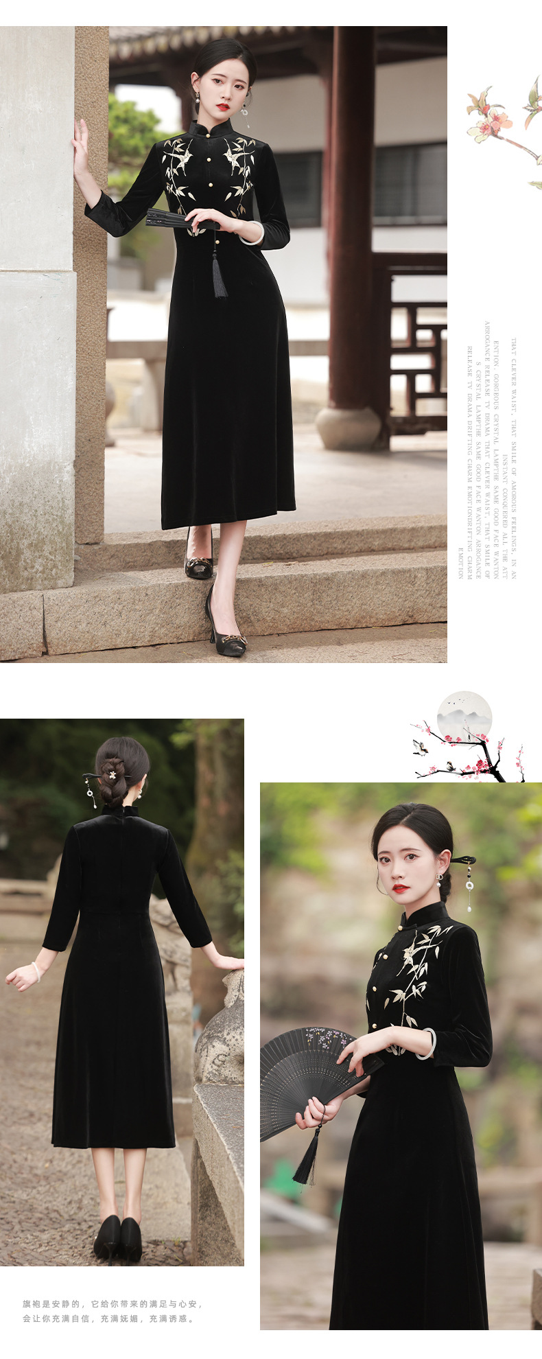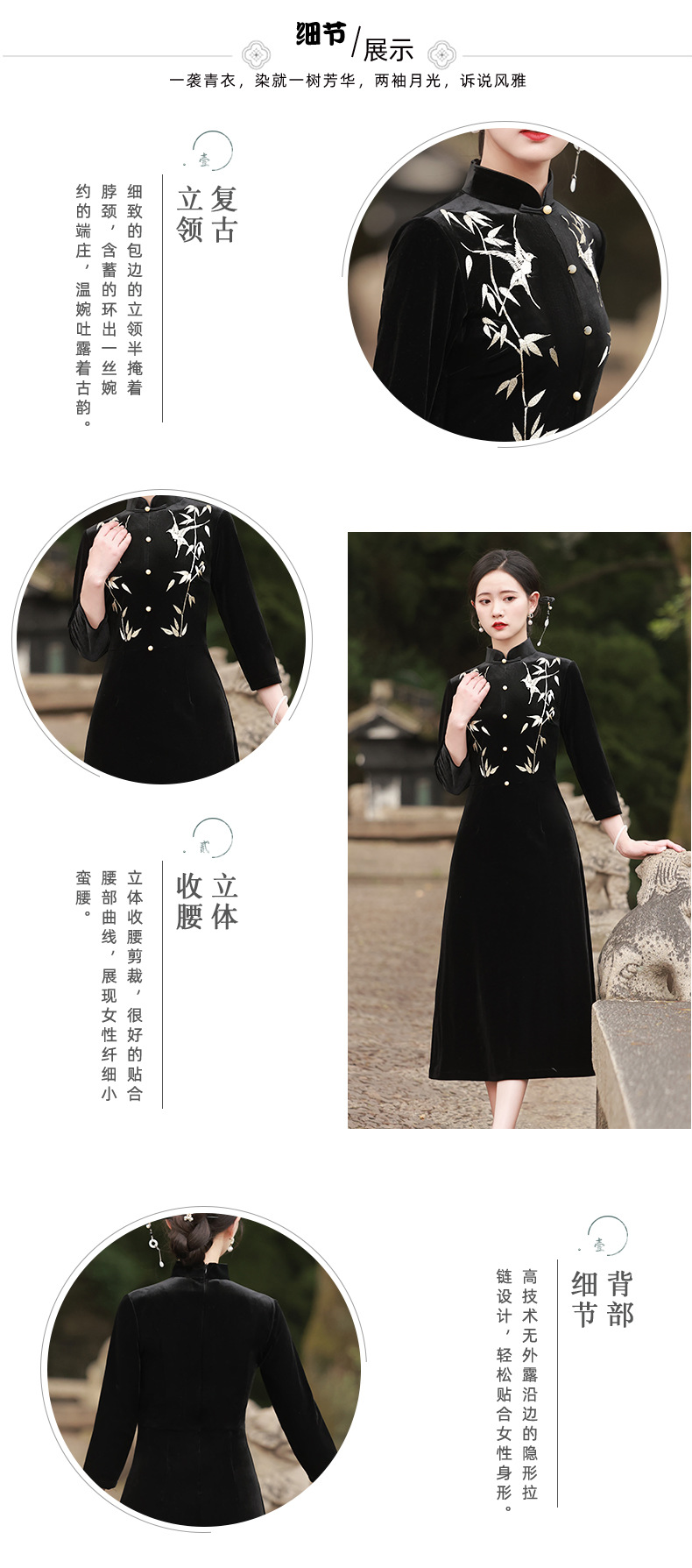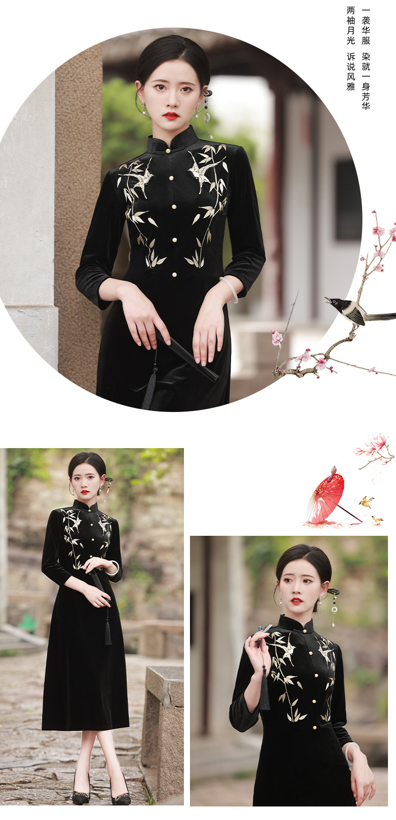 BJS-8001改良复古丝绒旗袍长款 秋季新款气质民国风绣花丝绒旗袍裙8001
