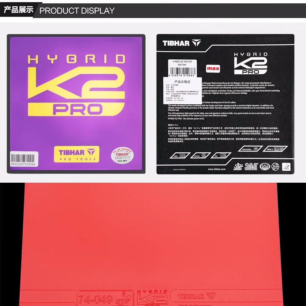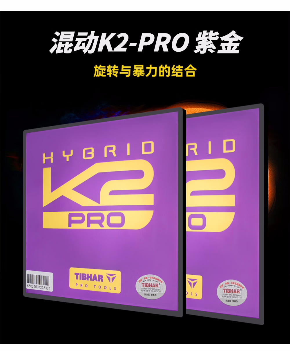 挺拔官方描述:K系列产品的又一力作,混动“K2-Pro”是遵循原有产品优质工艺,在技术性能上保持优秀血统和延续性,进一步发展的K2粘性套胶。新开发的胶面与更扎实、更快速的挺拔海绵工艺相结合。进攻时进一步体现了,威力和稳定的制造弧线能力,同时也为攻守平衡提供了更高的动态灵敏度。此外,预制内能增弹海绵工艺,搭配几何图形的橡胶颗粒技术,在保持极大粘性的同时,更好的释放了“K2-Pro”的优异特性!