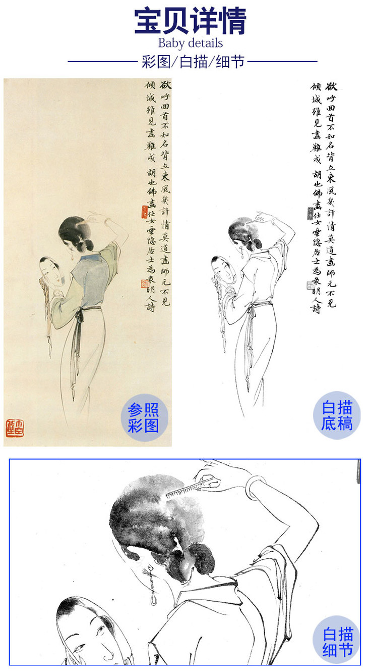 胡也佛竖幅工笔传统仕女人物白描底稿-《理鬓图》-多种白描尺寸可选-HY24