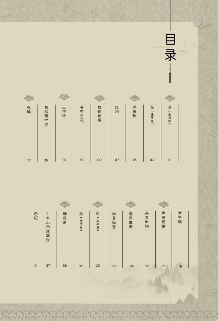 本书以直观的四线谱形式呈现中华小四弦的伴奏,以简谱形式呈现歌曲旋律,书中选用的作品从古老的《诗经》《楚辞》到唐诗、宋词;从朗朗上口的《三字经》到蕴含声律格律的《声律启蒙》,无一不在展现国人的浪漫情怀以及优秀文化底蕴。书中所选作品实践性与操作性极强,在教师的引导下,学生不仅能很好地完成作品,还能让学生们爱上音乐、爱上古诗文,能让师生共同挖掘我国优秀传统文化的深层价值。