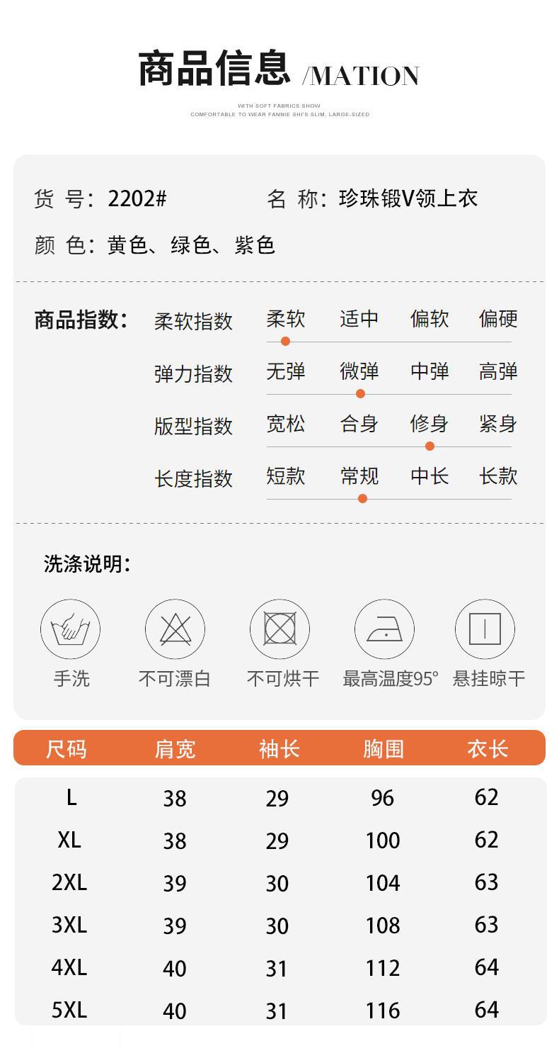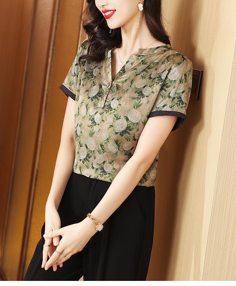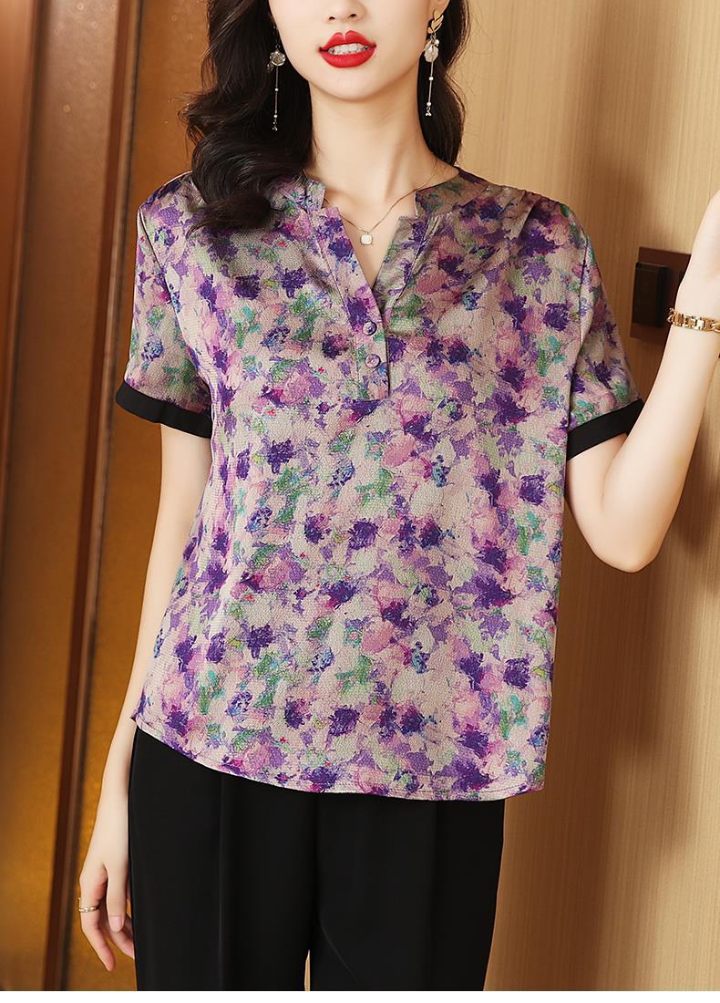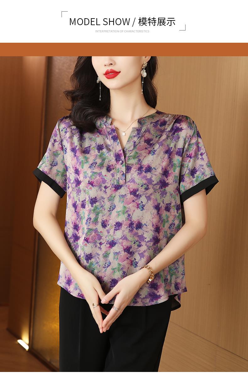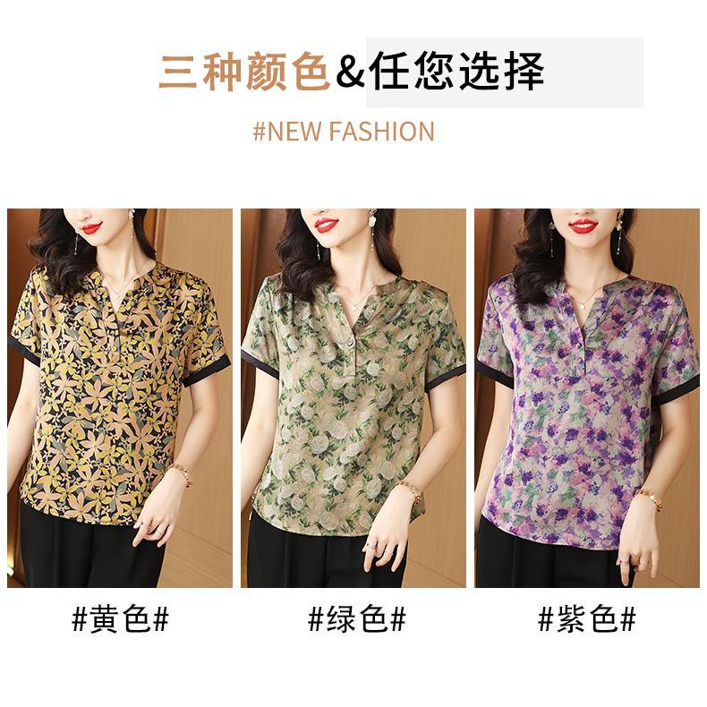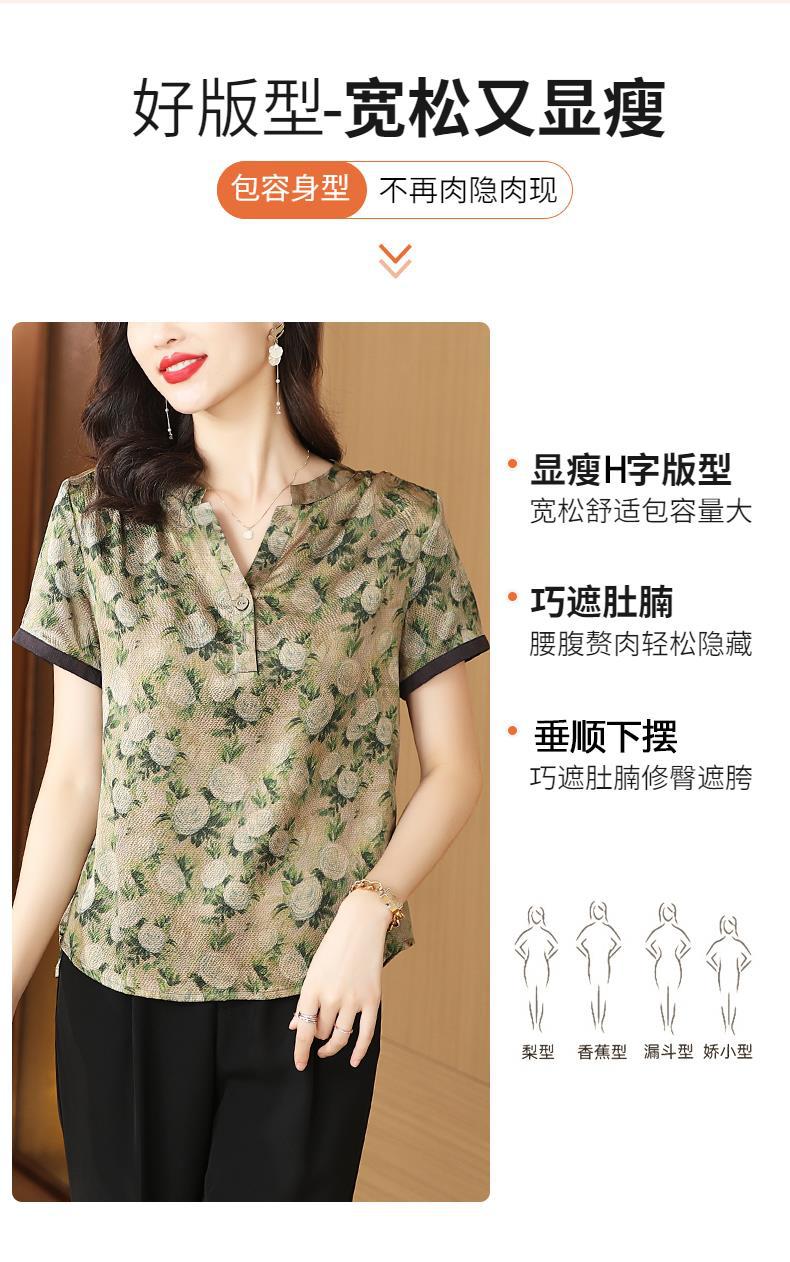 KQL 422H2202珍珠缎小V领T恤气质妈妈碎花上衣