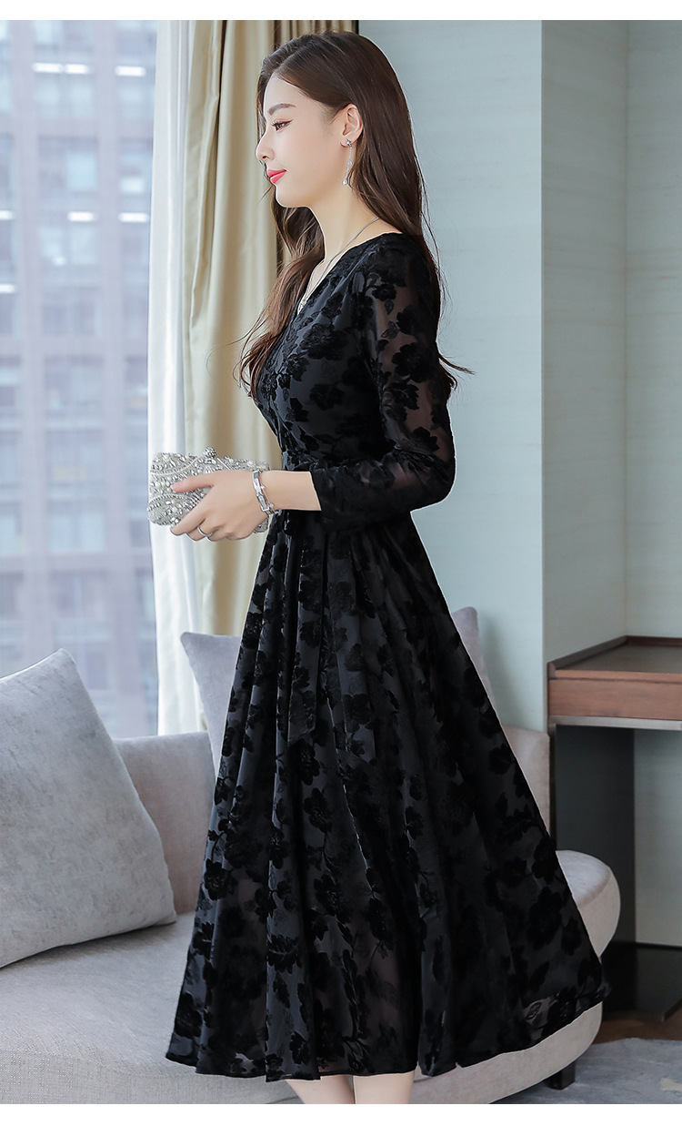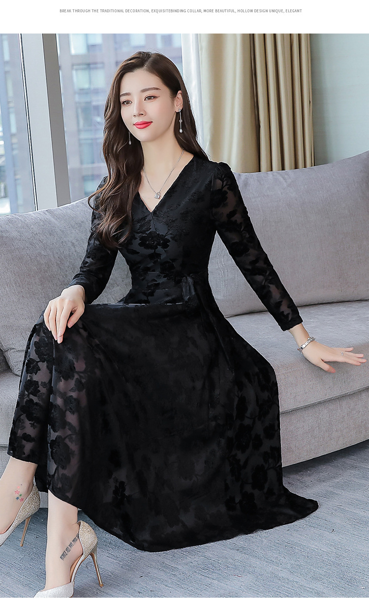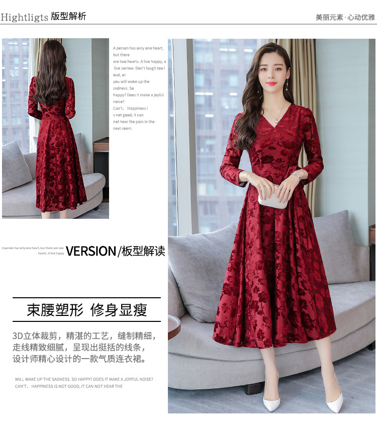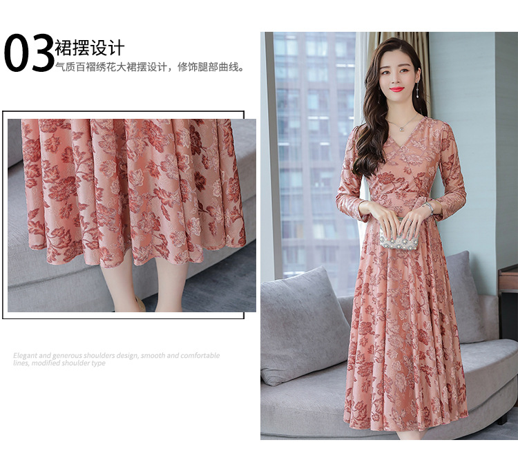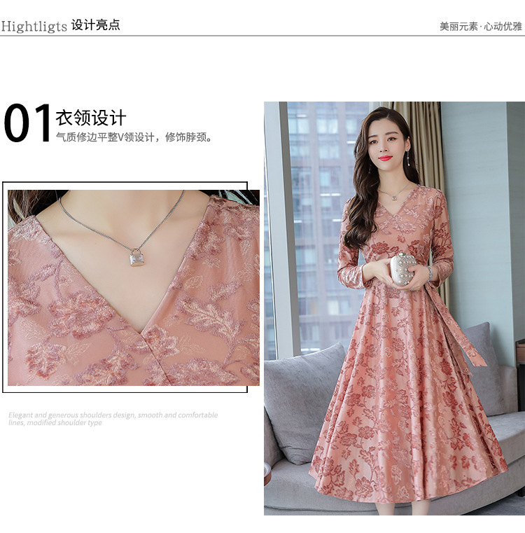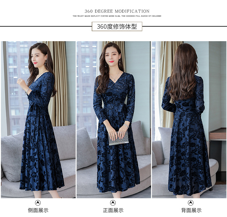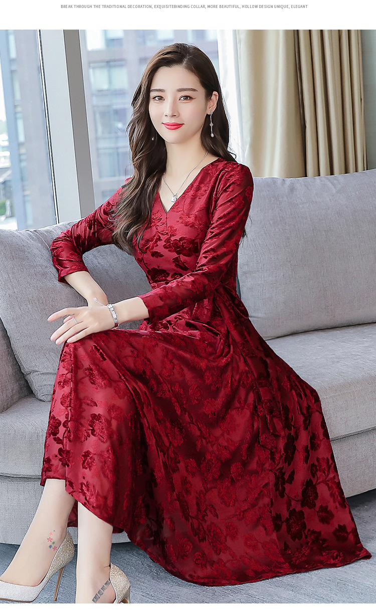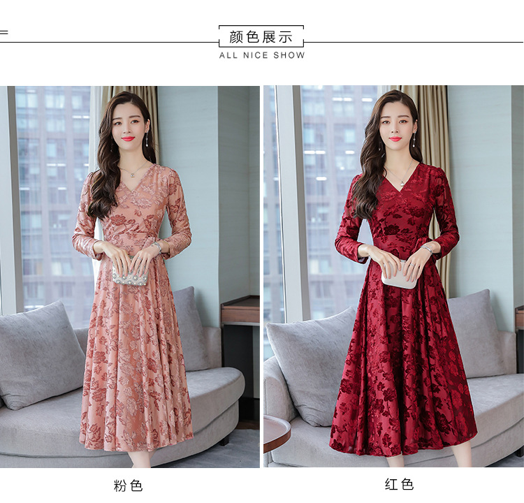 GZM-jcwl8155早春新款轻熟优雅长袖v领气质百搭金丝绒中长款过膝连衣裙女