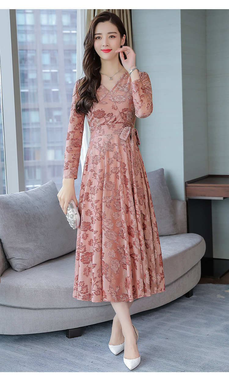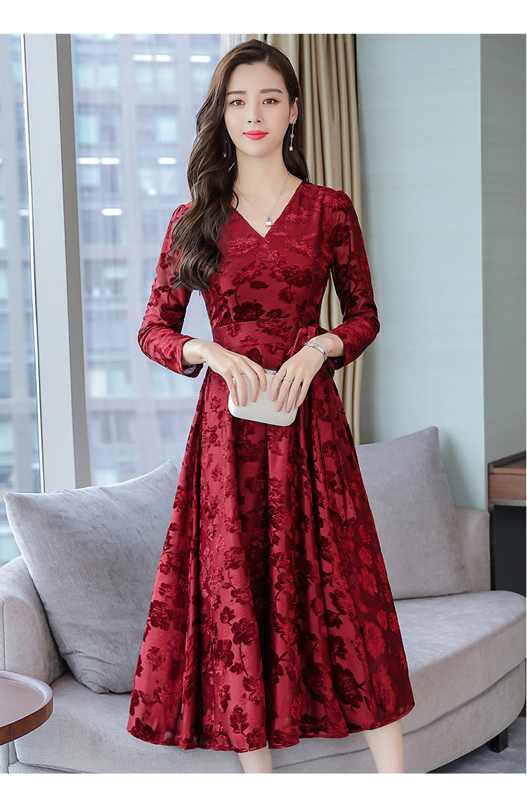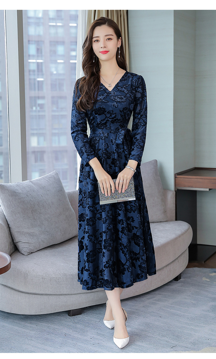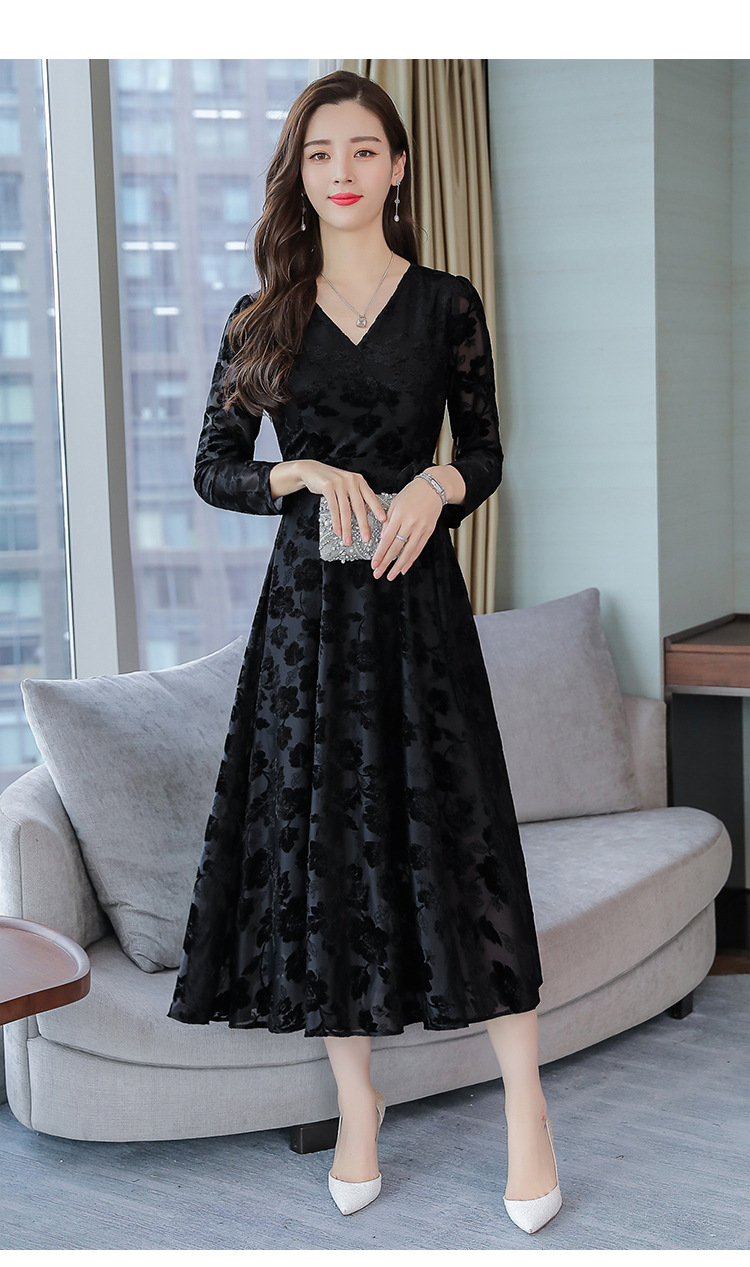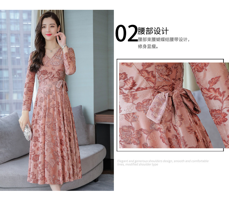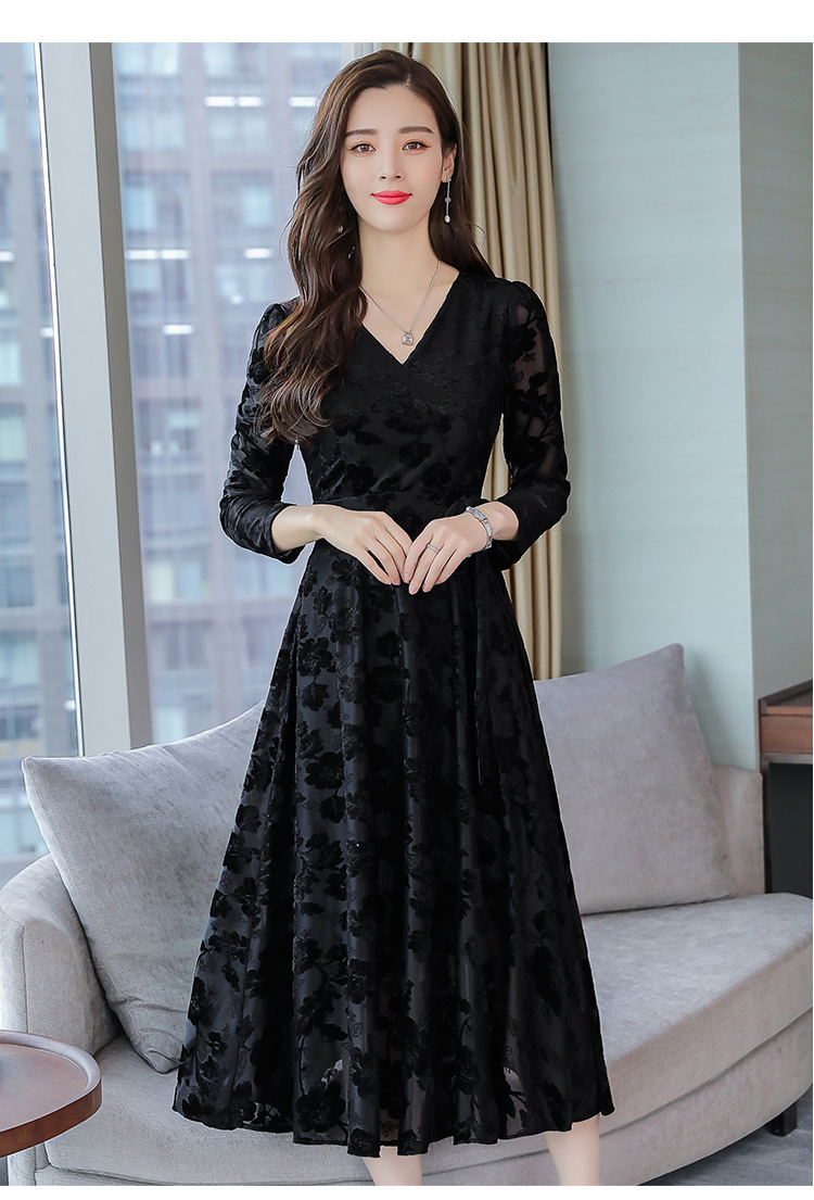 GZM-jcwl8155早春新款轻熟优雅长袖v领气质百搭金丝绒中长款过膝连衣裙女