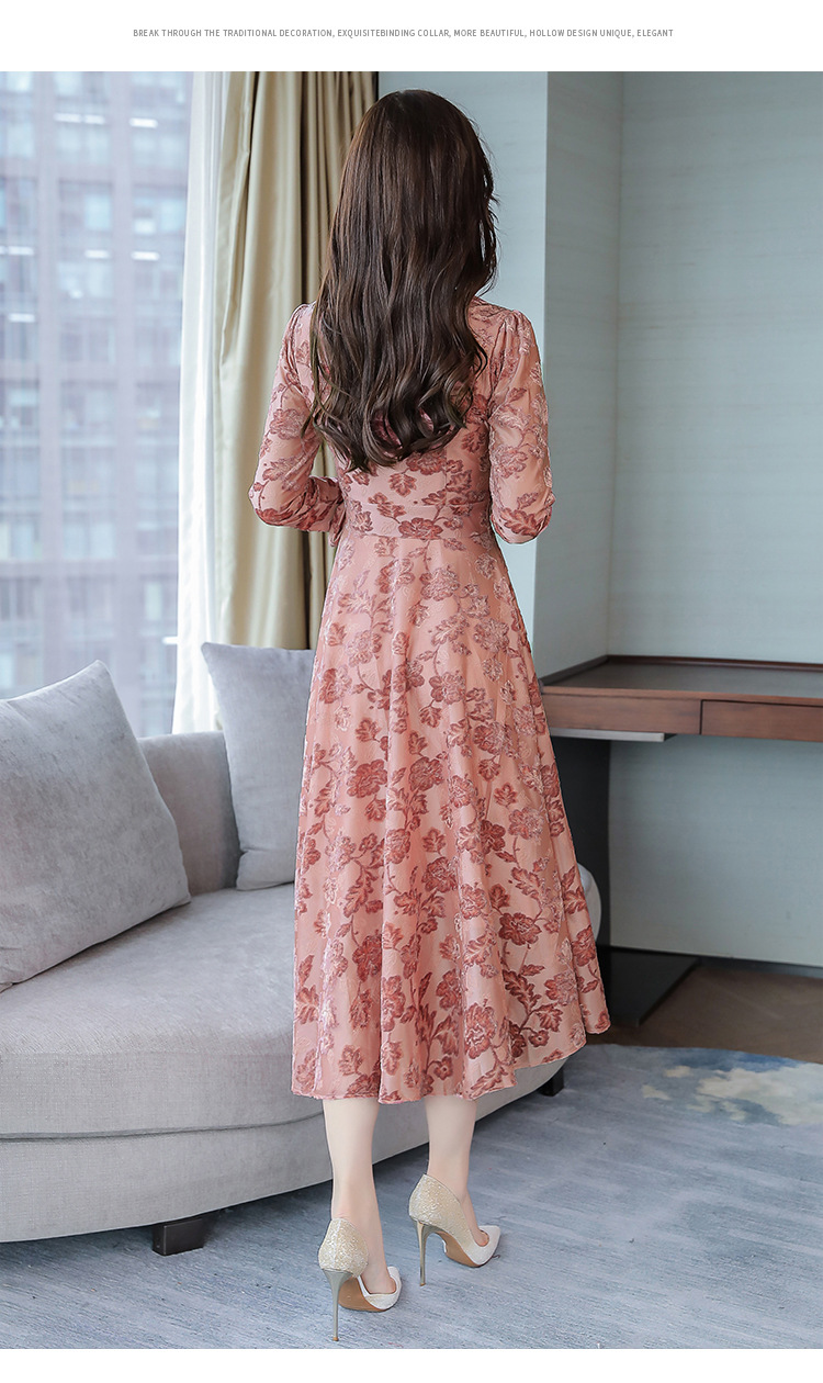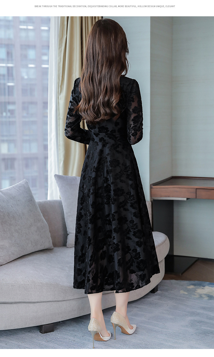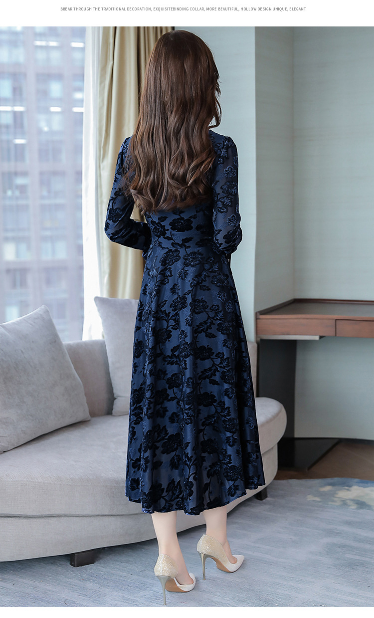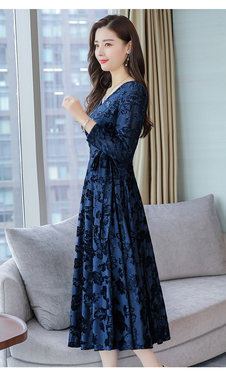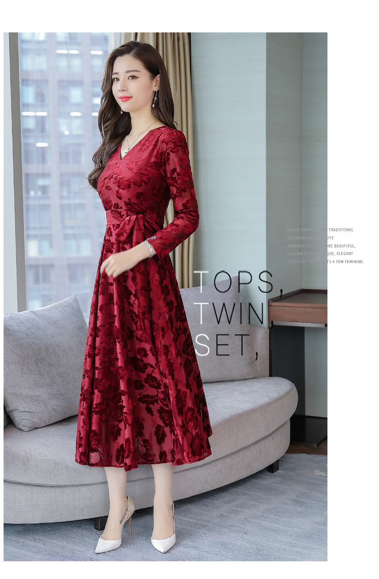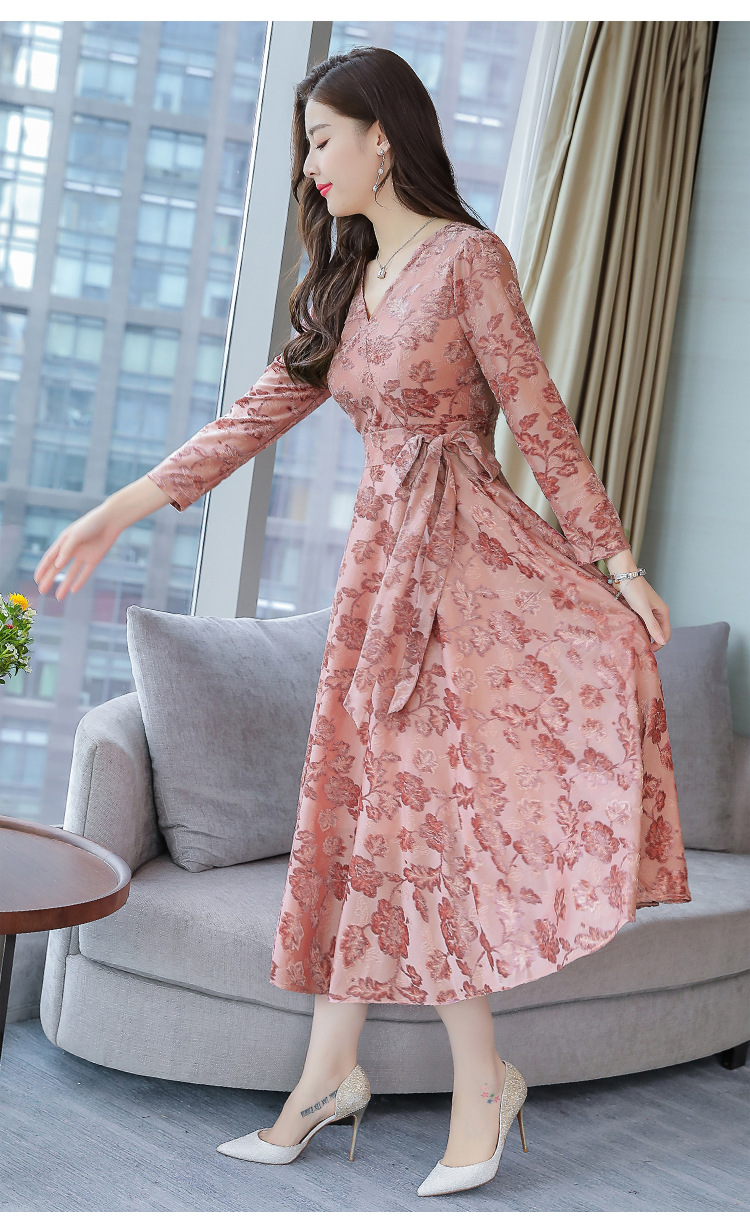 GZM-jcwl8155早春新款轻熟优雅长袖v领气质百搭金丝绒中长款过膝连衣裙女