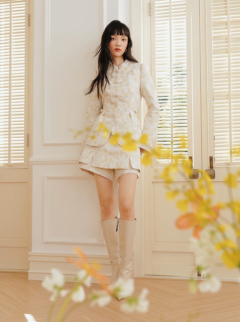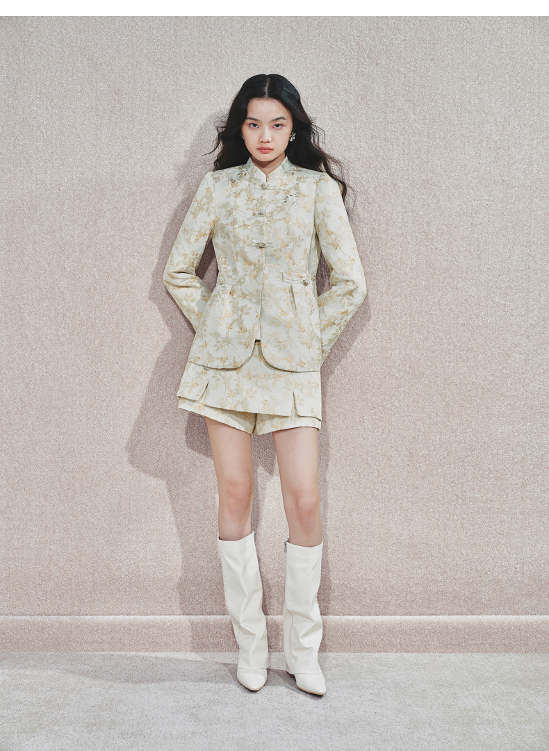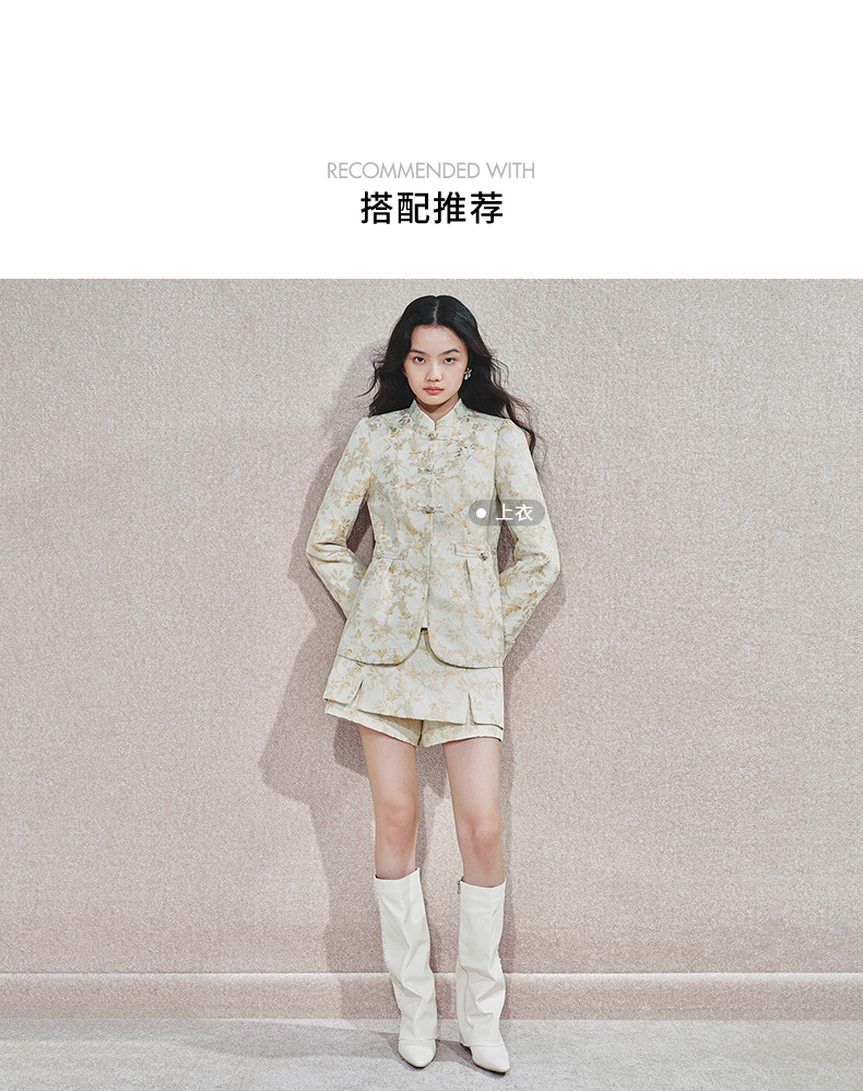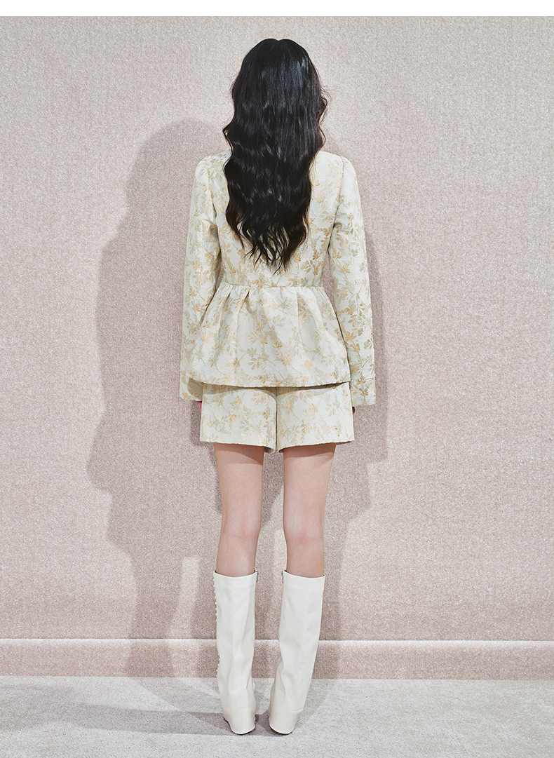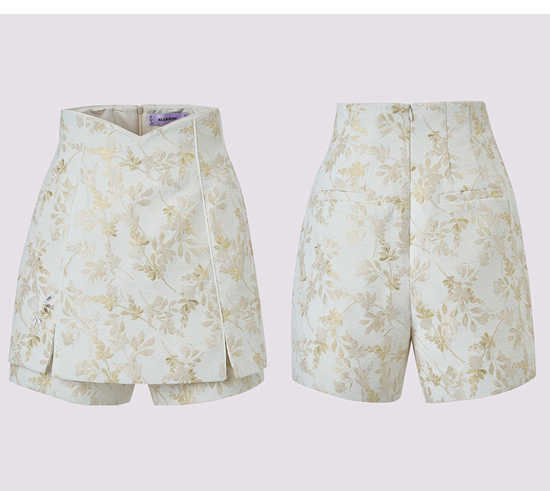 MAXRIENY精致复古感鎏金提花高腰短裤24冬高级气质感修身阔腿裤女(货号:MS85PA756)