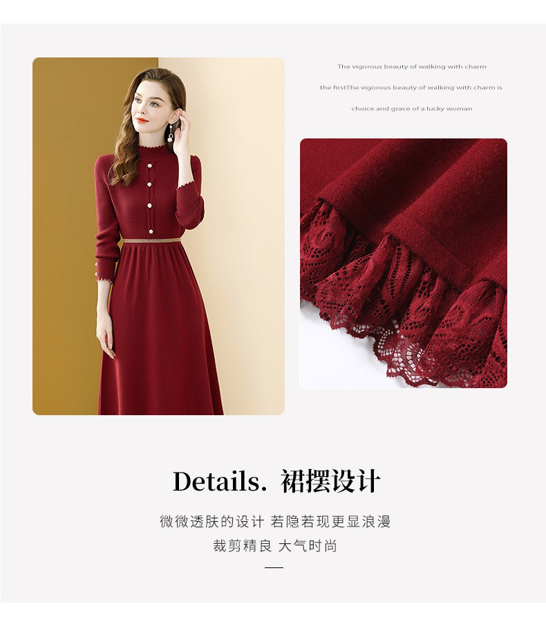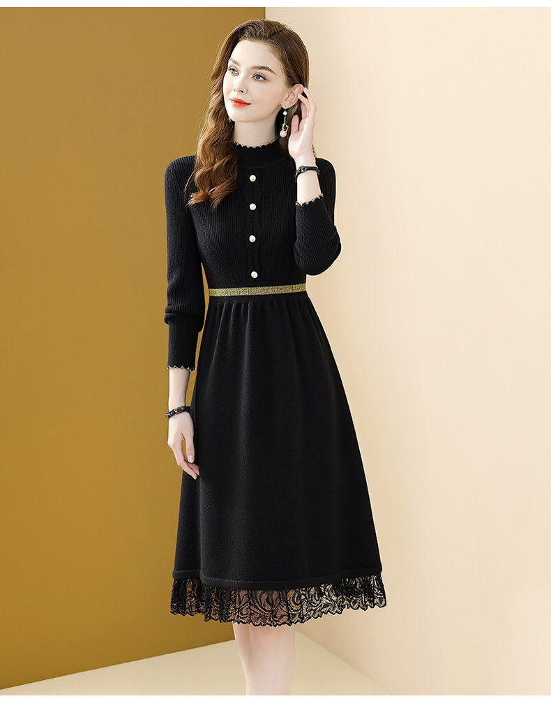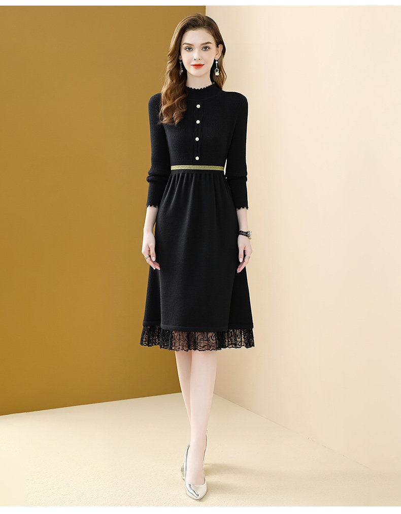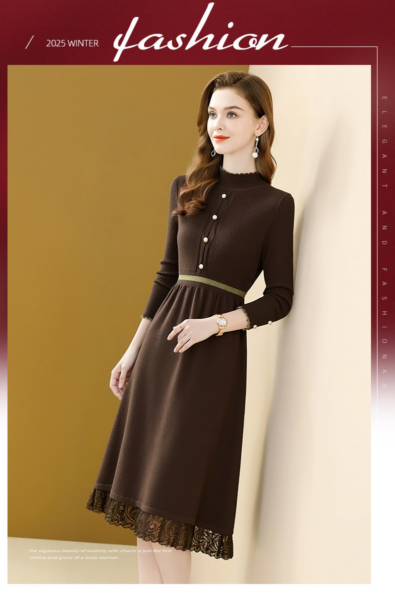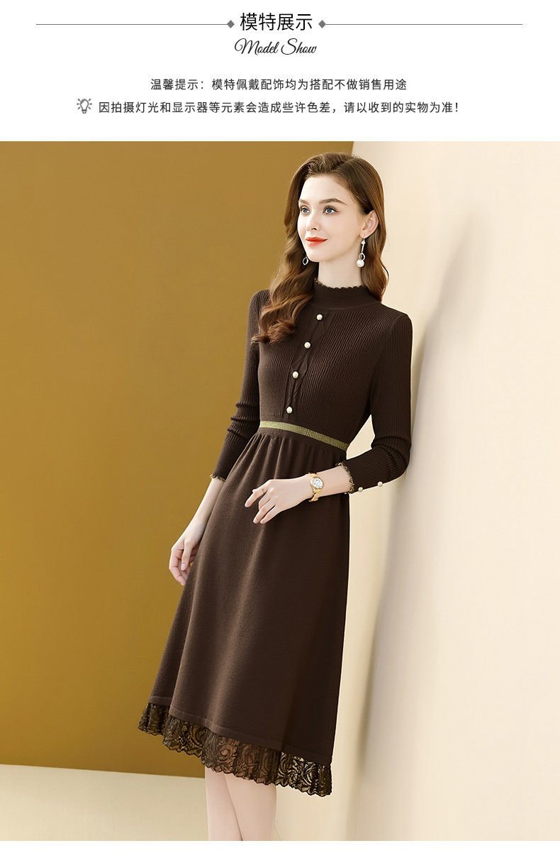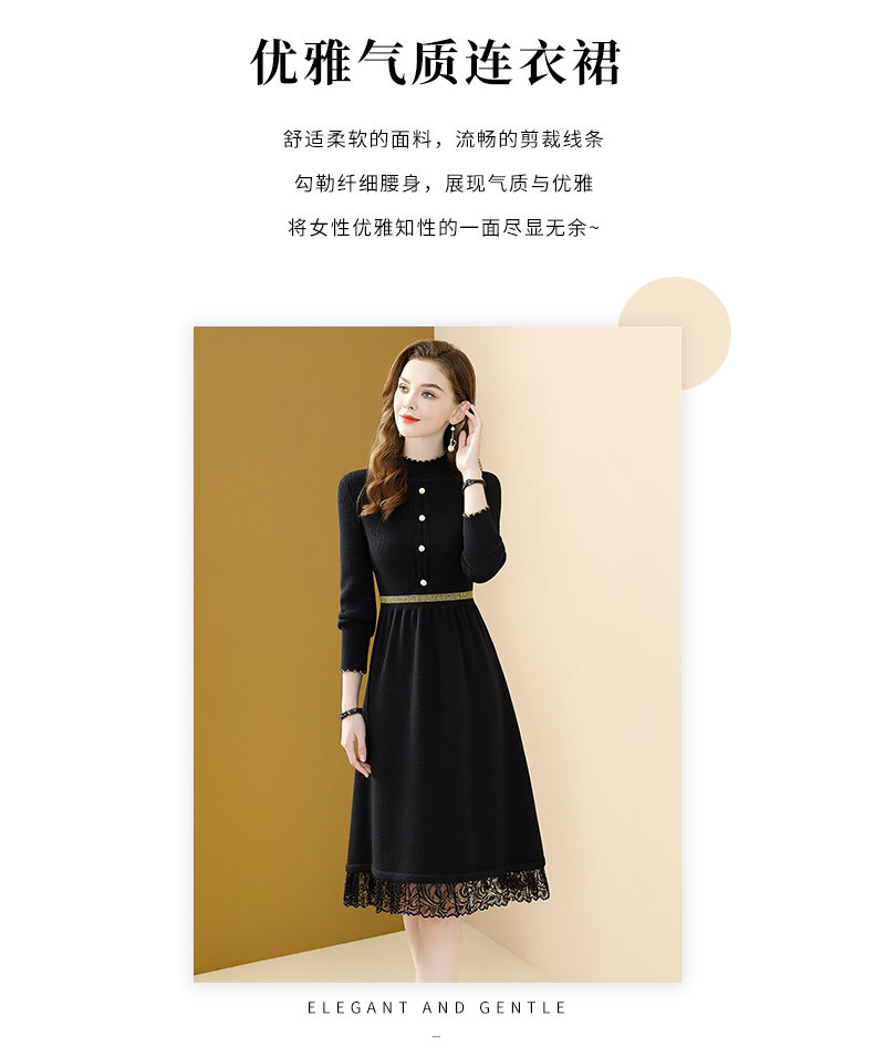 「自」全新升级【铂金会员201/天猫269/差价68】(12233)洛诗琳半高领针织连衣裙女2025秋冬新款气质通勤长袖蕾丝显瘦毛衣裙