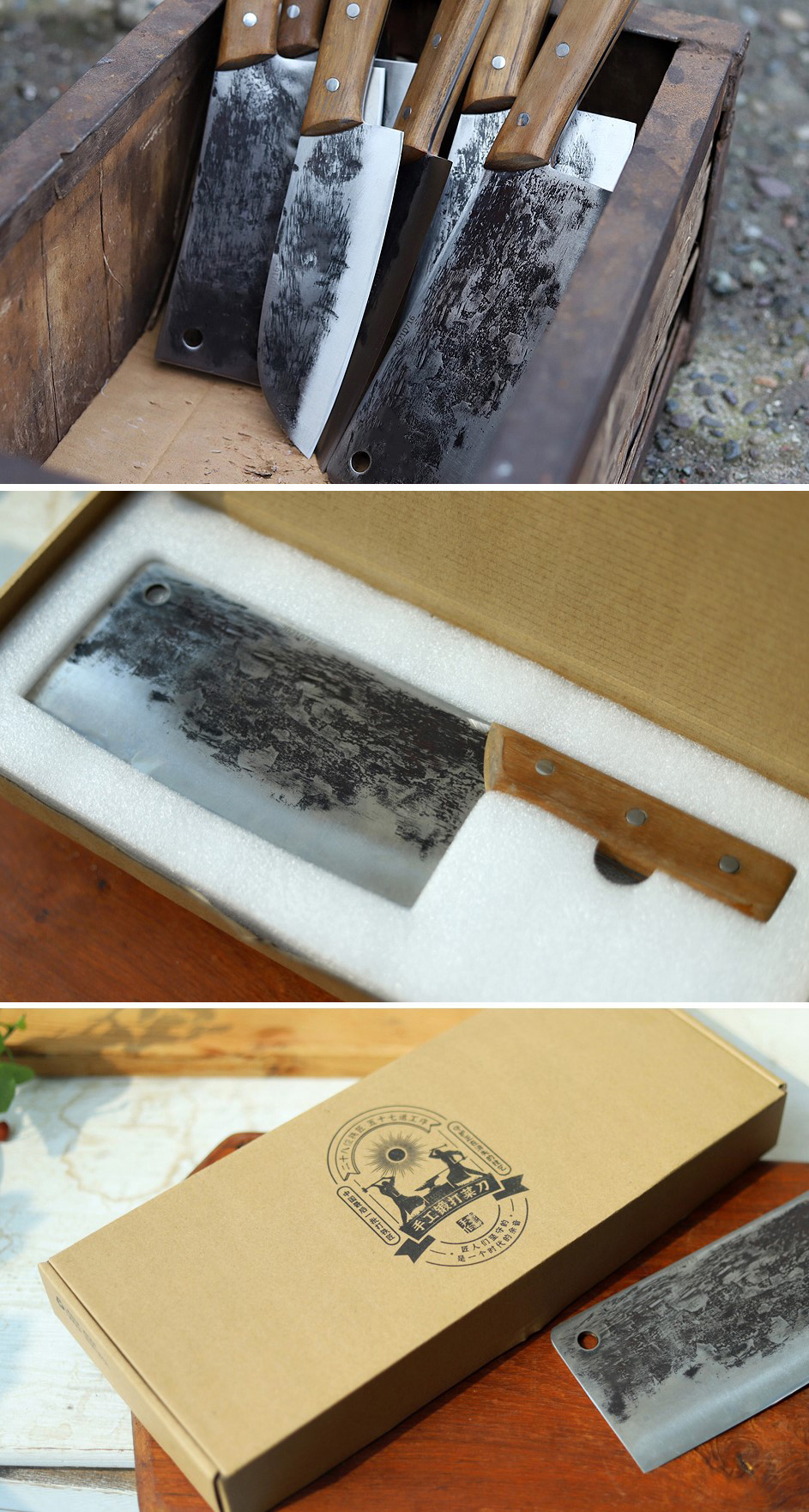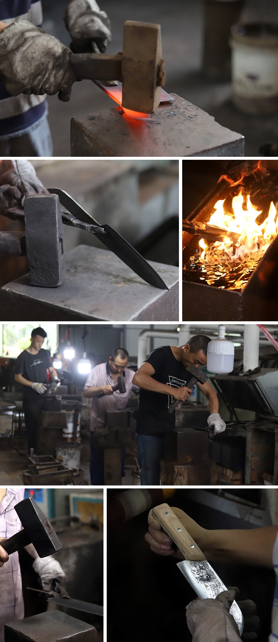 所有刀具均采用长城特钢,钢号为40Cr13,军工出品,是航空航天理想钢材。同时,采用1959年苏联遗留空气锤,高强度初次锻打,密度极高。再经过数百次手工锻打、开刃、磨刀等,锋利无比,坚韧稳定。
