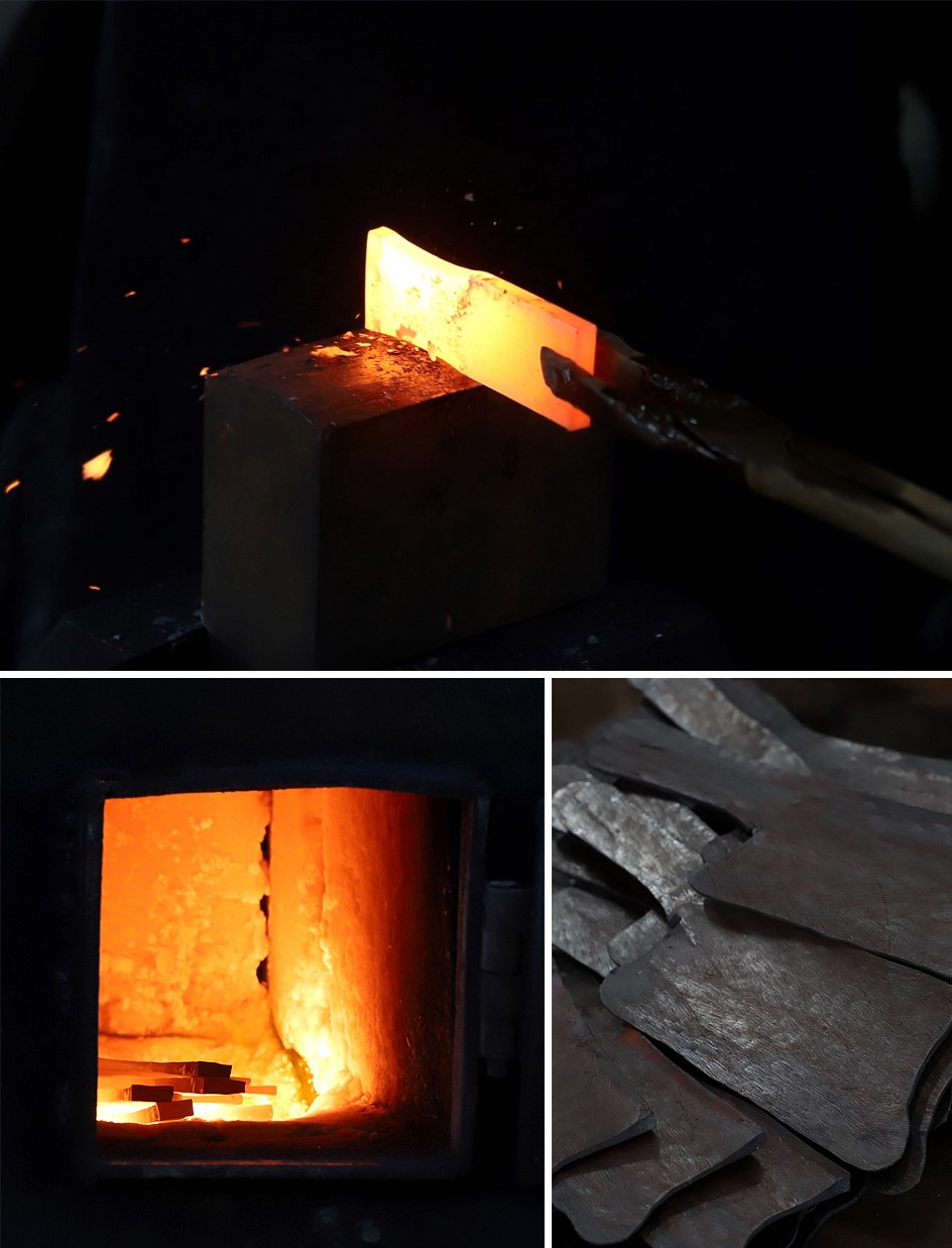 从一把钢到一把刀,中间经历了淬亮的火海。熔-锻-捶-淬-磨-开刃-抛光-覆刀柄-保养…超过28道工序,50道细节步骤。这是一个关于坚守的故事。