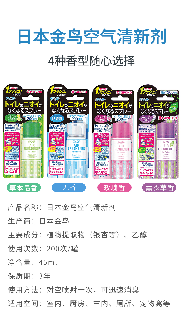 【品牌直发】日本金鸟kincho空气异味清新宠物厕所马桶除臭喷雾消臭去除烟味香薰进口
