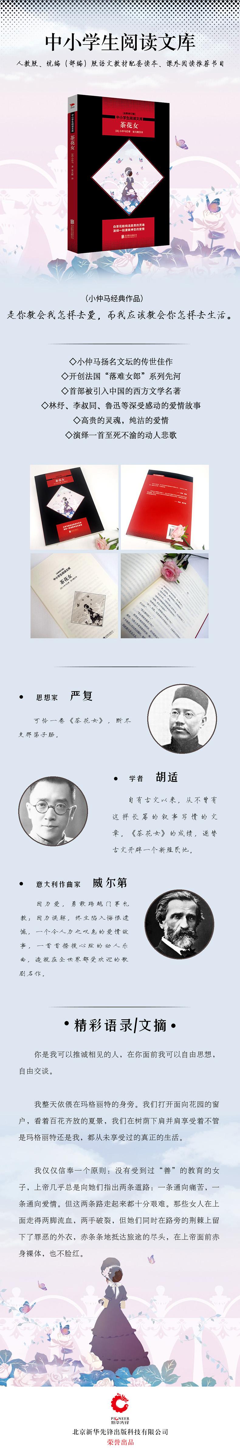 《茶花女》描写了一位外表与内心都像白茶花那样纯洁美丽的少女的爱情故事。主人公玛格丽特是个农村姑娘,长得异常漂亮。她来巴黎谋生,不幸做了一名上流社会的交际花。富家青年阿尔芒对她一见钟情,并且真诚地爱着她,这引起了玛格丽特对美好爱情生活的向往。但是阿尔芒的父亲坚决反对这门婚事,并迫使她离开了阿尔芒。阿尔芒不明真相,寻机羞辱玛格丽特,终于使她在贫病交加之中含恨死去。结局阿尔芒得知了真相,深深感受到了玛格丽特对他的无悔的付出与爱意。