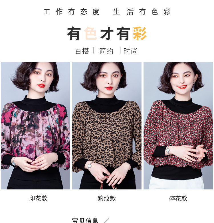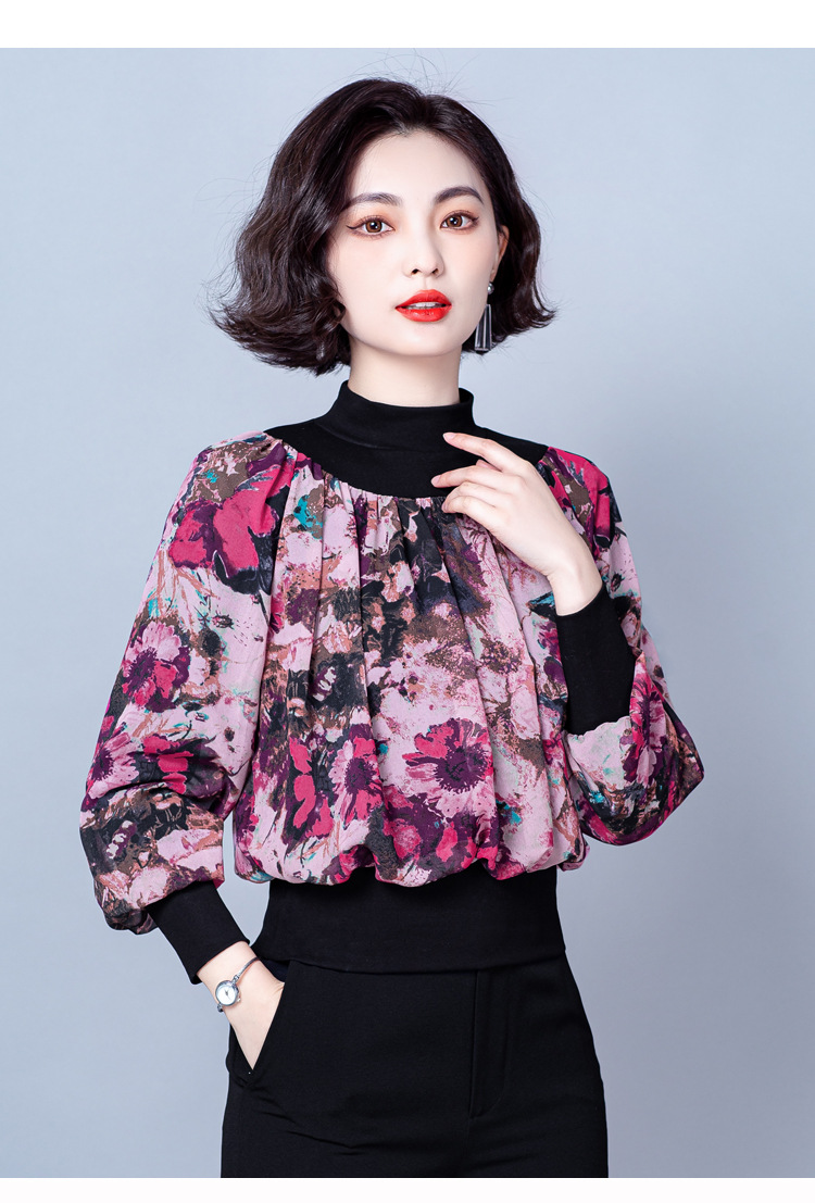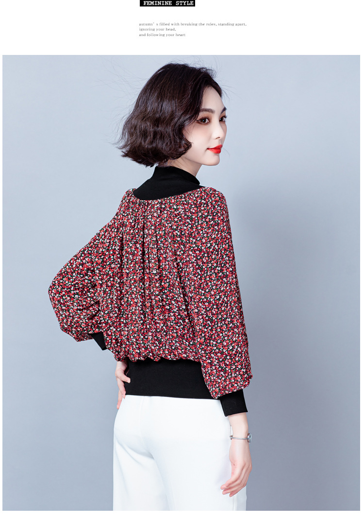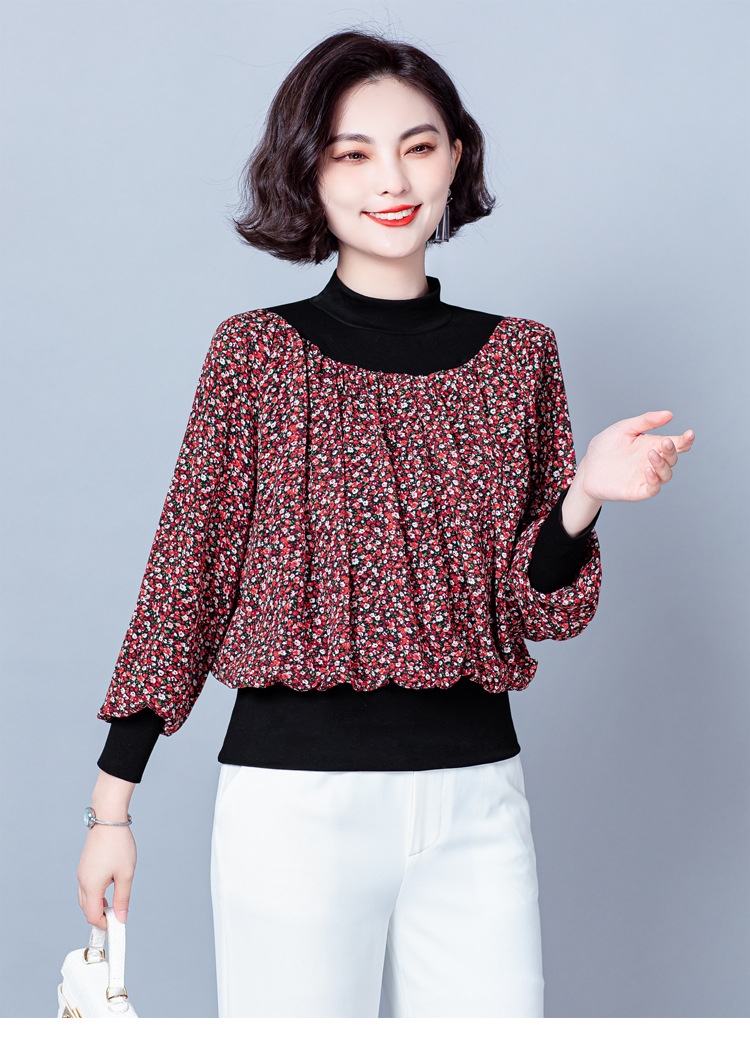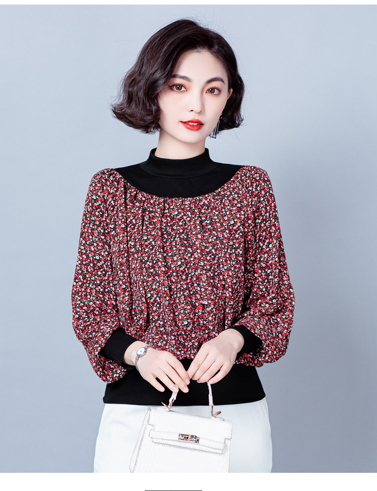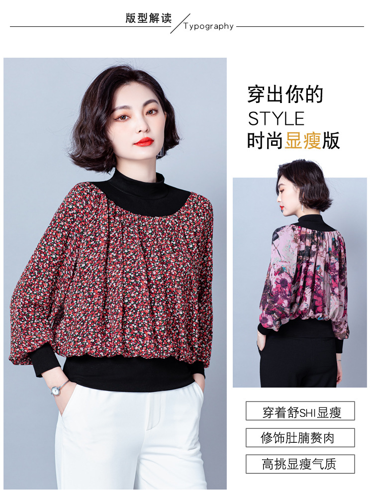 NY 65226时尚洋气半高领拼接宽松遮肉显瘦碎花上衣