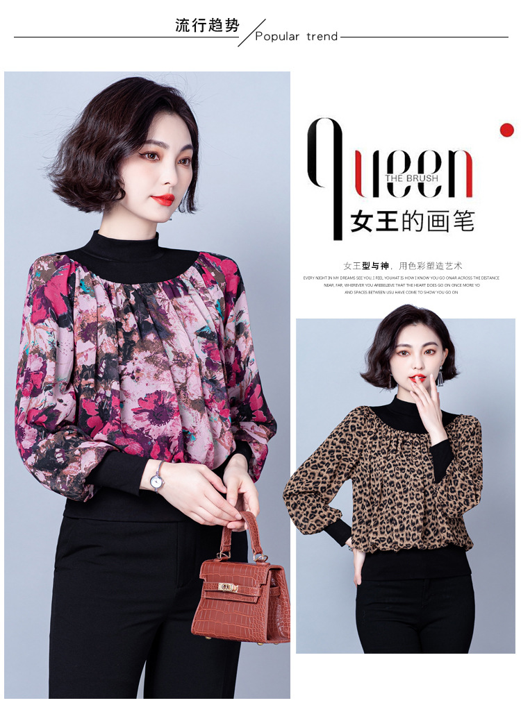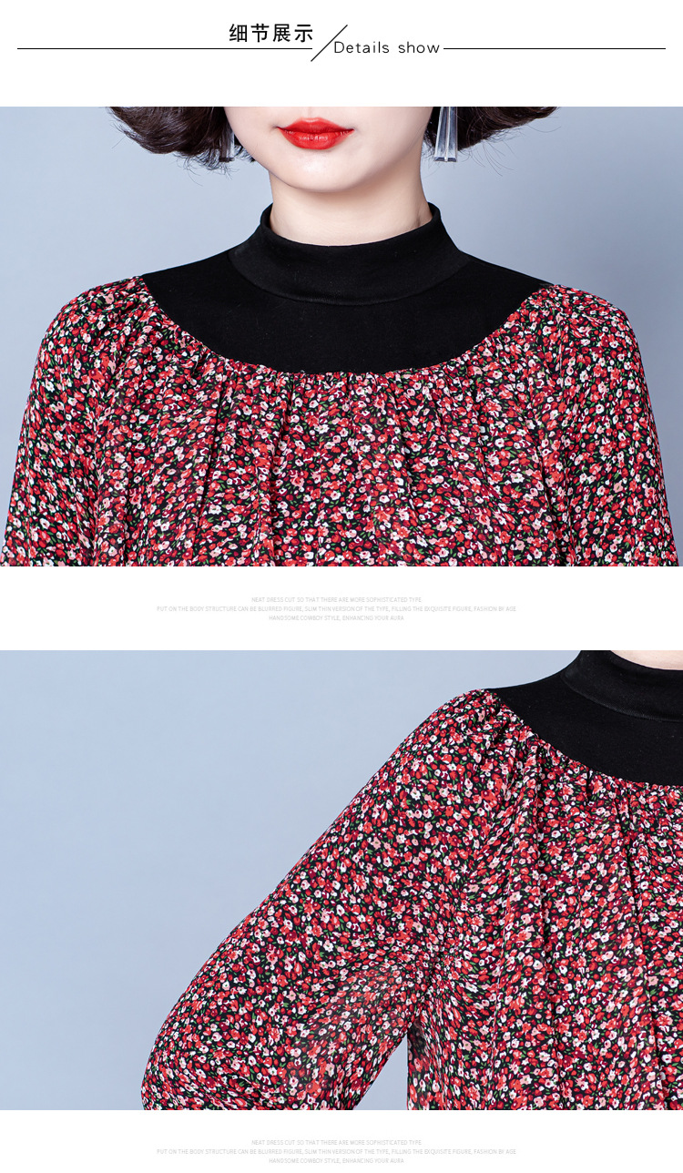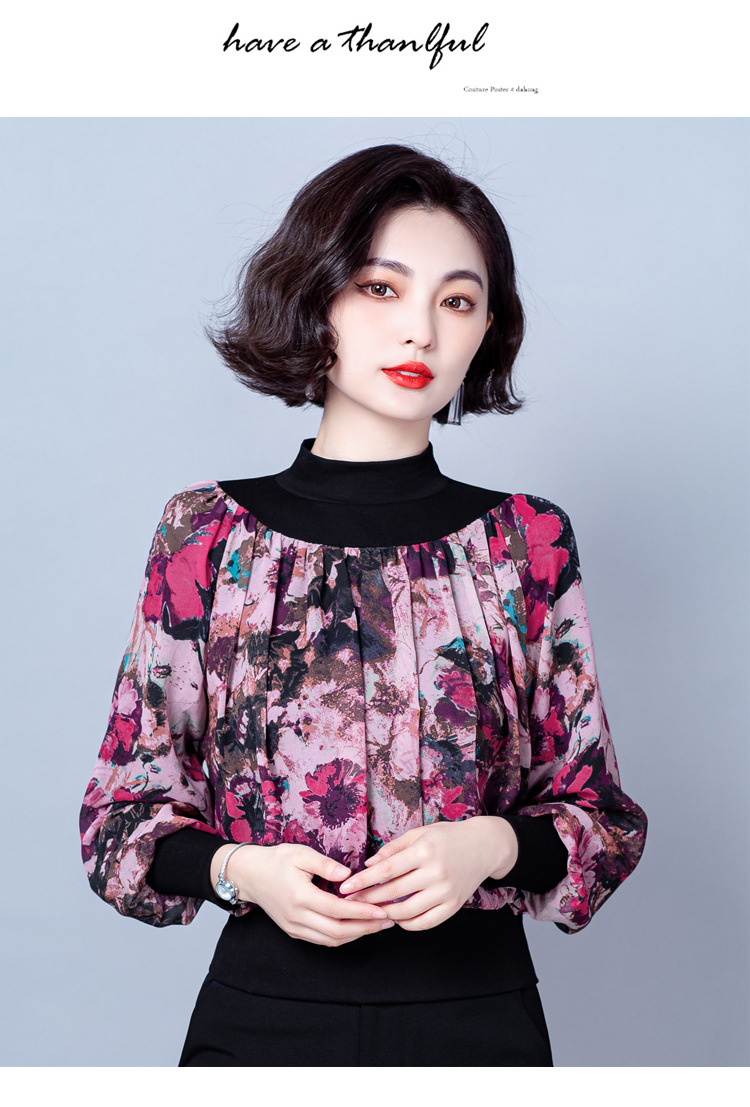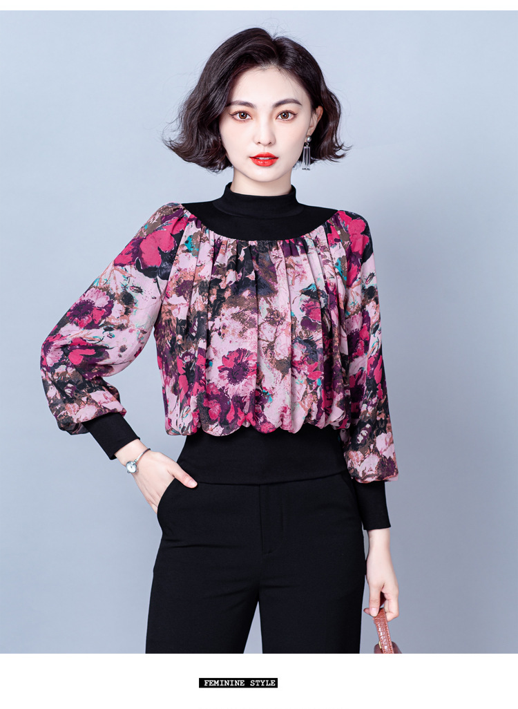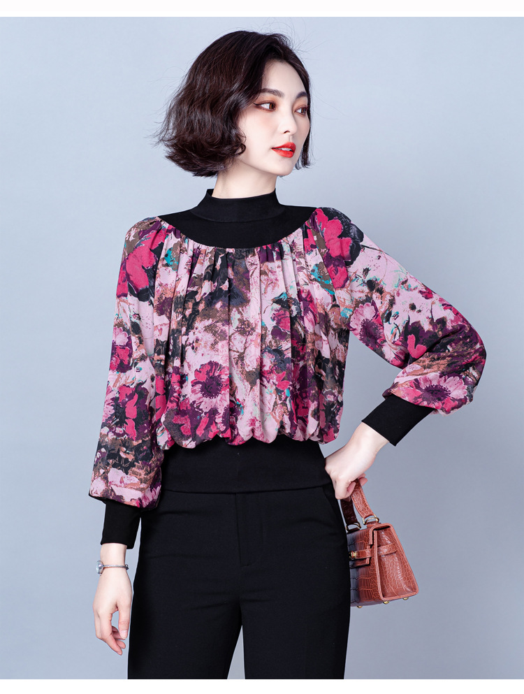 NY 65226时尚洋气半高领拼接宽松遮肉显瘦碎花上衣