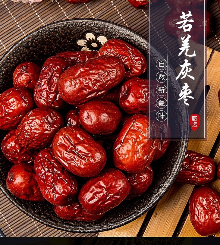 【产品特点】产于新疆若羌地区的若羌县,是树上自然吊干的红枣。 若羌灰枣个小美观,呈椭圆形,肉实质脆,果实圆润饱满,晒干后为深红色,吃后满口余香。