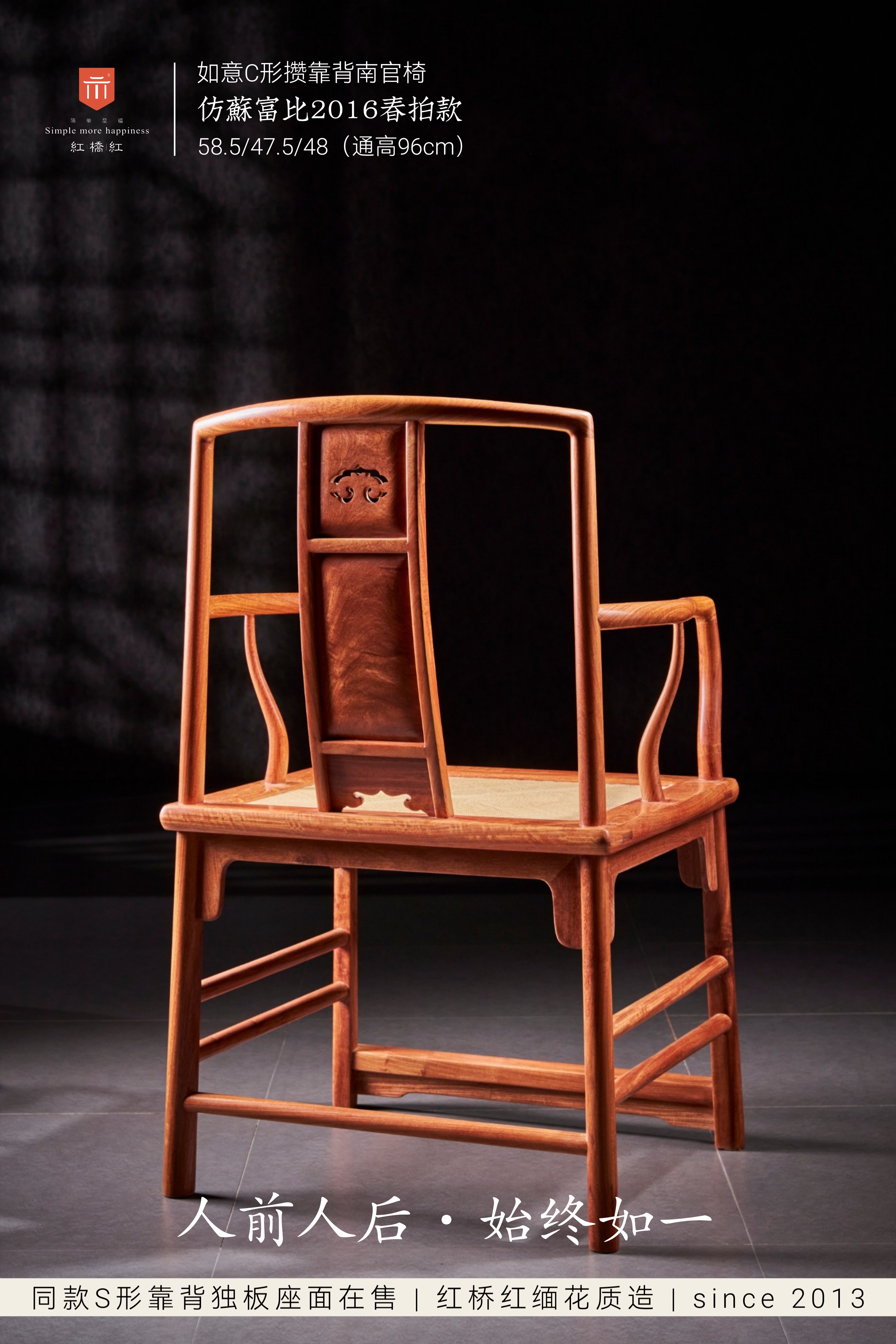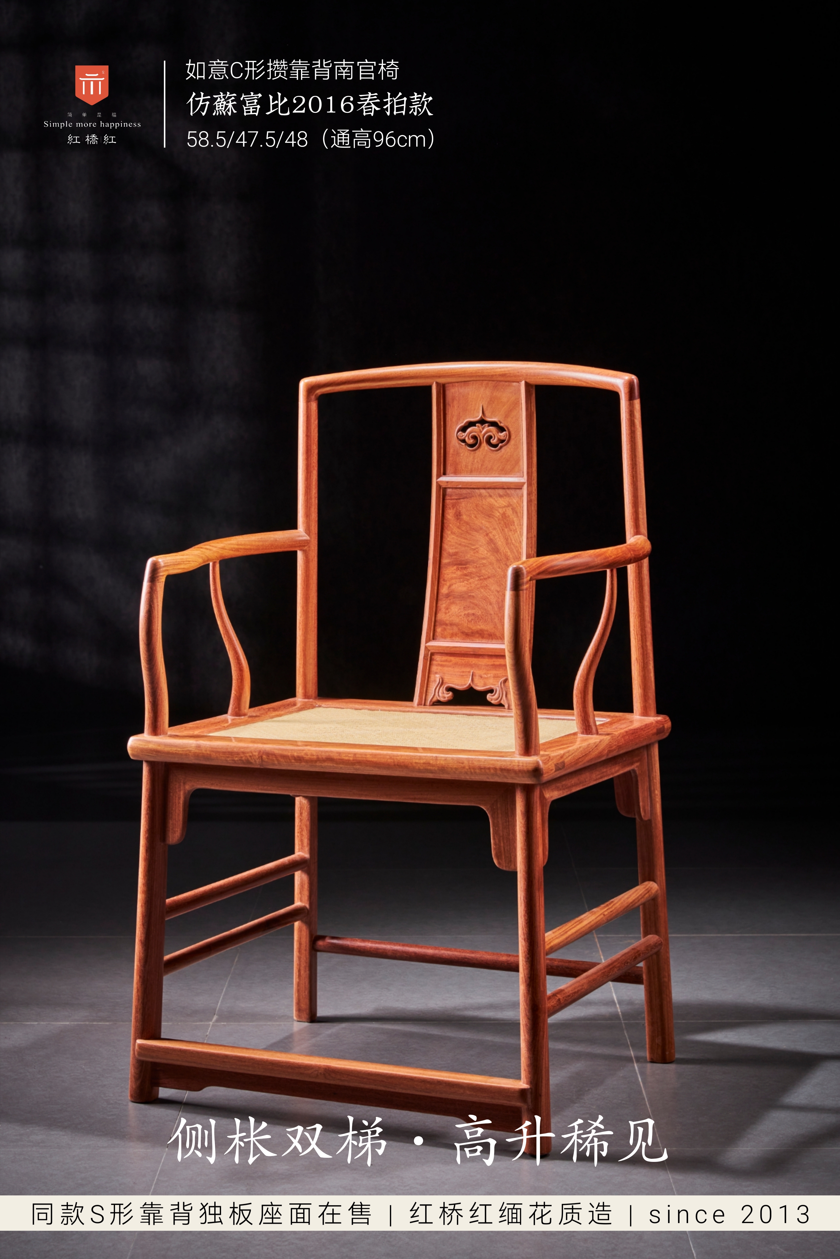 此款南官帽椅原型来自苏富比2016年春季拍卖会“明式家具——亚洲私人收藏”专场,一张晚明 黄花梨攒靠背南官帽椅。
