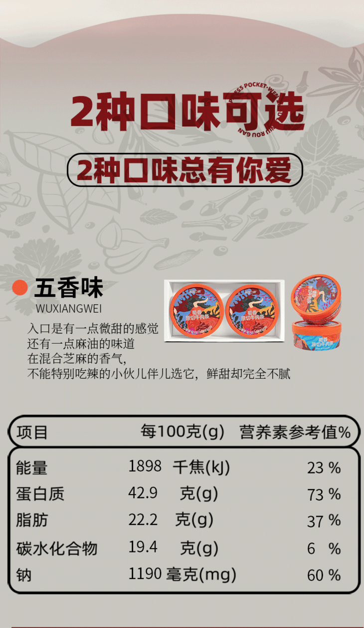 品名:幸福口袋蜀香原切牛肉条 规格1:五香味220g/盒*1盒 规格2:藤椒味220g/盒*1盒;拍几份发几个包裹,不一定能同时到达,请耐心等待 发货地/产地:广东 包装方式:盒装 保质期:6个月 物流信息:默认圆通/中通发货,不支持指定快递 发货区域:新疆、西藏不发; 物流详情:周六、周日及节假日除外,正常48小时内发货,到货时间约为2~5天,请耐心等待 售后说明:收到货后有质量问题,在24小时内都可以拍照(坏果+快递单面箱子一起拍)上传,申请按坏品比例理赔或联系客服,生鲜性质特殊,不支持七天无理由退换货;因地址错误,手机号联系不上,拒收等造成的损失无法售后,请理解; |
