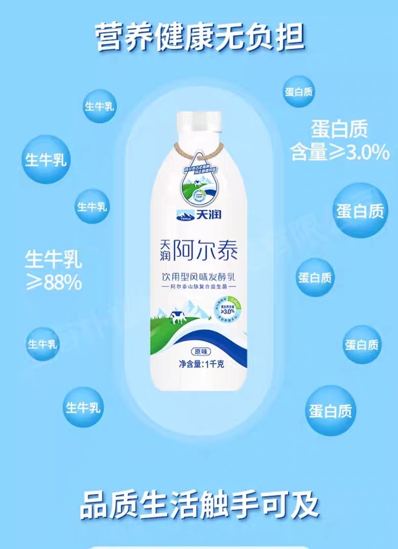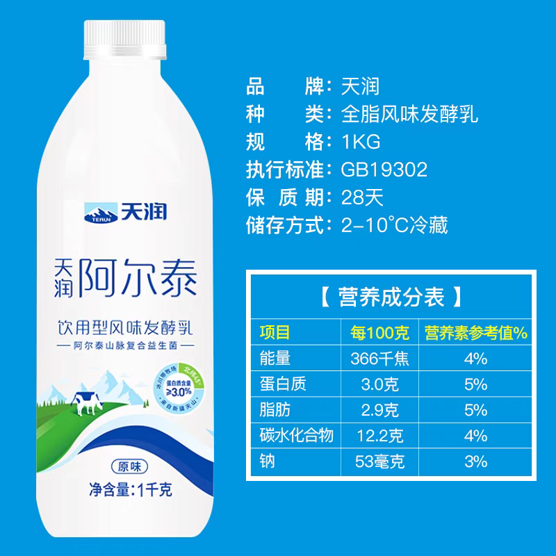 天润新疆低温酸奶阿尔泰饮用型风味发酵乳1KG*2瓶