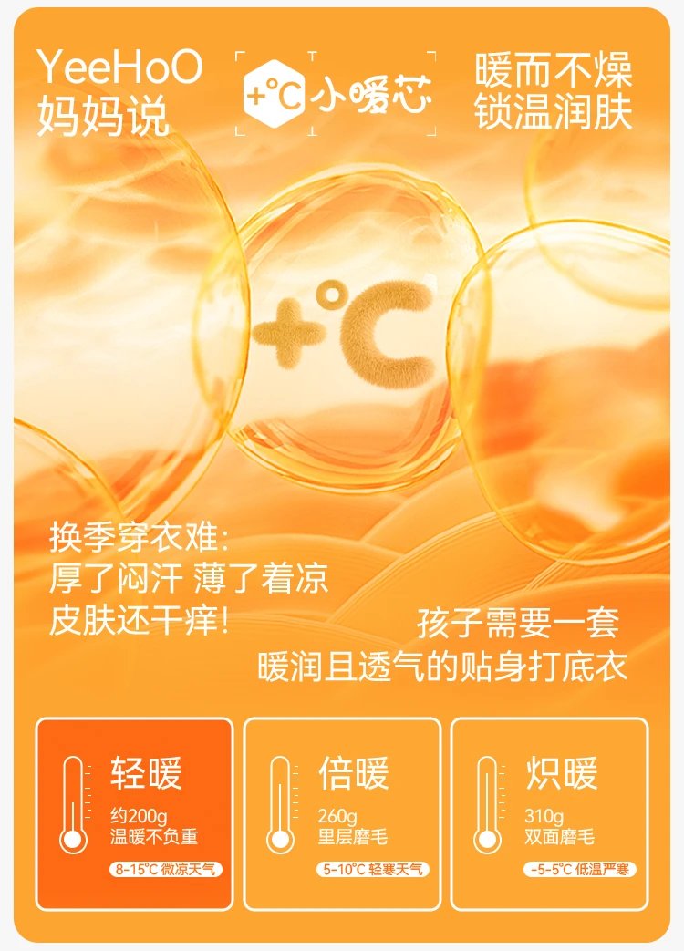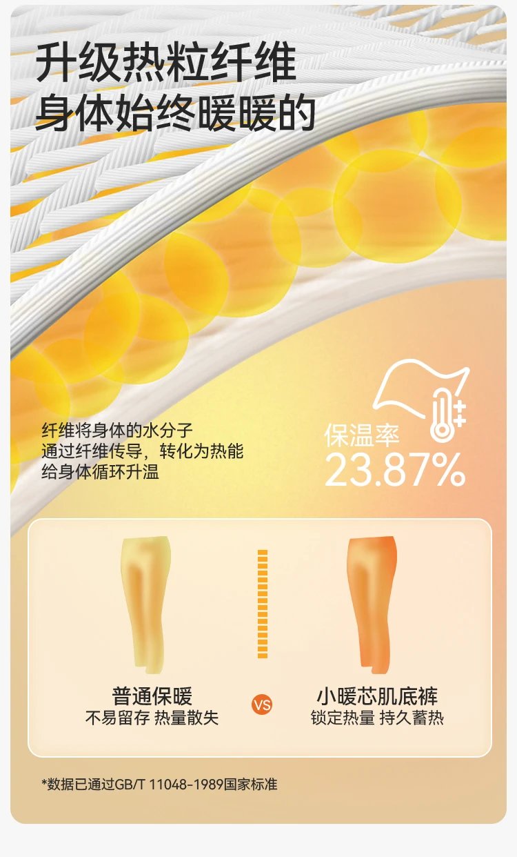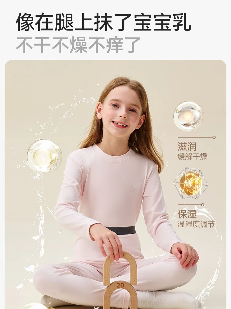 再加上玻尿酸黑科技加持,打破传统保暖裤 “越暖越干” 的魔咒,保暖的同时还能给肌肤补充水分,秋冬再也不怕孩子腿上起干皮,天然面料与黑科技的双重呵护,让温暖变得 “润” 起来,暖而不燥超贴心。