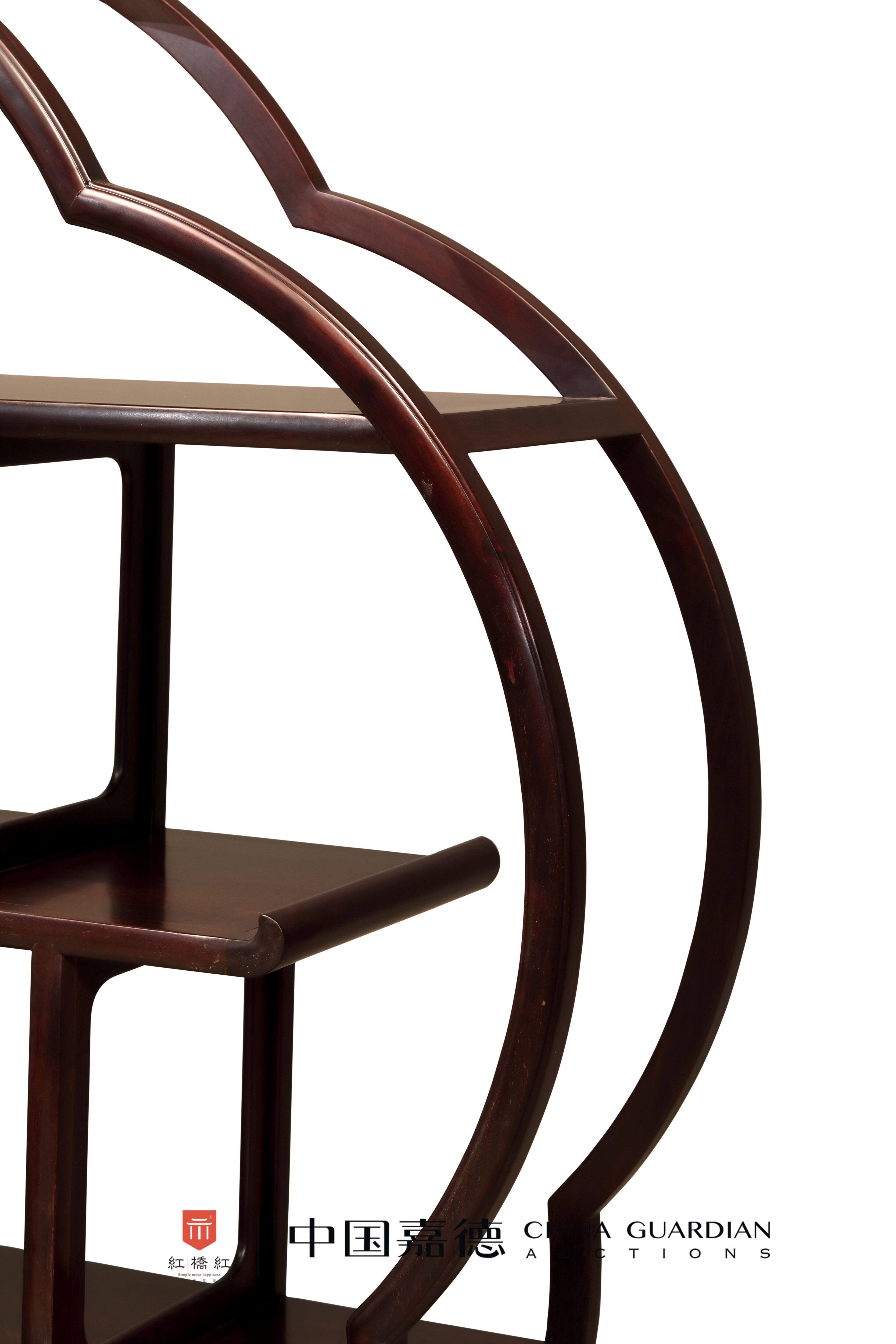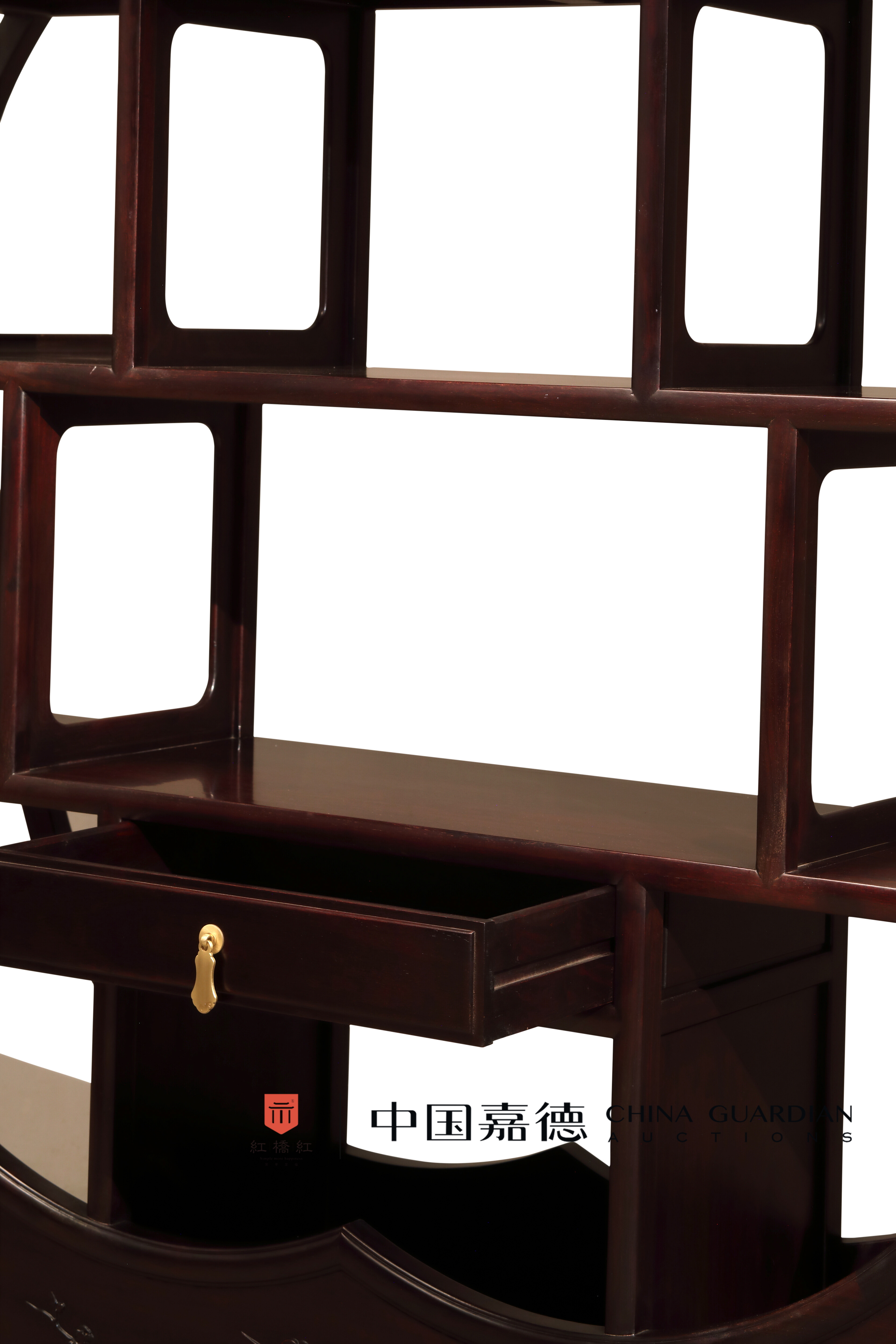 博古架梅花形,寓意花开富贵。采用赞比亚紫檀制作,色泽沉穆,木纹自然。主体为五瓣梅花形的架构,其内先以长短不一的横竖枨间隔三层,可陈设茶道具等,错落有致,随心意灵活摆放;在最后一层屉板下又安支架,装一具长抽屉,起到收纳的作用,安铜拉环,使用便利。每个空间的隔板皆为长方券口,光素无饰。架格底部安前后双层板座,其上浮雕折枝梅花纹,与整体装饰语言和谐统一,且为双面雕工。整器底部又设长方形箱式墩座,结构合理,更为稳固。