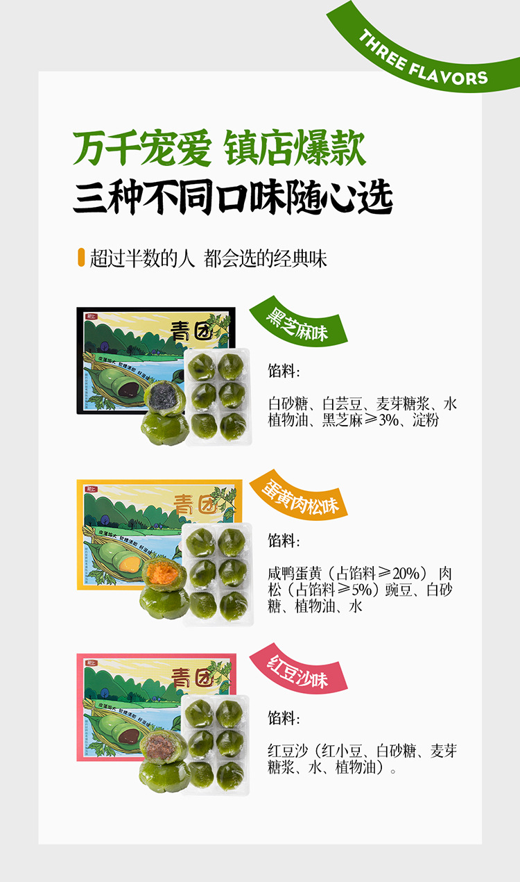 【软润Q弹!回味无穷】艾草青团 三种口味 红豆+芝麻+蛋黄肉松 糕点 300g/盒。xa