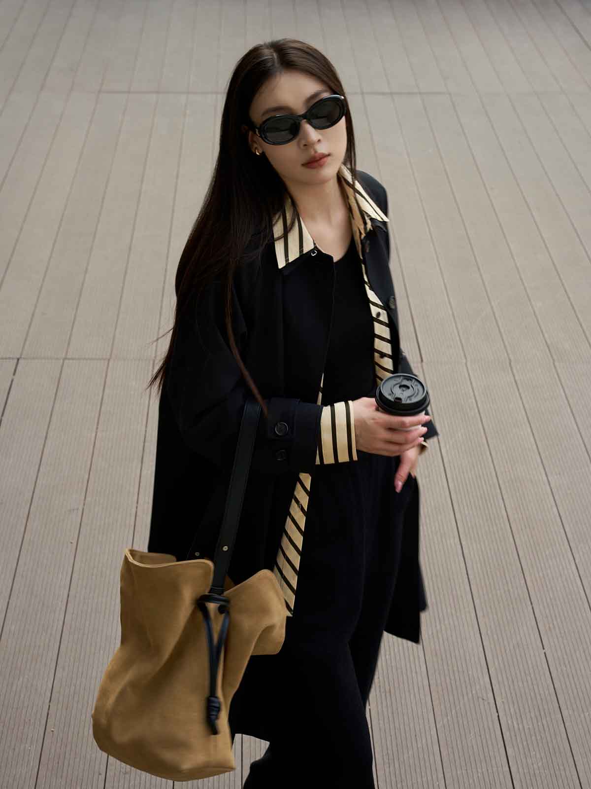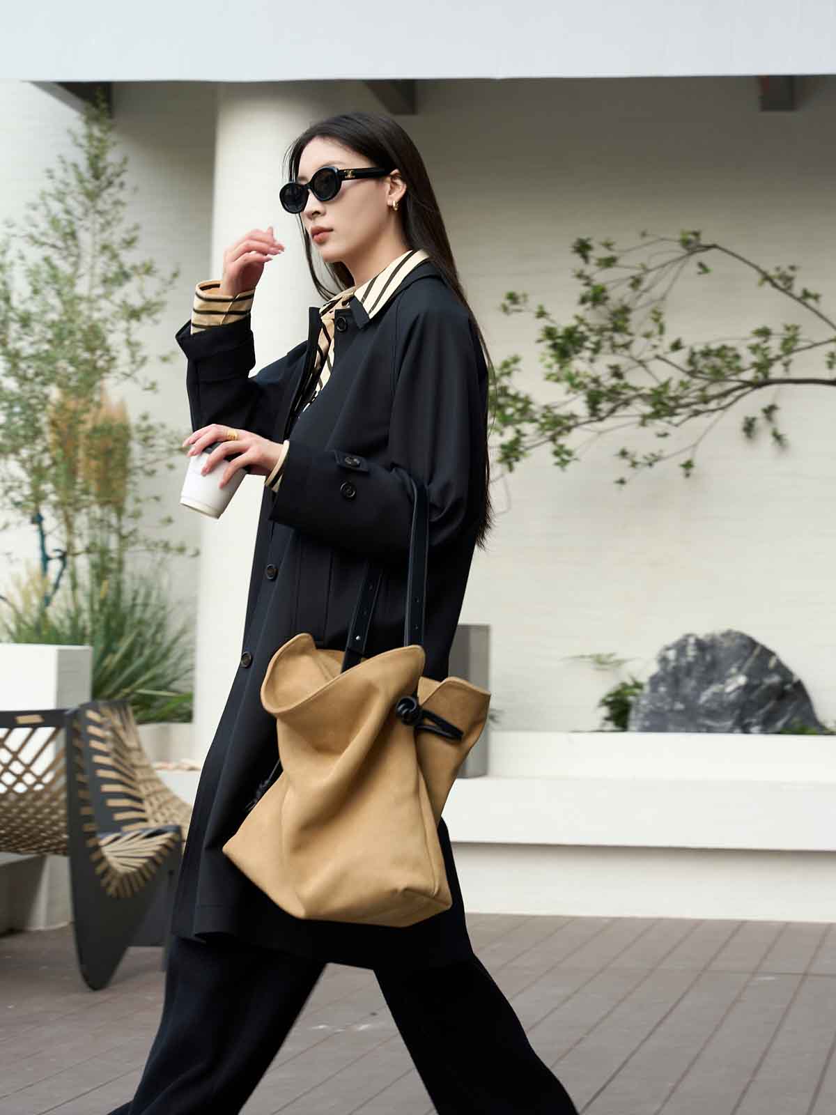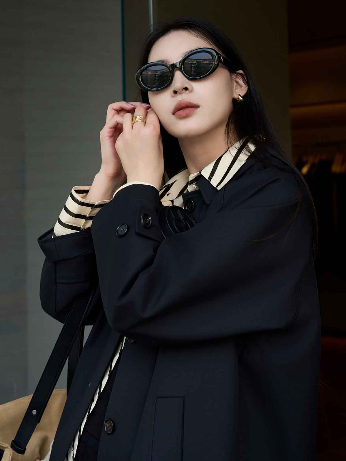 宽大的廓形风衣,包容性强,结合茧型连袖,颇具时髦造型感,辨识度很高