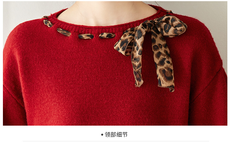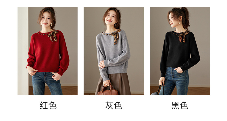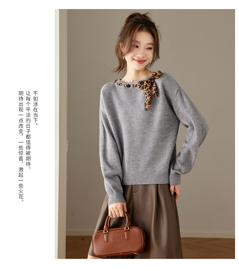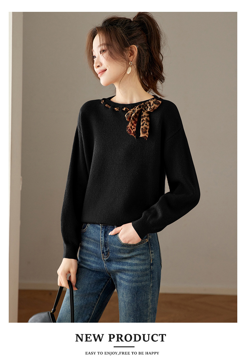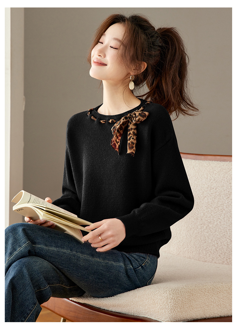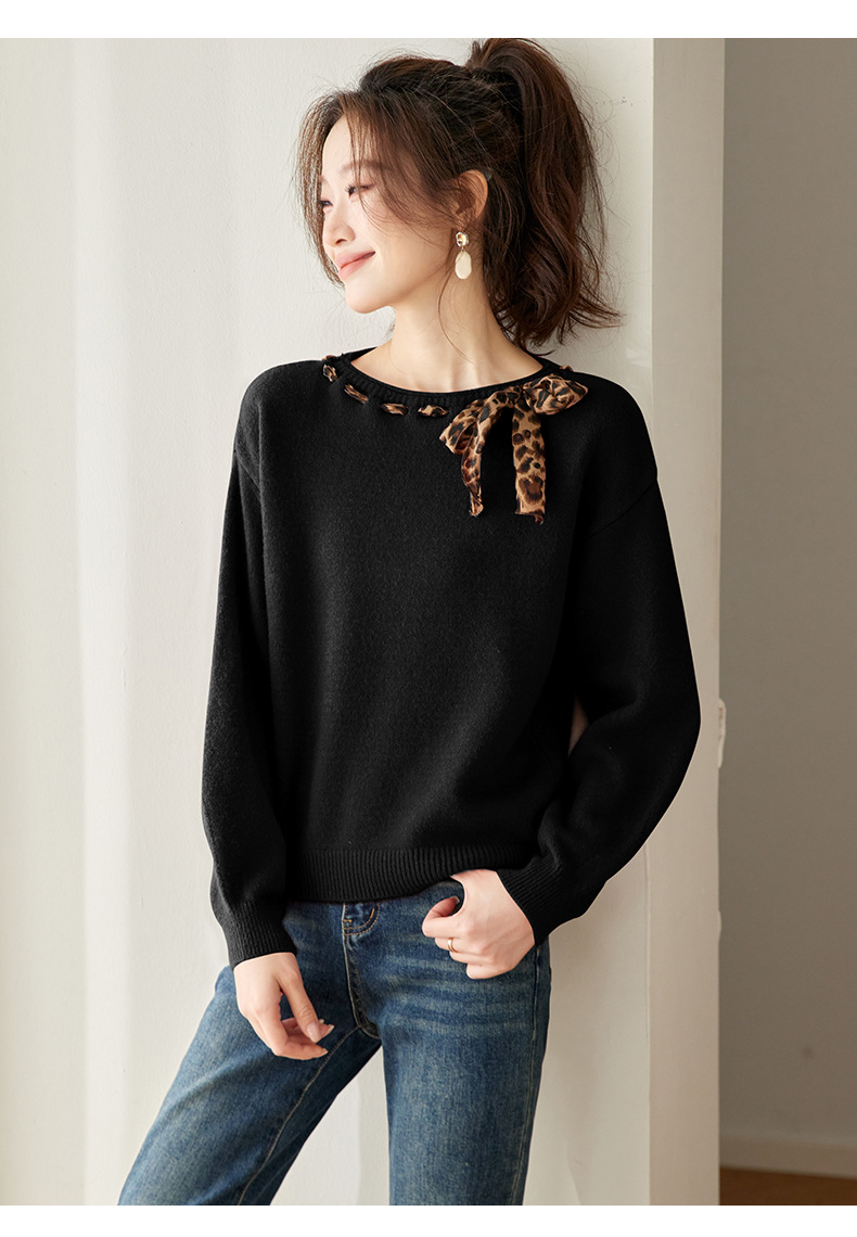 CC慵懒风圆领蝴蝶结豹纹飘带毛衣女宽松高级感针织衫好看打底上衣厚