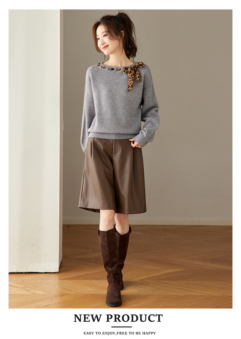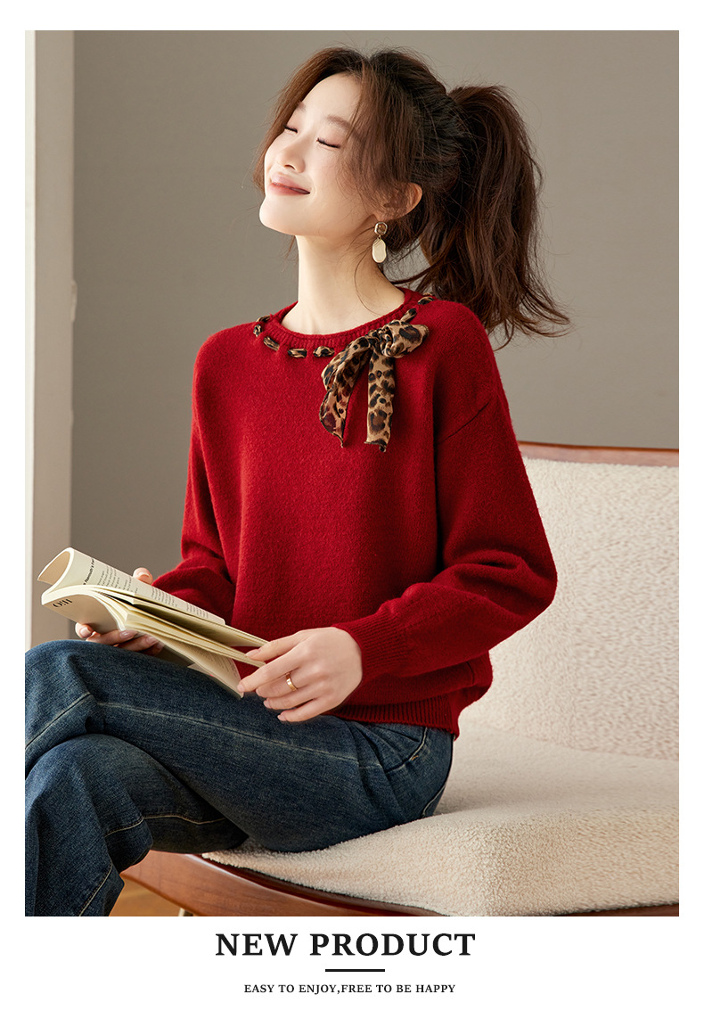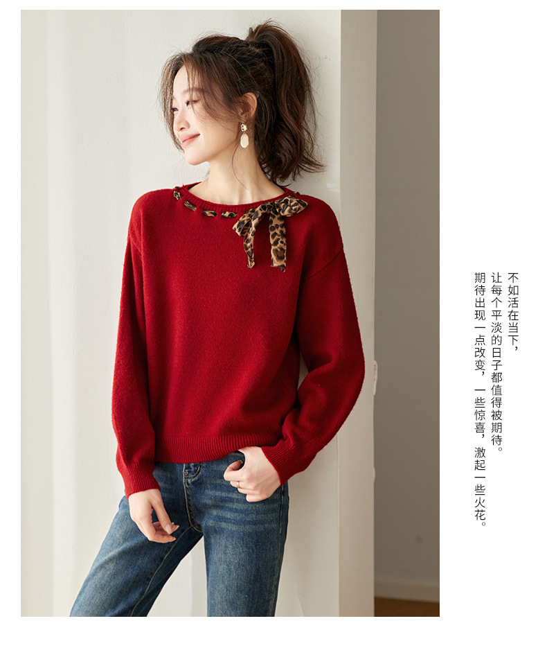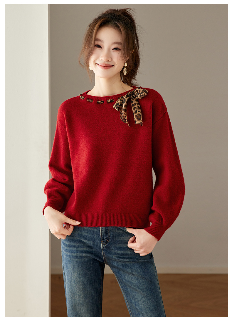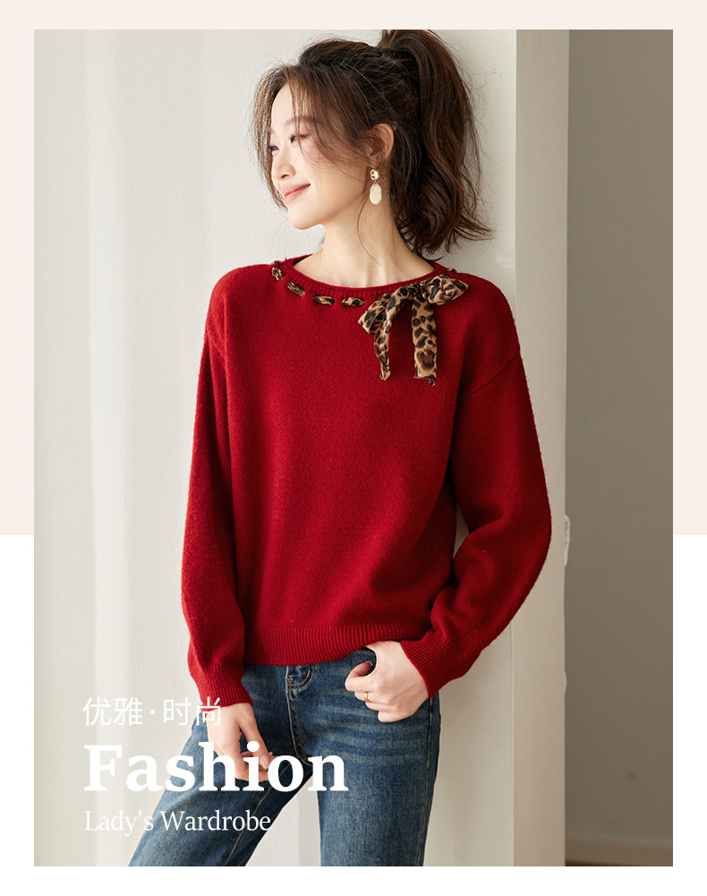 CC慵懒风圆领蝴蝶结豹纹飘带毛衣女宽松高级感针织衫好看打底上衣厚