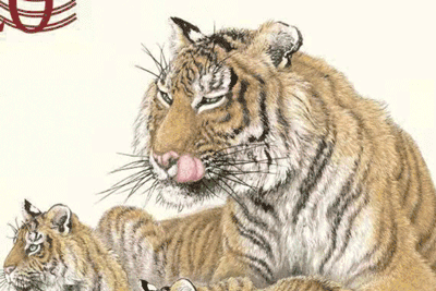 冯大中更开创了工笔虎技法,笔下的虎有骨、有肉、有神,连毛色光泽感也如有巧夺造化之功,堪称"前无古人,后启来者"。