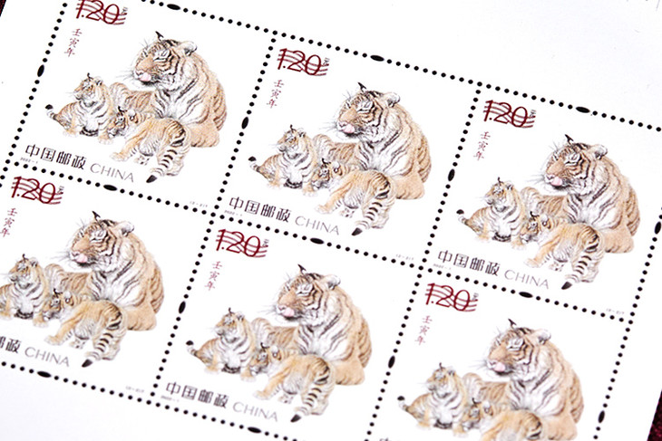 邮票上的老虎威中不失仁厚,毛发清晰可见,神态沉稳,于高山上矗立远眺,“显大国之风”。