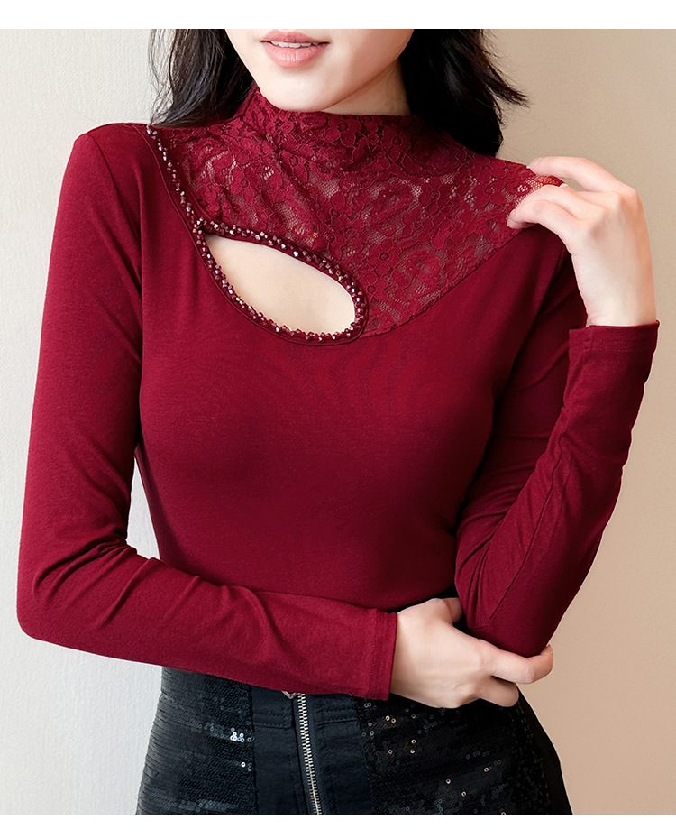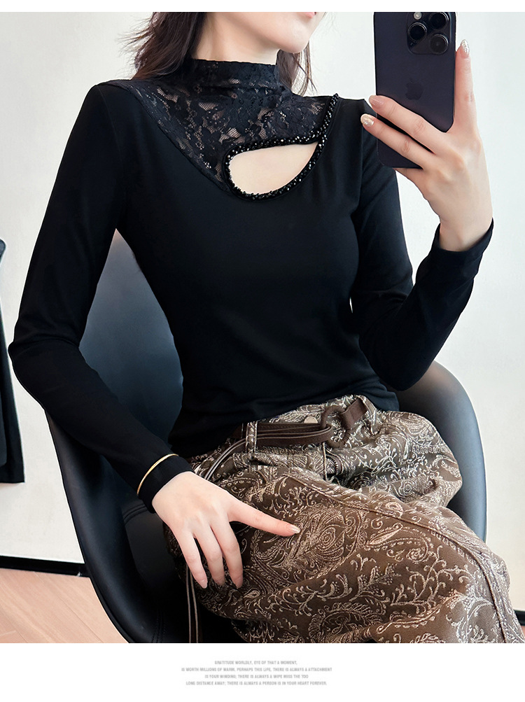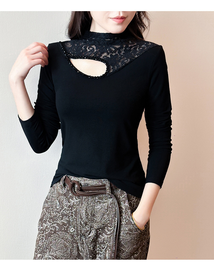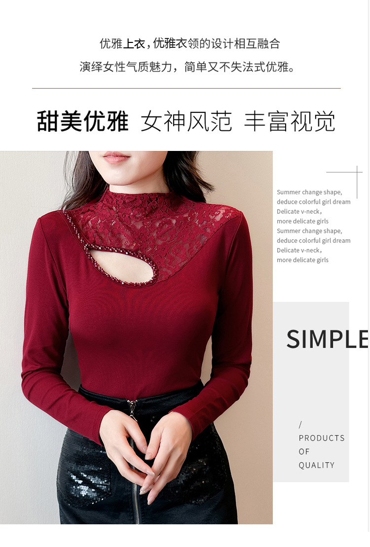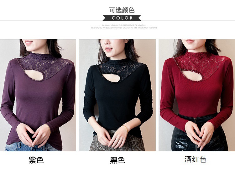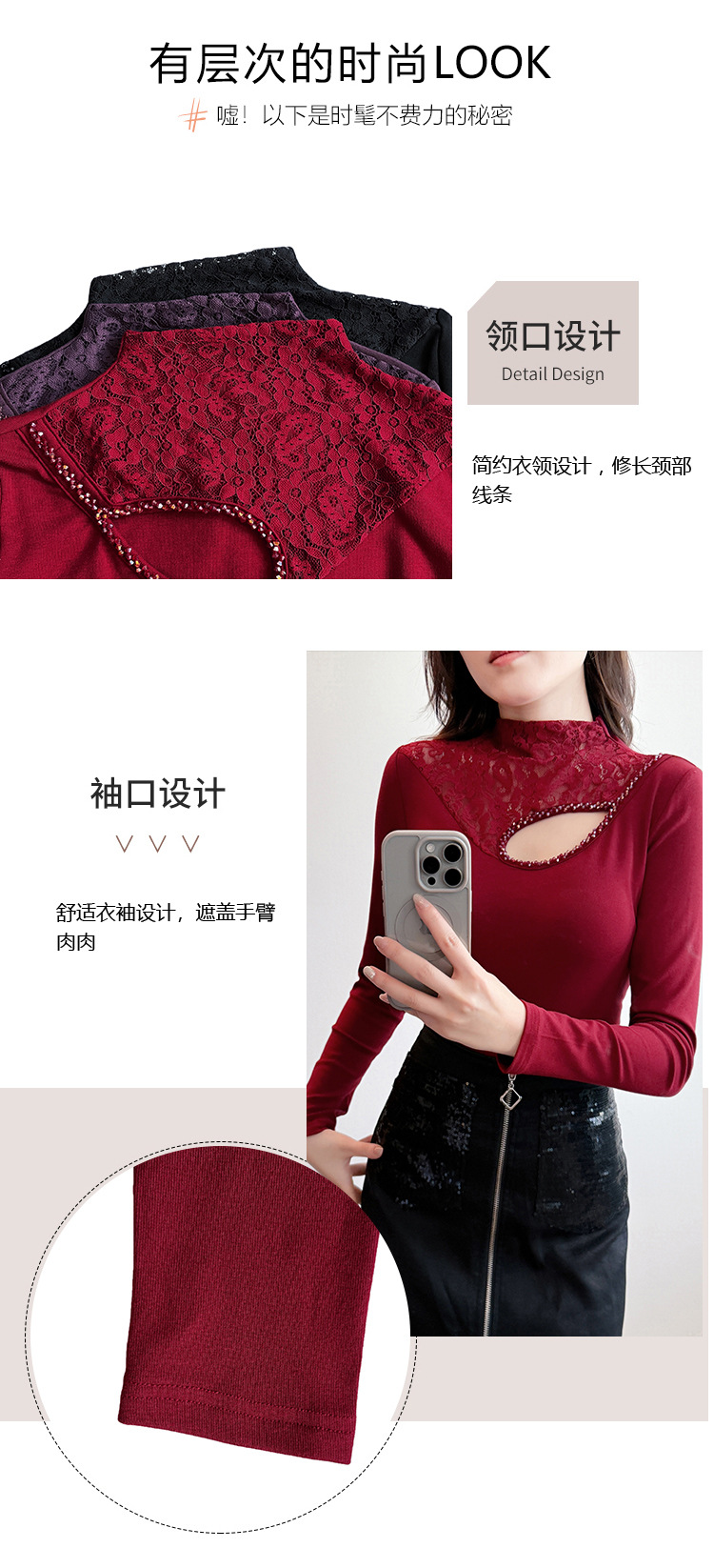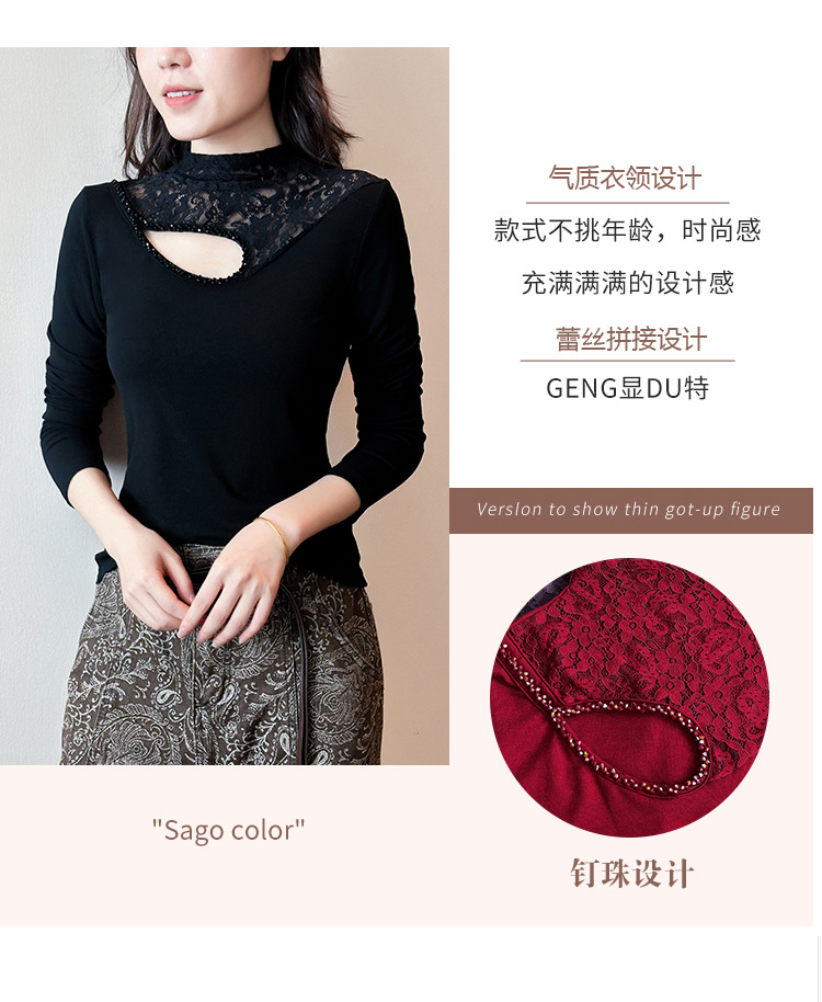 KQL 359H8362加厚磨毛蕾丝拼接半高领长袖订珠t恤修身打底衫
