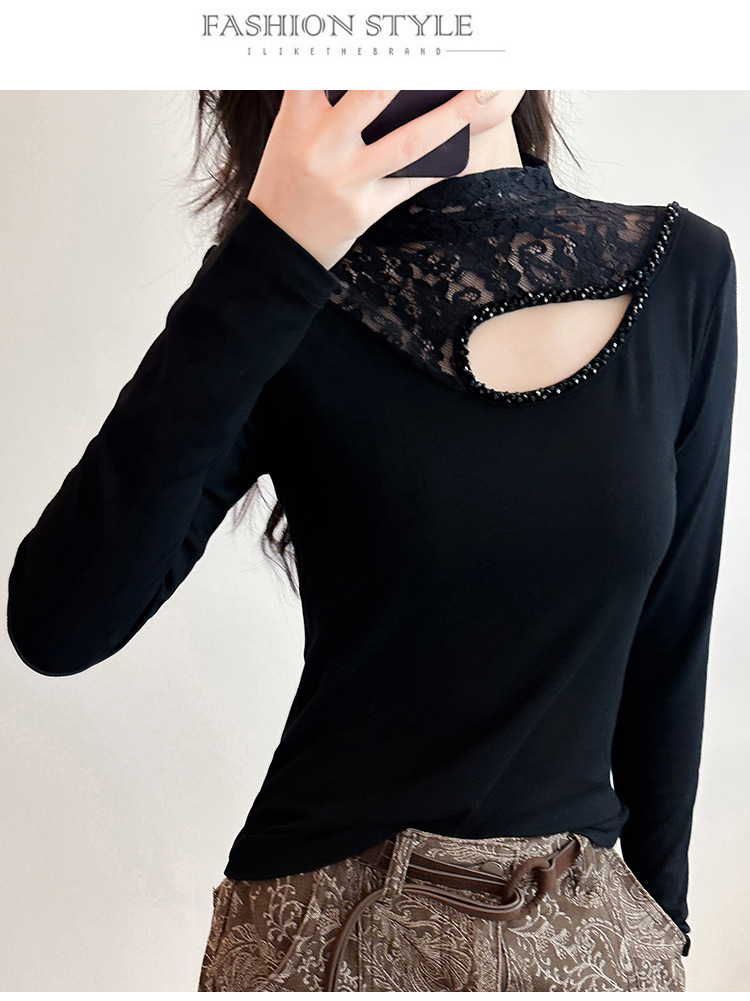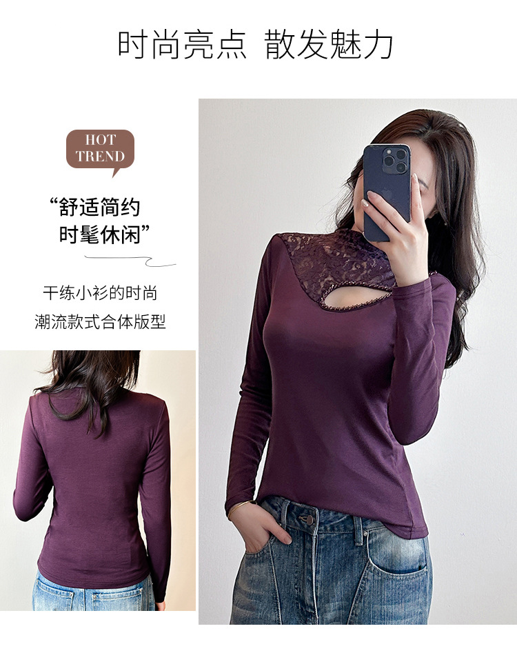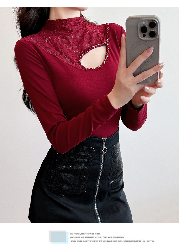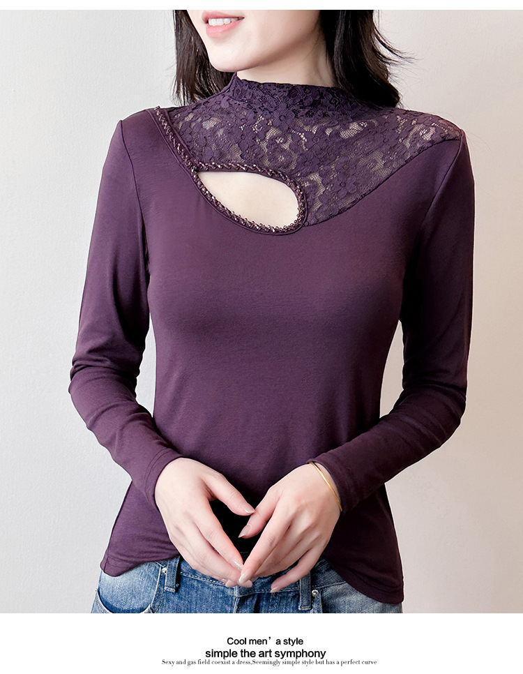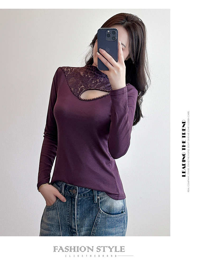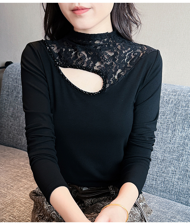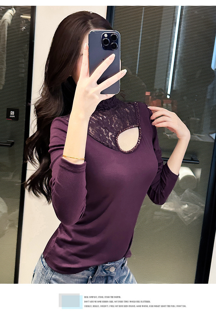 KQL 359H8362加厚磨毛蕾丝拼接半高领长袖订珠t恤修身打底衫